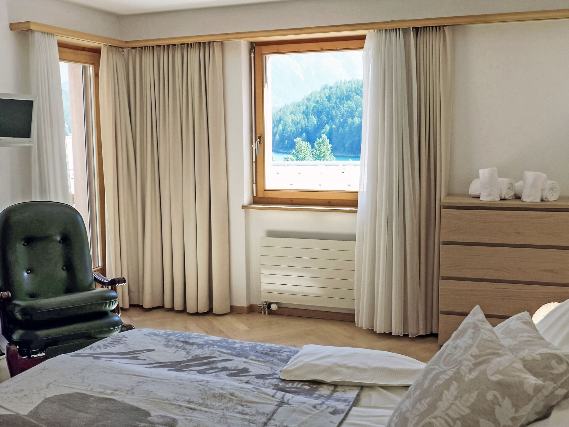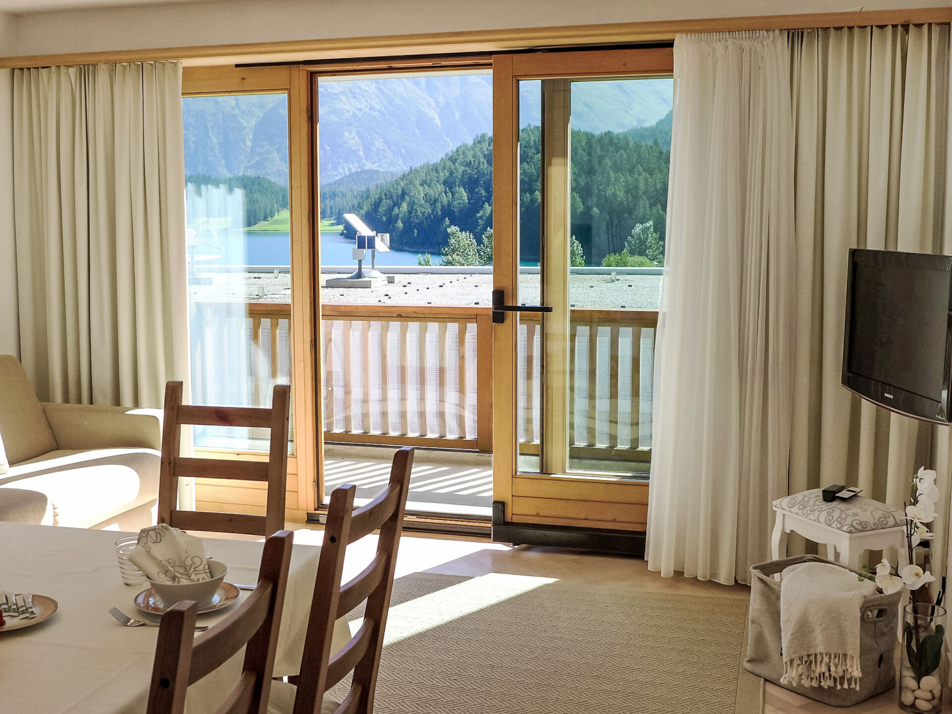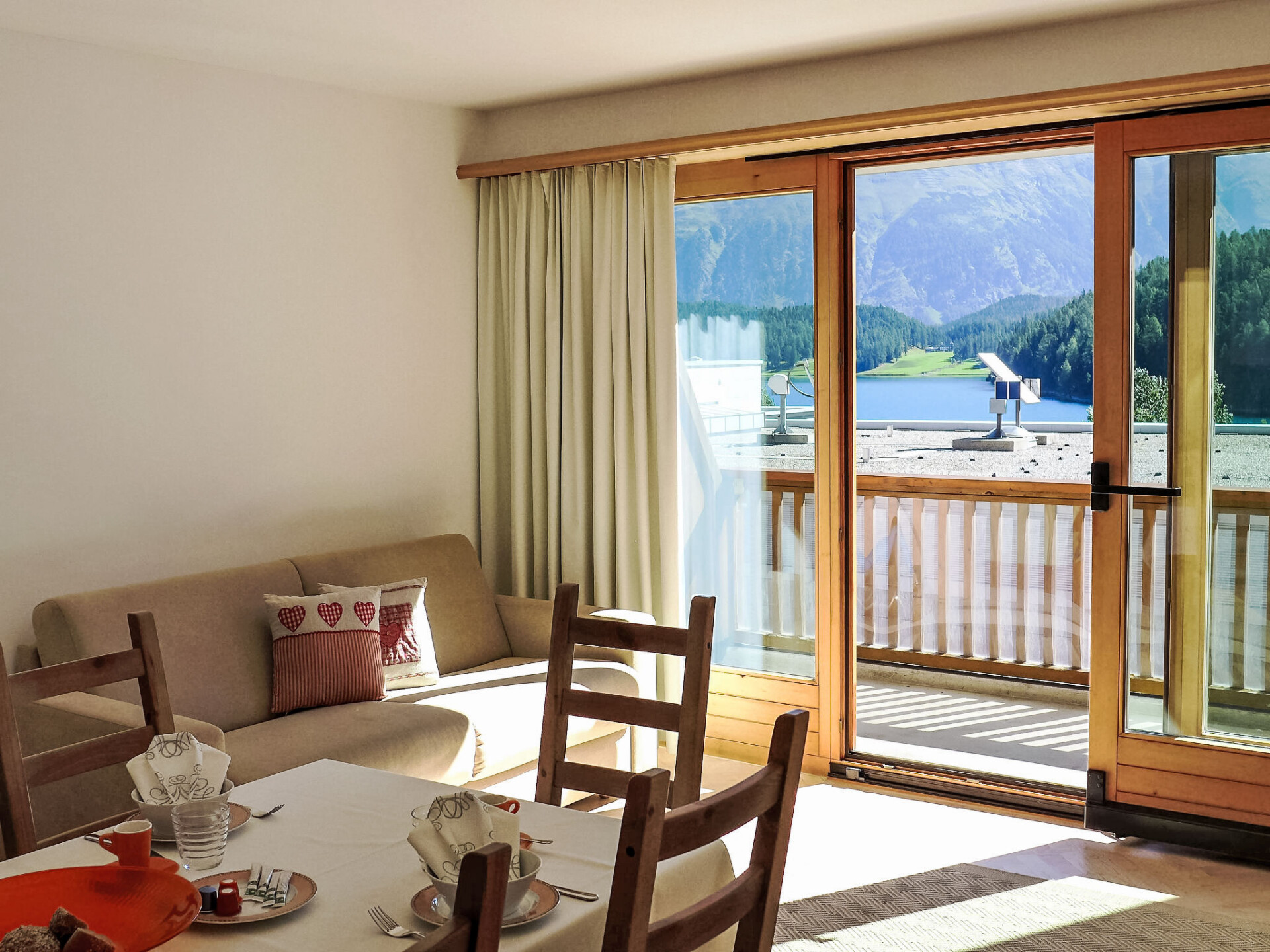 "Chesa Sur Ova 21", appartement 2-kamers 65 m2 op de 3e verdieping. Licht, gedeeltelijk gerenoveerd in 2017, comfortabel en modern ingericht: open woon-/eetkamer met 1 opklapbed (90 cm, lengte 200 cm), eettafel en TV (Flatscreen TV). Uitgang naar het balkon, op het oosten. 1 2-pers. kamer met 1 2-pers bed (1 x 160 cm, lengte 200 cm), bad/WC. Uitgang naar het balkon. Open keuken (oven, afwasmachine, 4 keramische glas kookplaten, broodrooster, waterkoker, magnetron, elektrische koffiemachine, pads voor de koffiemachine (Nespresso) extra). Douche/WC. Verwarming. Parketvloeren. Balkonmeubilair. Uitzicht op het meer, de bergen en de plaats. Ter beschikking: strijkijzer, haardroger. Internet (WiFi, gratis). Garage nr. 5 op het terrein, hoogte 200 cm, breedte 230 cm. Geschikt voor families woning aan de straatzijde. Niet rokers woning, rookvrij huis.