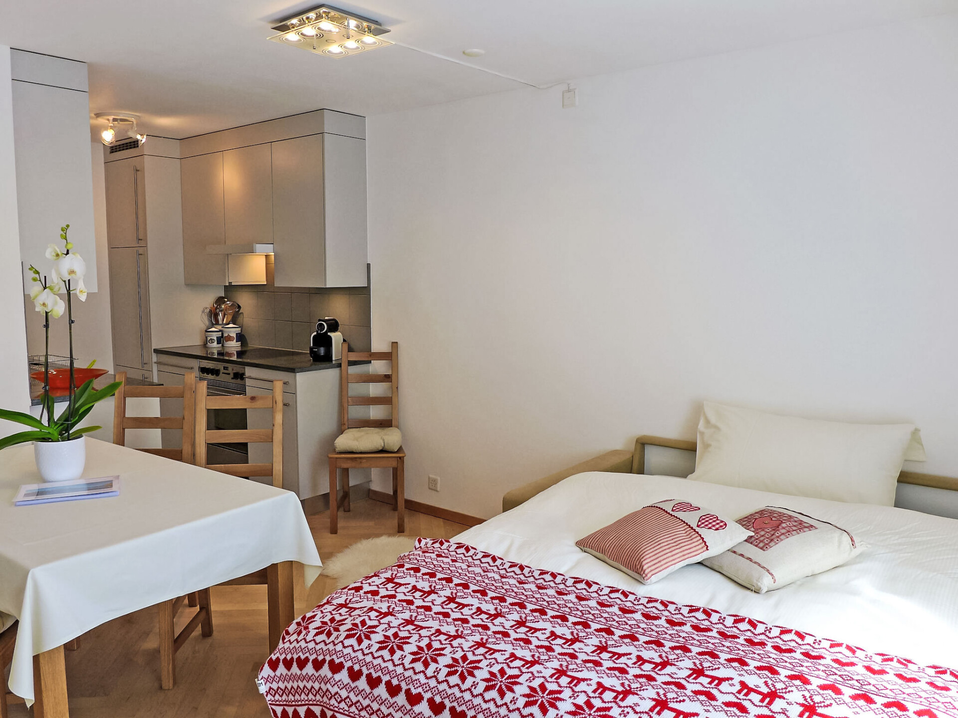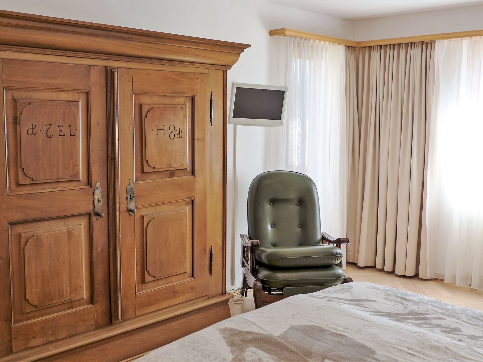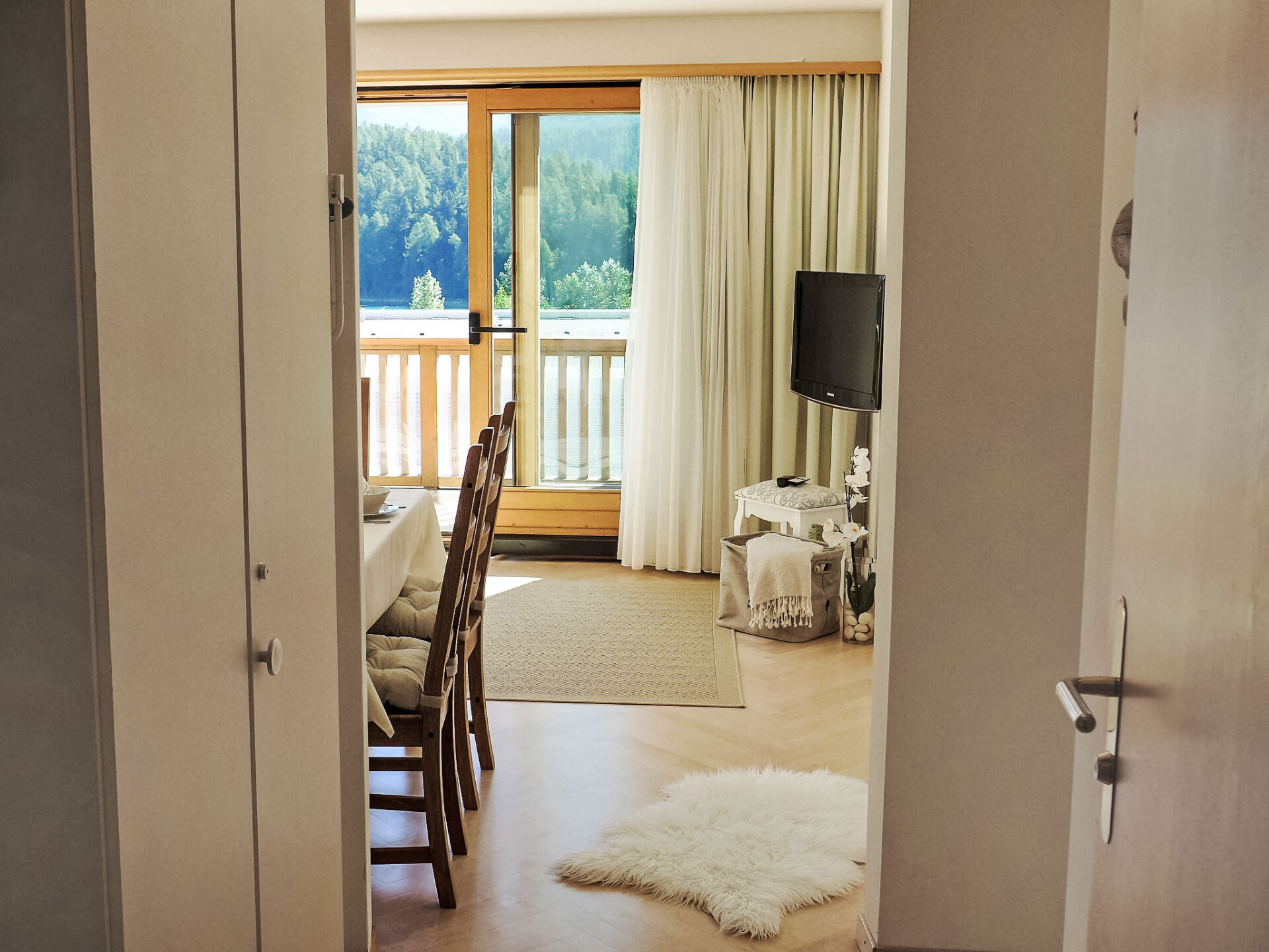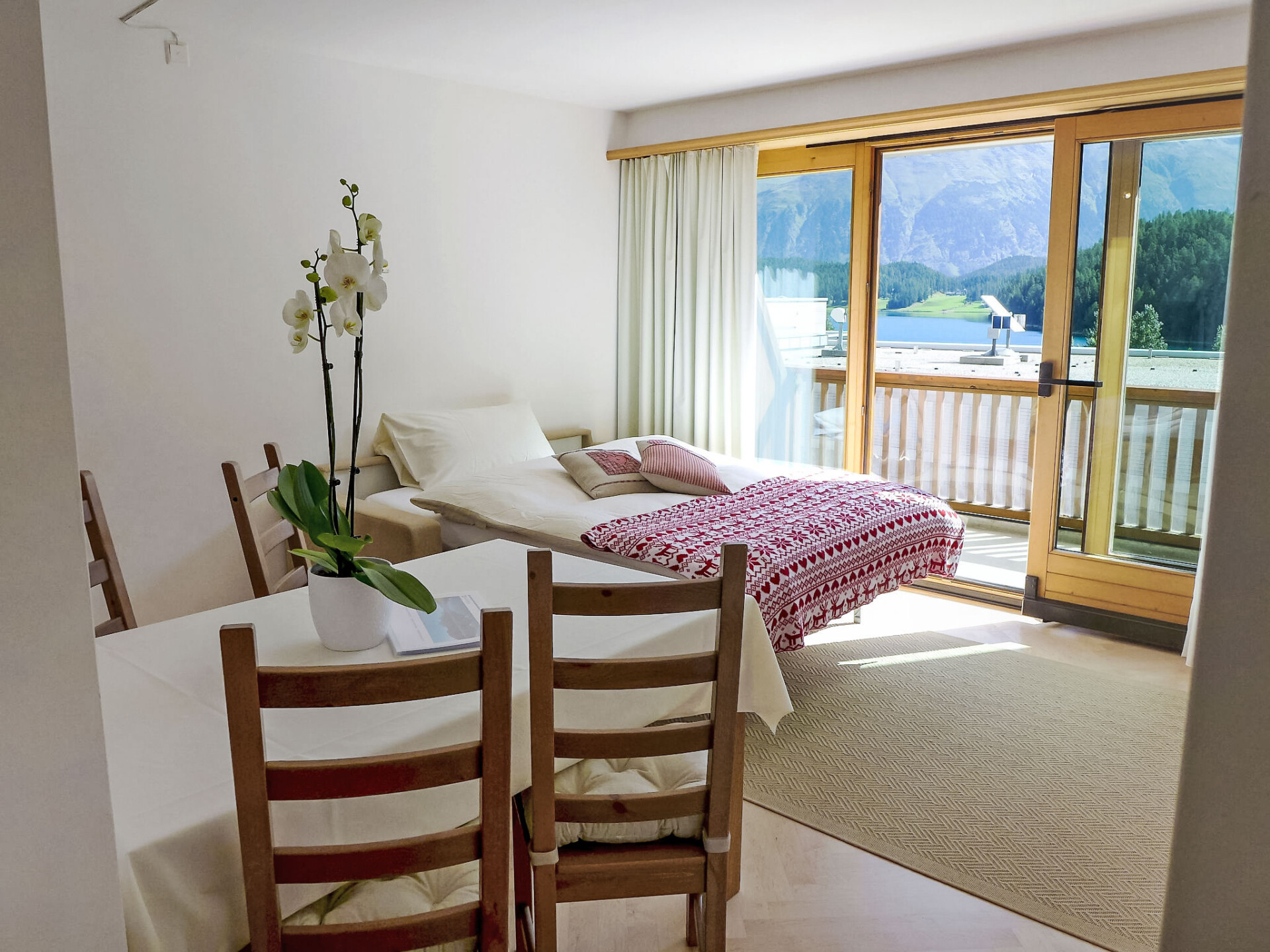 "Chesa Sur Ova 21", appartement 2-kamers 65 m2 op de 3e verdieping. Licht, gedeeltelijk gerenoveerd in 2017, comfortabel en modern ingericht: open woon-/eetkamer met 1 opklapbed (90 cm, lengte 200 cm), eettafel en TV (Flatscreen TV). Uitgang naar het balkon, op het oosten. 1 2-pers. kamer met 1 2-pers bed (1 x 160 cm, lengte 200 cm), bad/WC. Uitgang naar het balkon. Open keuken (oven, afwasmachine, 4 keramische glas kookplaten, broodrooster, waterkoker, magnetron, elektrische koffiemachine, pads voor de koffiemachine (Nespresso) extra). Douche/WC. Verwarming. Parketvloeren. Balkonmeubilair. Uitzicht op het meer, de bergen en de plaats. Ter beschikking: strijkijzer, haardroger. Internet (WiFi, gratis). Garage nr. 5 op het terrein, hoogte 200 cm, breedte 230 cm. Geschikt voor families woning aan de straatzijde. Niet rokers woning, rookvrij huis.