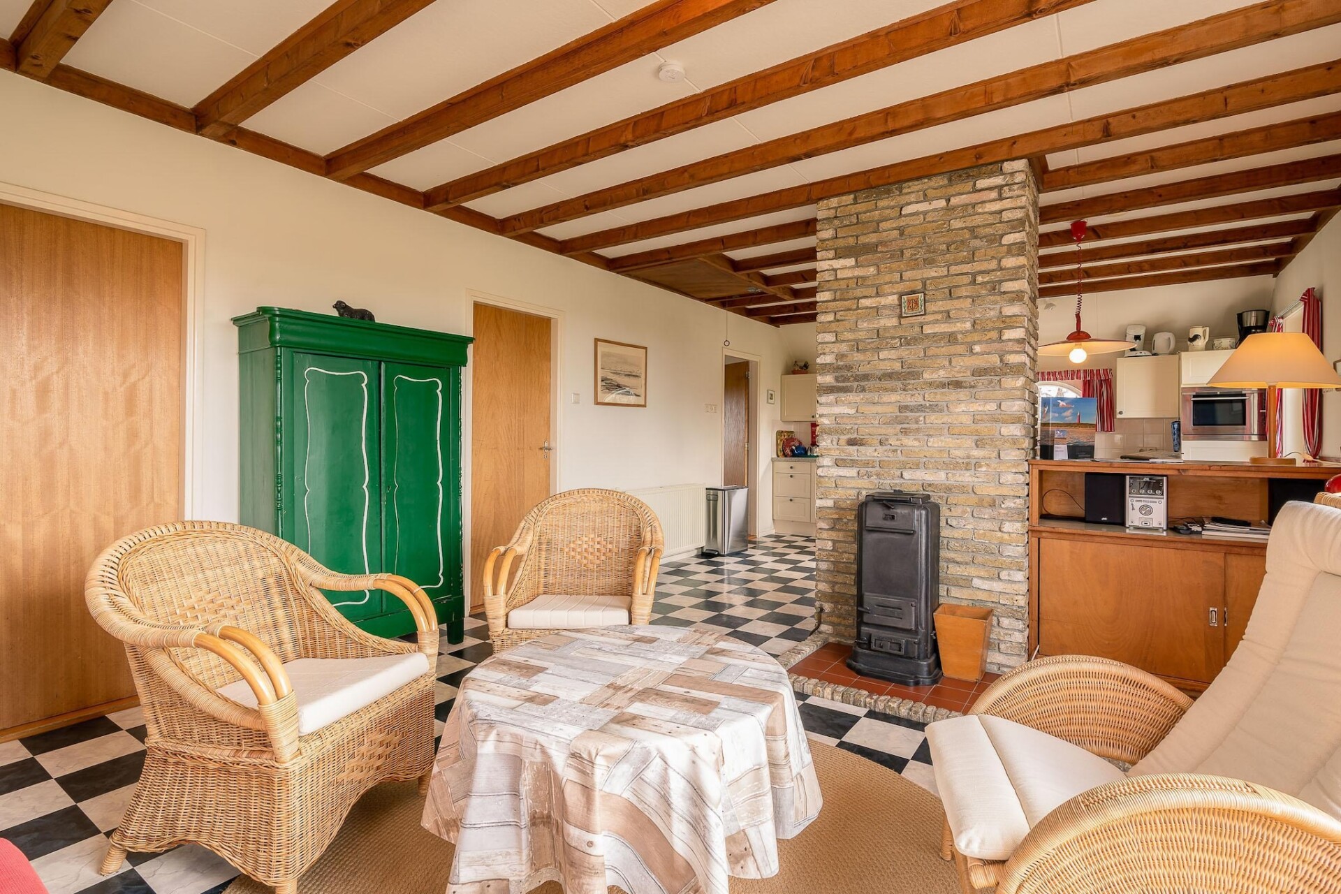 Er is een nette open keuken met o.a. een combimagnetron en verschillende koffiezetapparaten. Tevens vindt je hier een eethoek met eettafel voor 4 personen.
