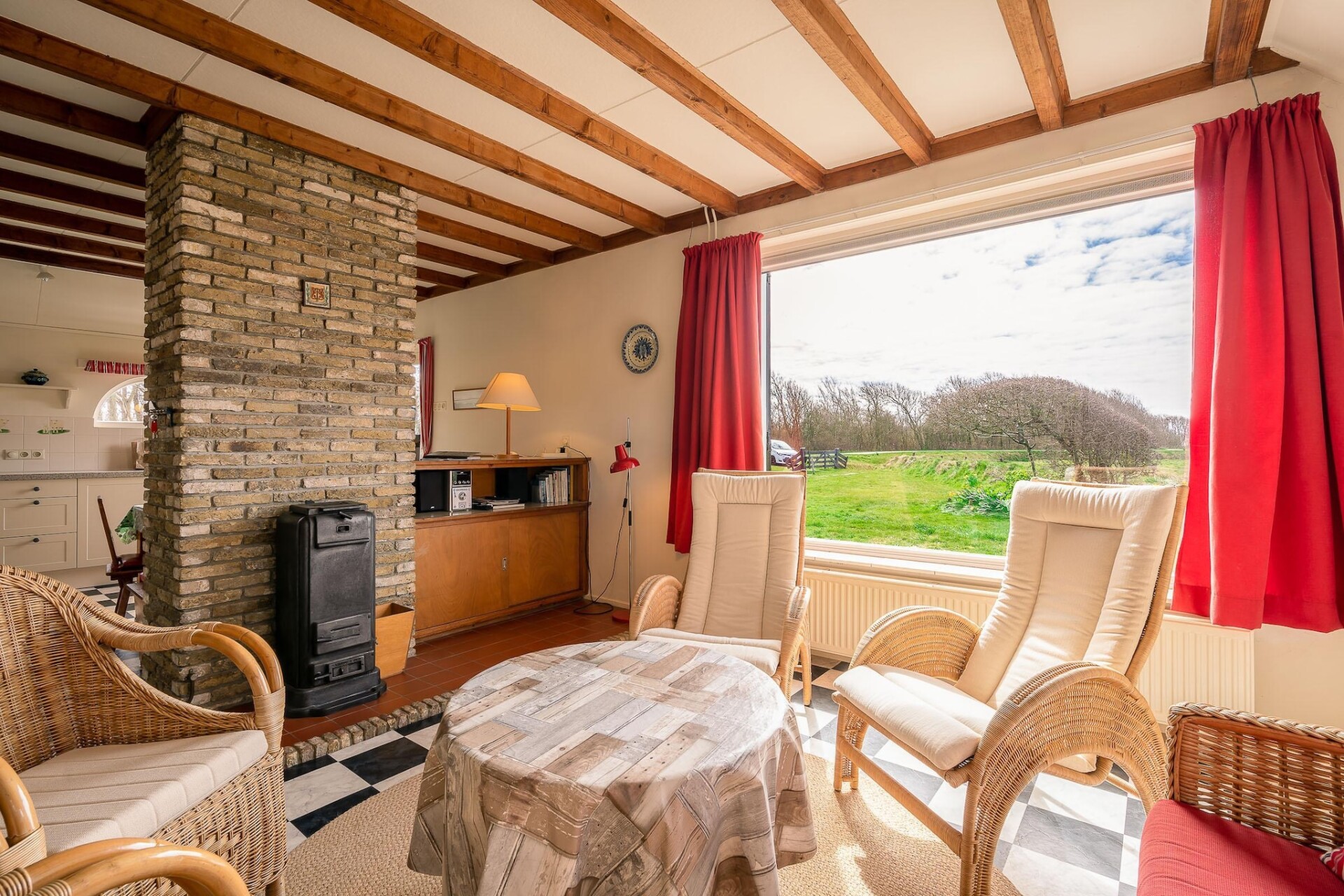 Wanneer je binnenkomt in de schapenboet kom je in de ruime woonkamer met zithoek en tv. Wanneer je hier zit heb je een prachtig uitzicht over de schapenweide en landerijen.