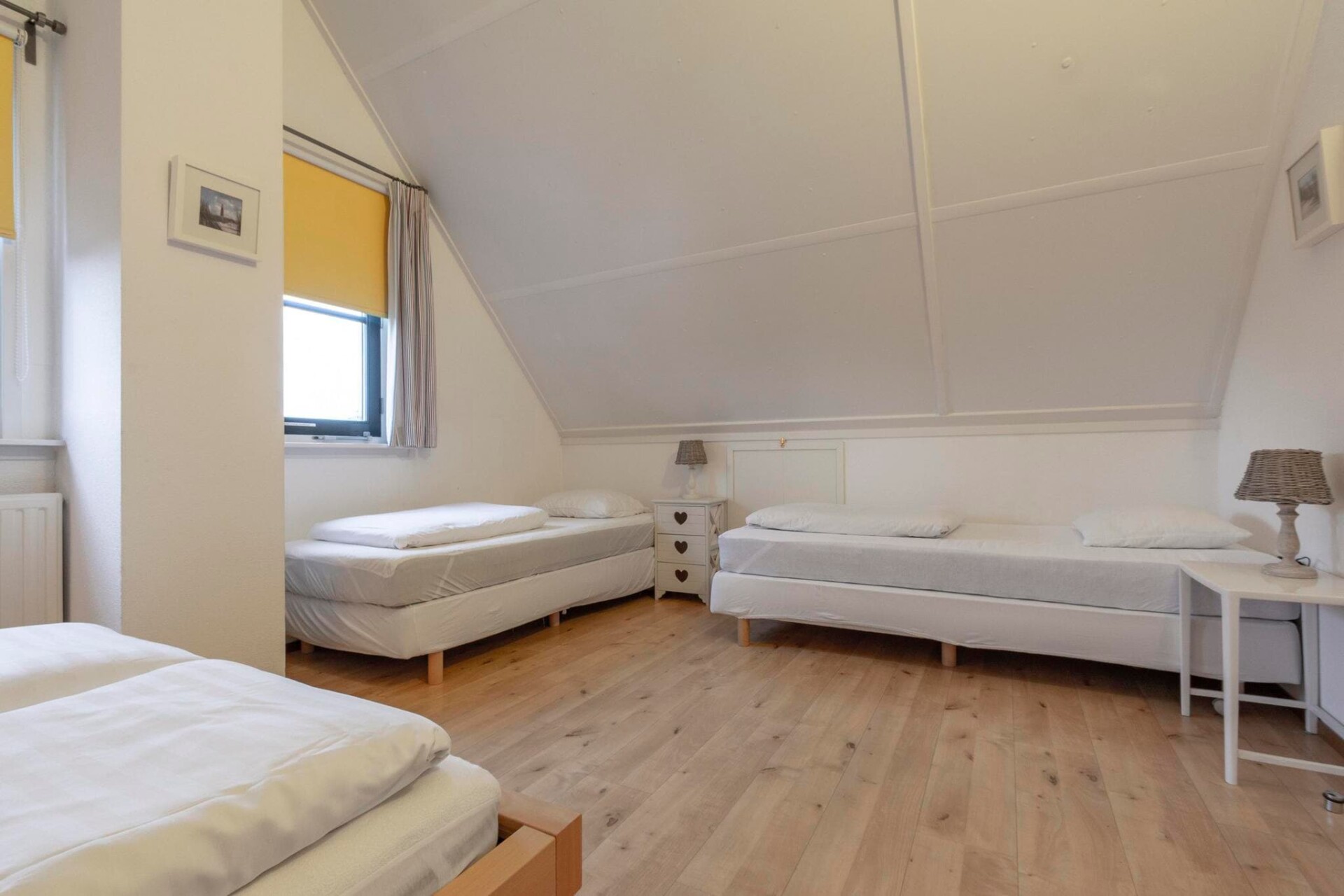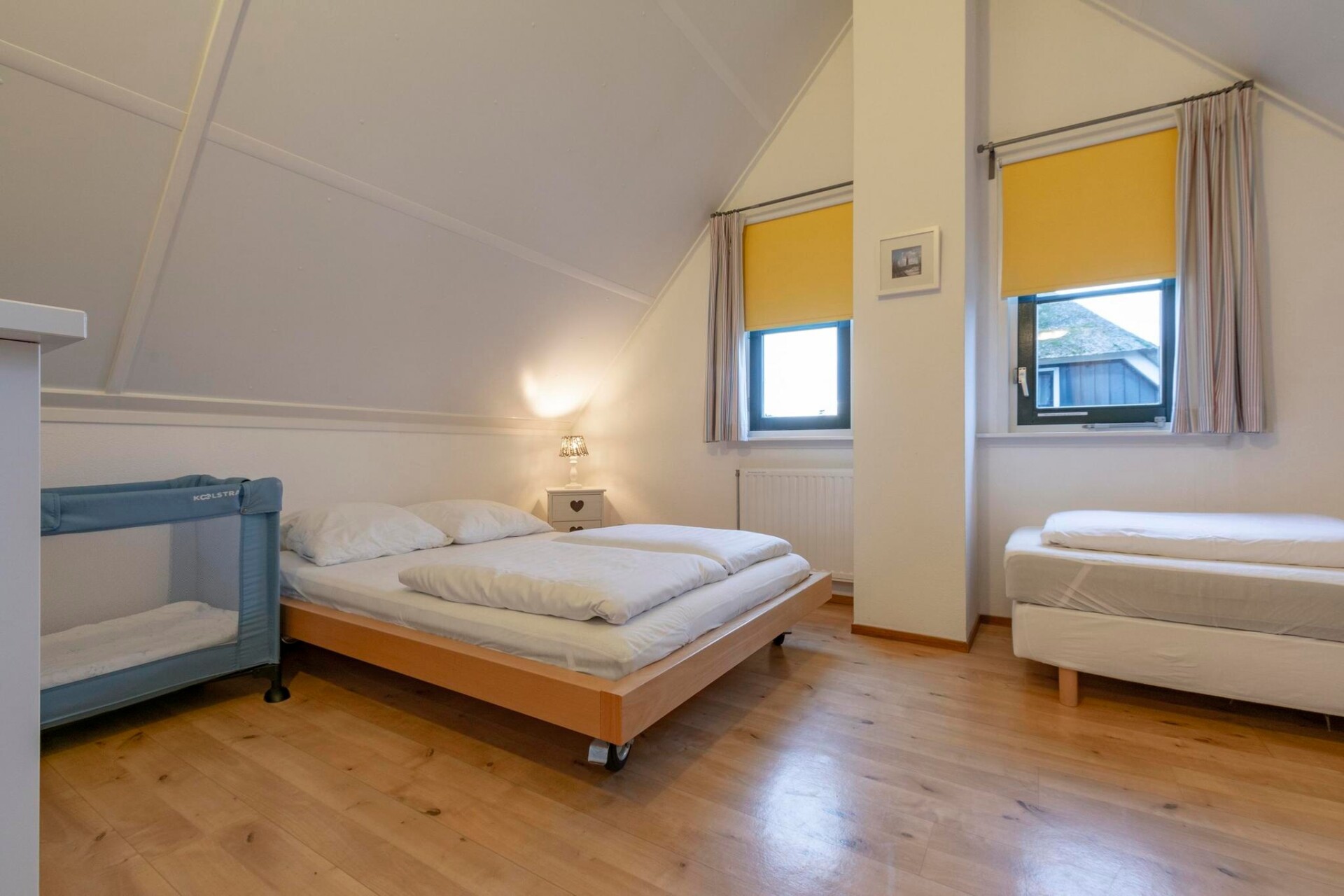 Boven zorgen twee lichte slaapkamers voor een goede nachtrust en een rustig begin van elke dag. Er is een kinderbedje beschikbaar voor kleine reizigers en de grote badkamer is voorzien van zowel een douche als een bad, ideaal om te ontspannen na een dag in de duinen. Buiten biedt het terras op het zuiden ruimte om tot rust te komen.