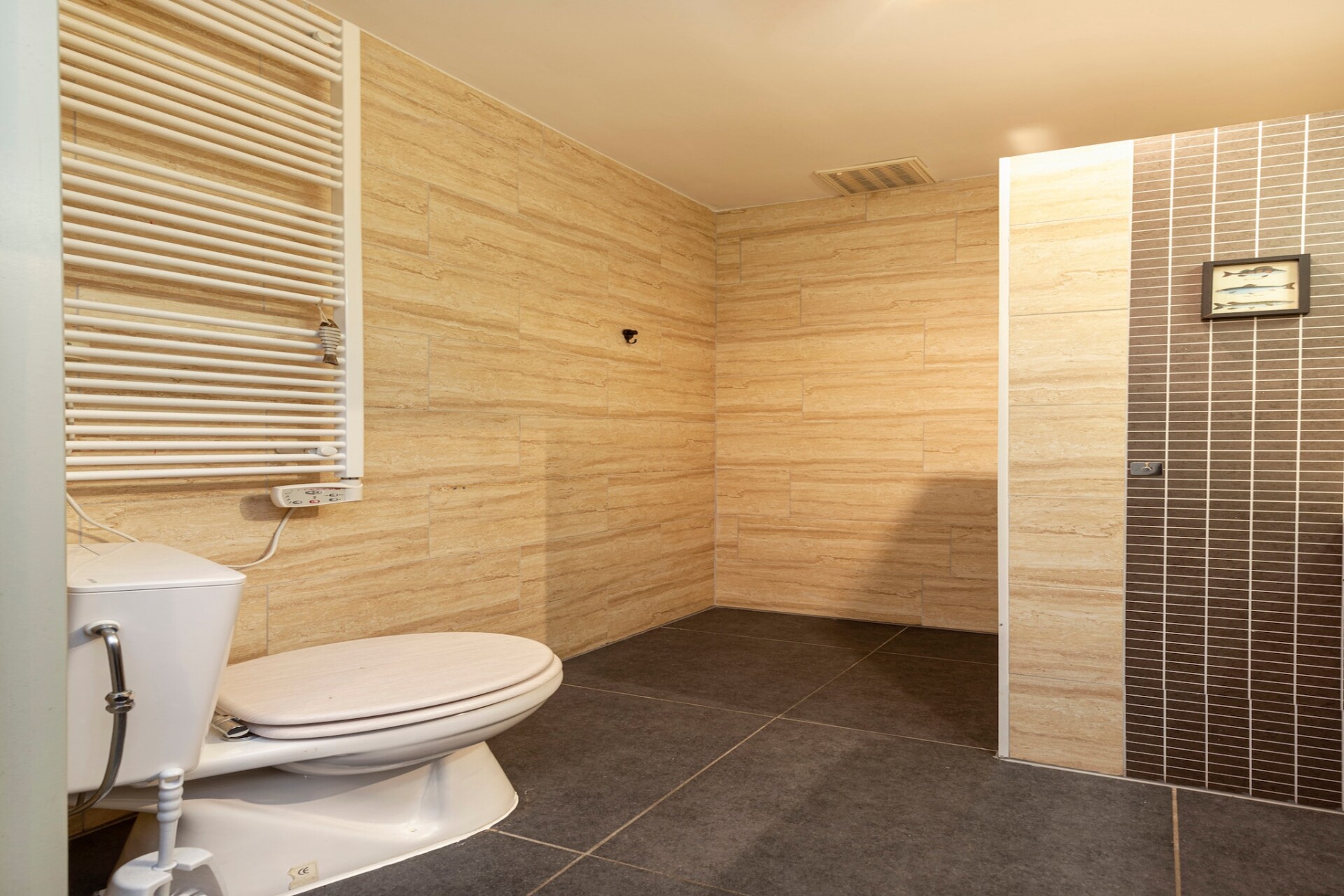 De badkamer is zorgvuldig uitgerust met een douche, toilet, wastafel en een spiegelkast, en biedt alle essentiële gemakken voor een comfortabel verblijf.