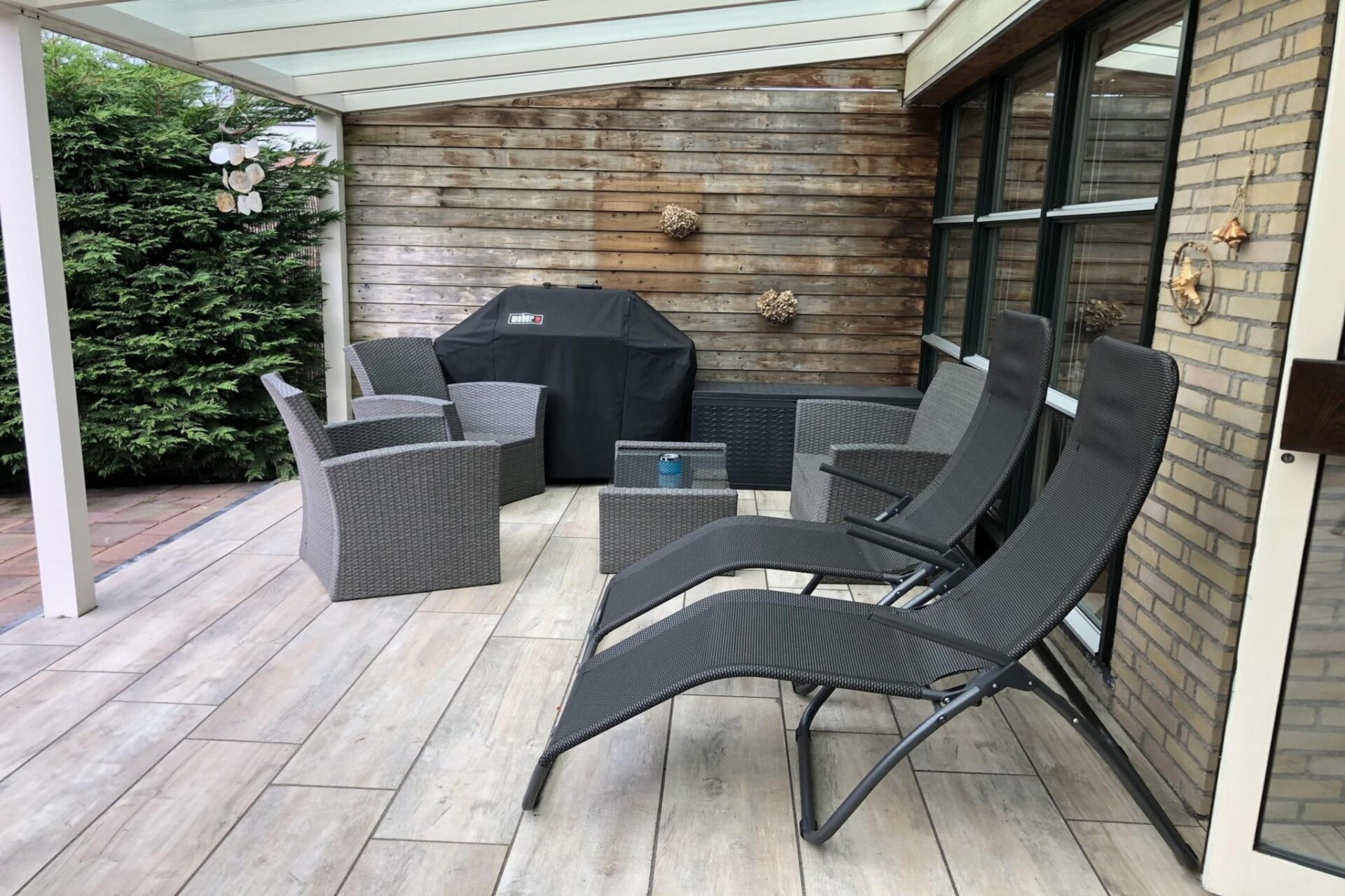 Buiten vindt u een omheinde privétuin met een groot overdekt terras, waar u bij elk weer kunt ontspannen. Comfortabel tuinmeubilair en een loungeset nodigen u uit om te ontspannen, buiten te eten of gewoon te genieten van de rust. Honden zijn hier meer dan welkom, met doordachte voorzieningen zoals manden, voerbakken en zelfs een fietskar voor viervoeters. Met het verzorgde interieur, de praktische extra's en de gezellige charme is dit een plek waar u zich direct thuis voelt en vanaf het eerste moment kunt genieten van een ontspannen vakantie.