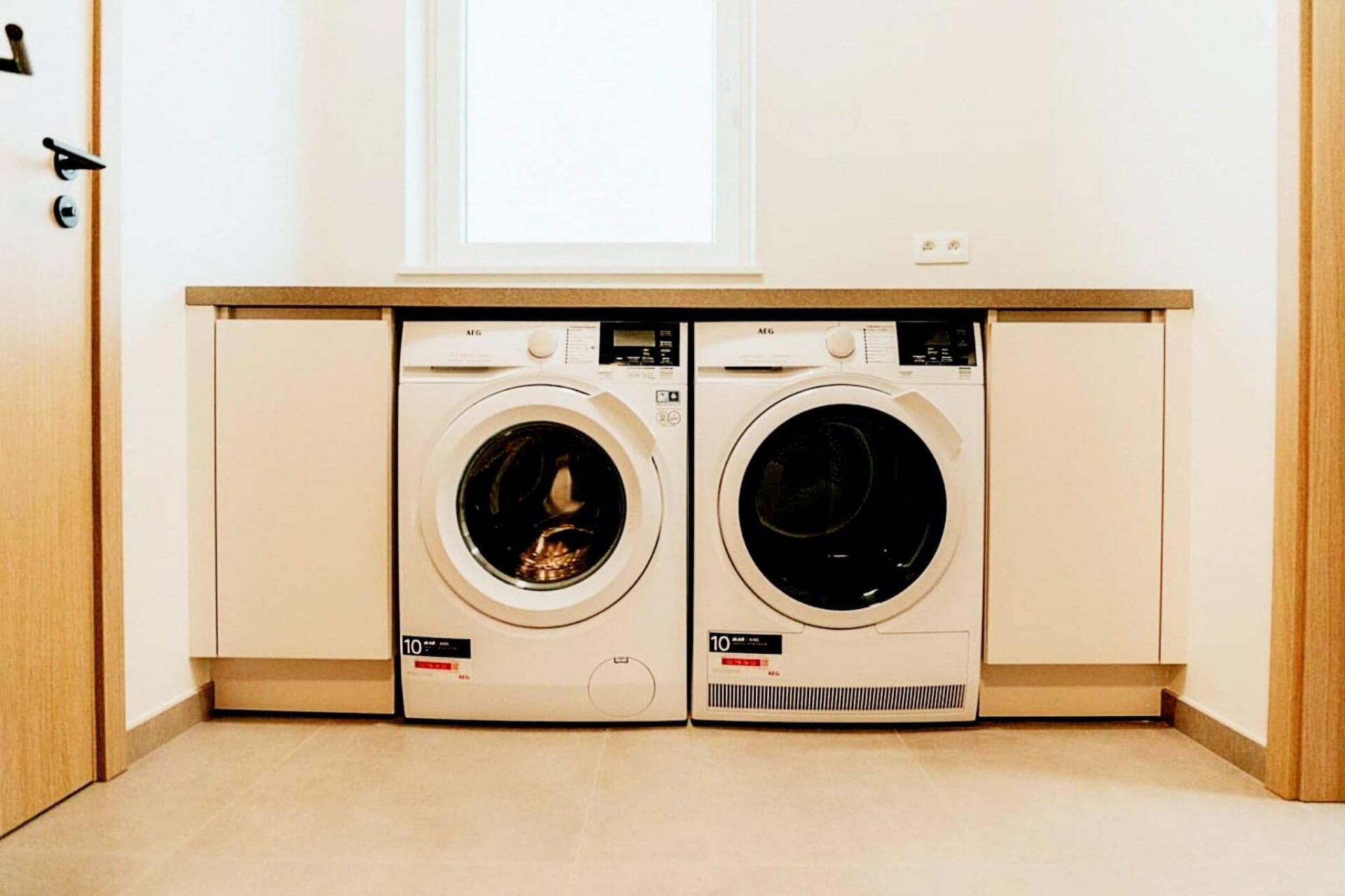 De leefruimte is ingericht met een ruime tafel en een gezellige zithoek met een Smart TV. De volledig uitgeruste keuken beschikt over een oven, magnetron, koelkast, vaatwasmachine en elektrisch fornuis, evenals al het benodigde kook- en keukengerei. Een bijkeuken biedt extra bergruimte en is voorzien van een koelkast, diepvries, wasmachine en droger.