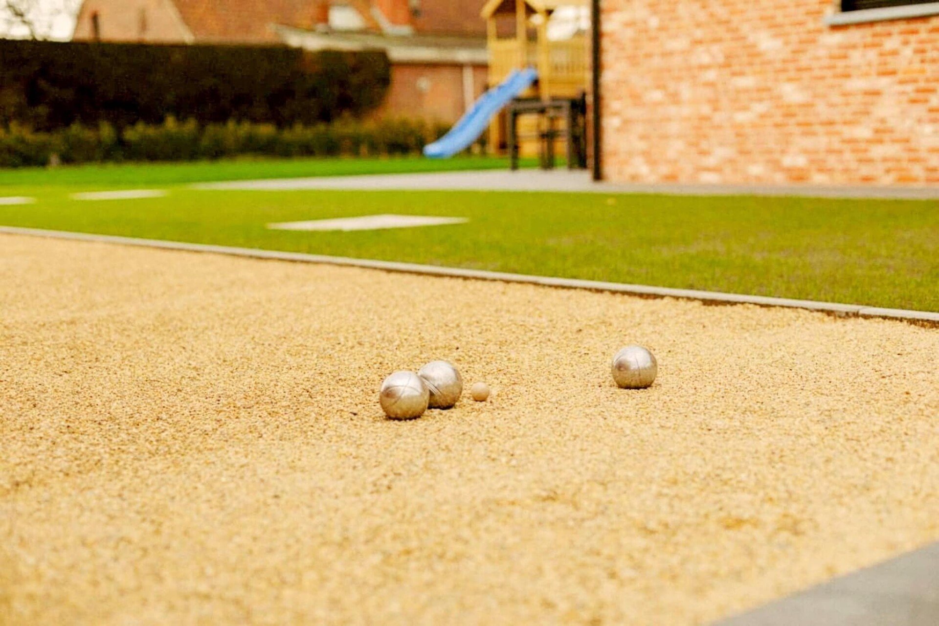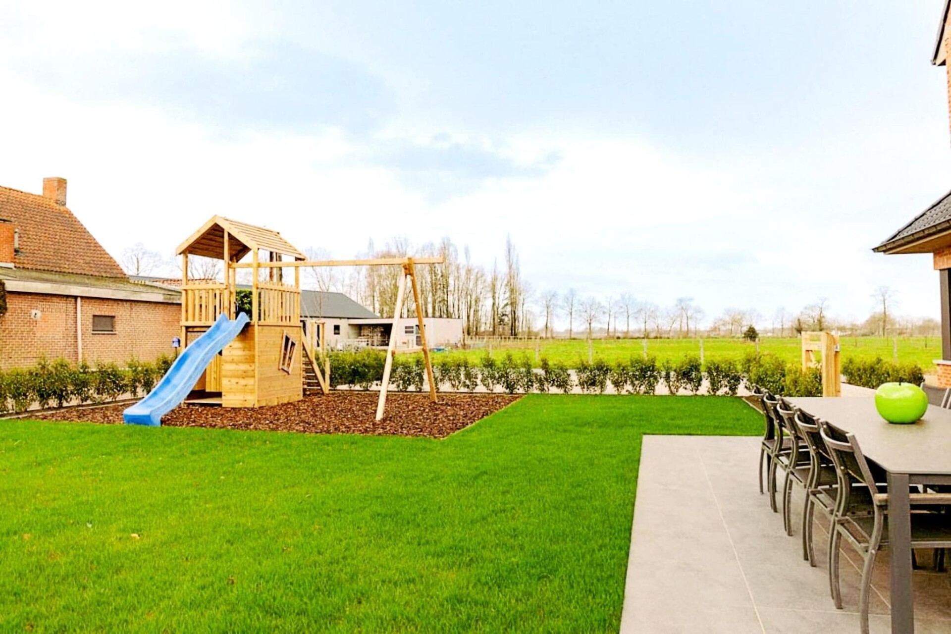 Buiten geniet je van de tuin met barbecue, een ruime buitentafel, een zithoek met rieten kuipzetels, een speeltuin en een groot grasveld om te ravotten, evenals een petanqueveld. In het bijgebouw vind je ontspanningsfaciliteiten zoals een kicker- en pooltafel, kubbspel en dartsbord. Er is parking voorzien voor vijf auto’s.