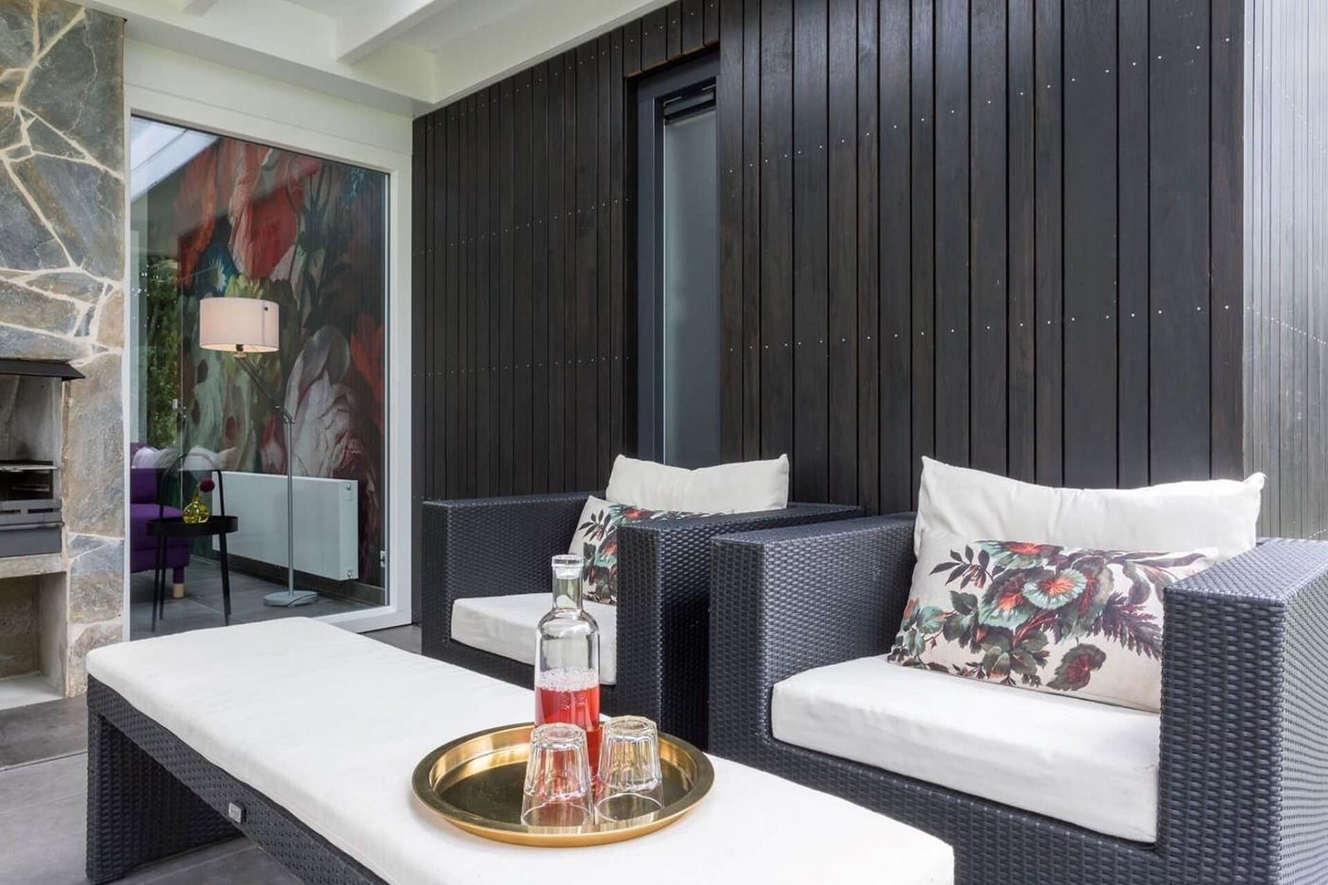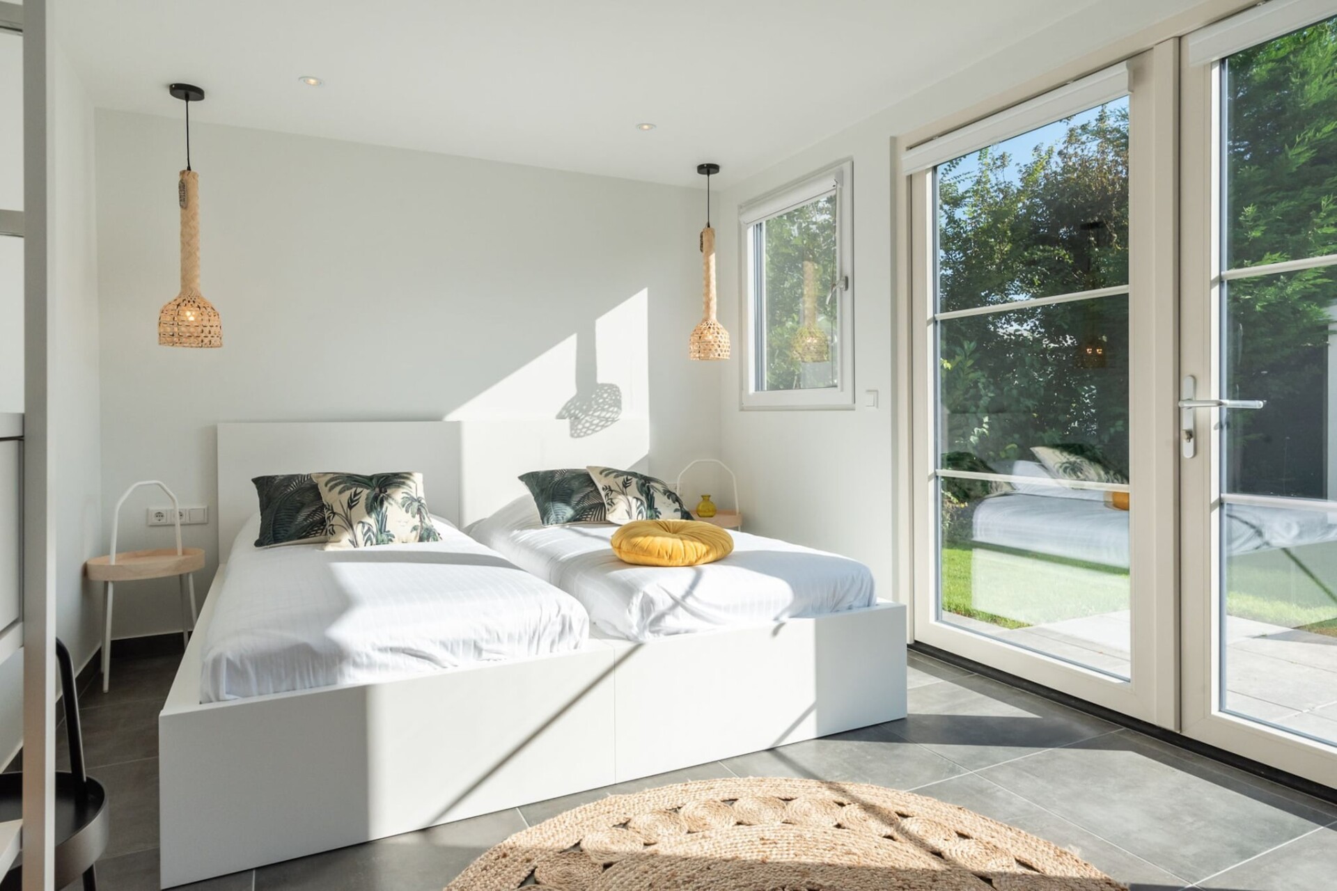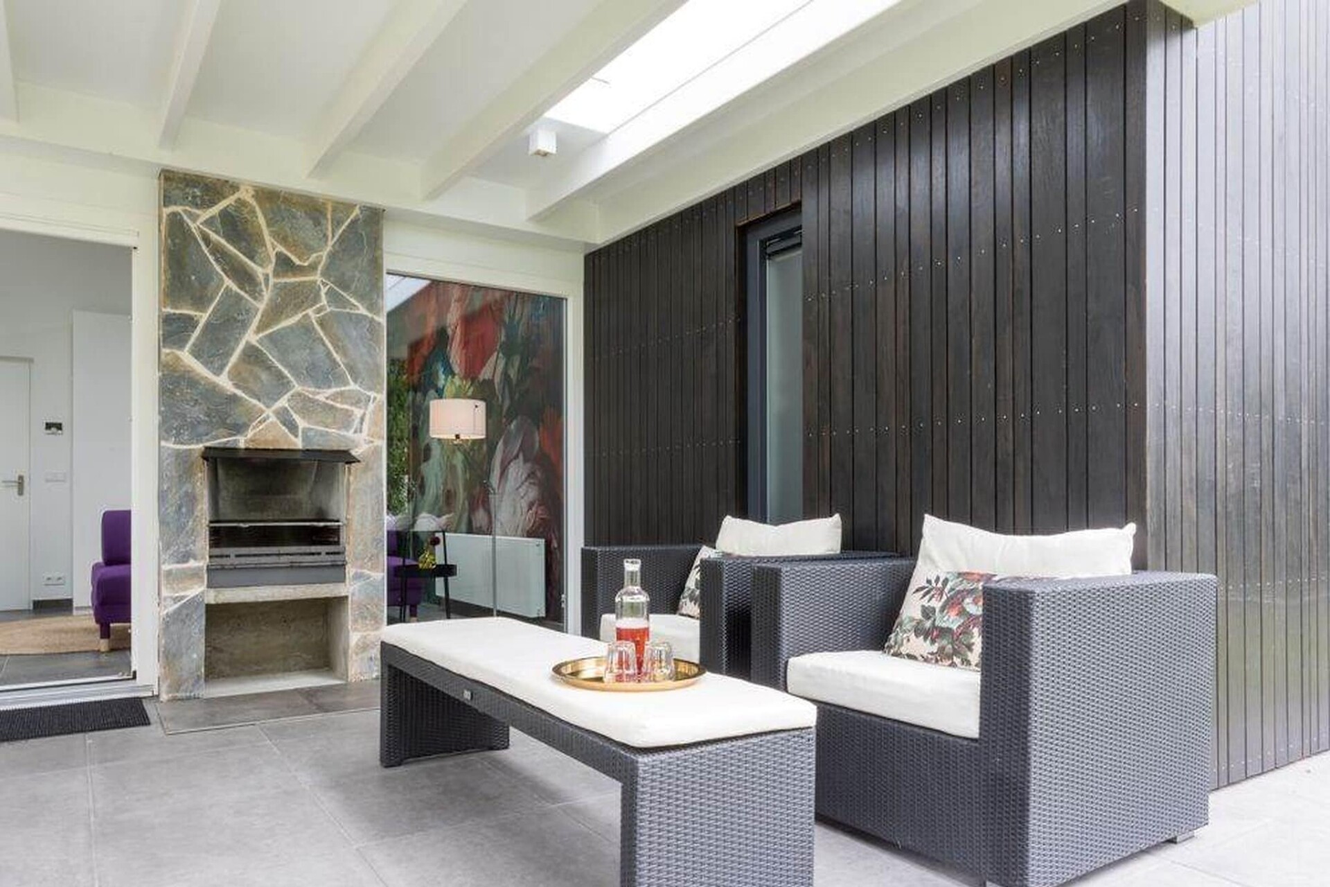 Op het terras staan 2 luxe fauteuils, een 6 persoons eettafel en er is een buitenhaard/ barbecue. In de tuin achter de woning zijn er 2 ligbedden en er is een trampoline. Daarnaast is er een buitendouche en in de voortuin staat er een picknicktafel. Je kunt je op iedere plek in de tuin heerlijk vermaken.