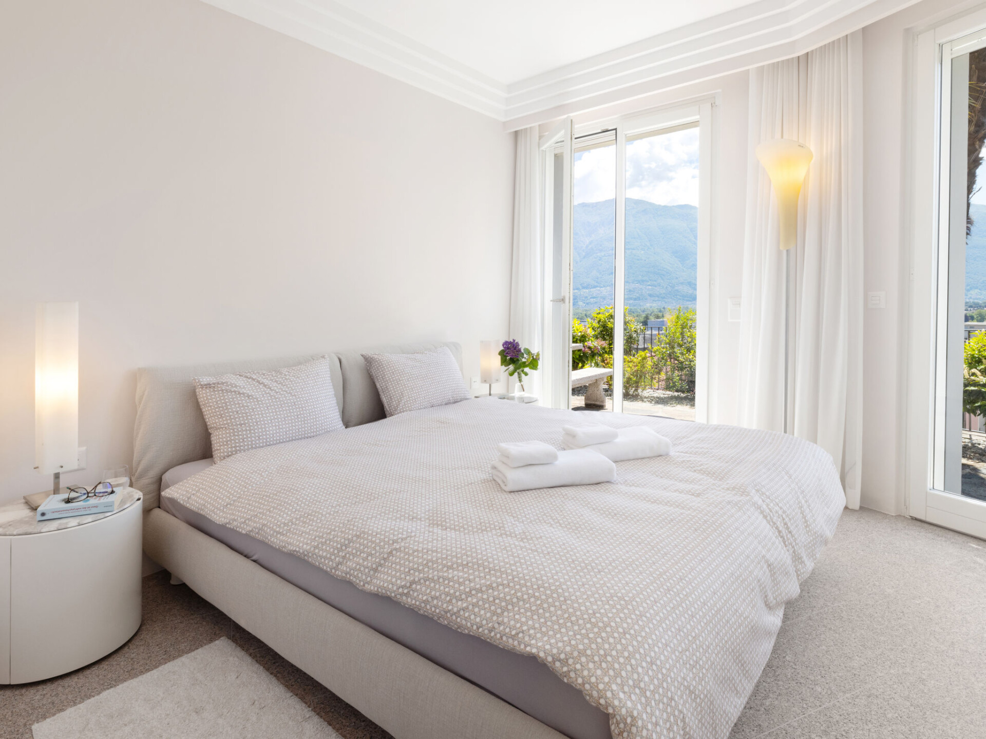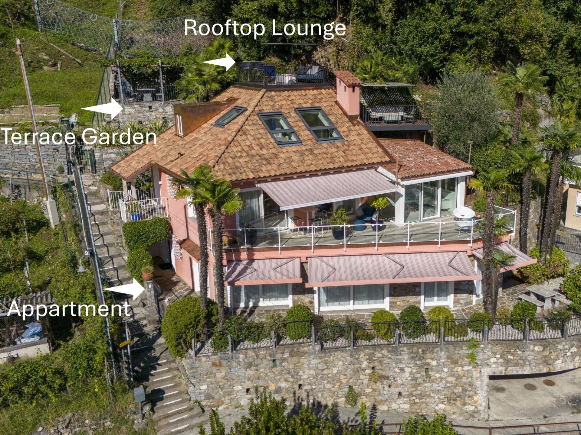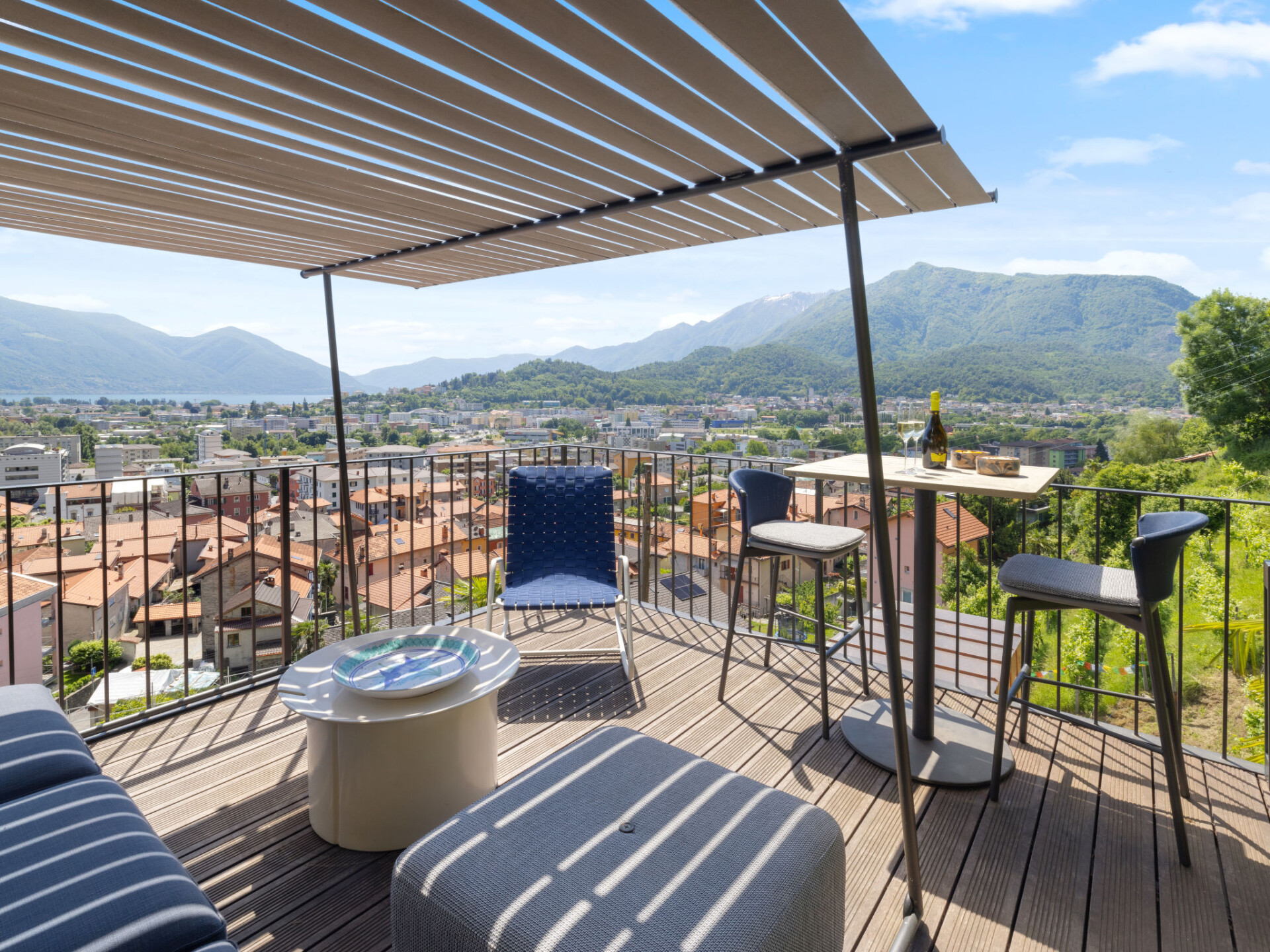 "Designer Ferienwohnung Il Soldunese", appartement 3-kamers 70 m2, op verhoogde begane grond, op het zuiden gelegen. Het objekt is geschikt voor 2 volwassenen + 2 kinderen. Licht, volledig gerenoveerd in 2025, comfortabel en luxueus ingericht: open woon-/eetkamer met 1 2-pers divanbed (2 x 90 cm, lengte 200 cm), internationale TV-zenders en Flatscreen TV. Uitgang naar het terras, naar de zitplaats in de tuin. 1 kamer met 1 2-pers bed (2 x 90 cm, lengte 200 cm). Uitgang naar het terras, op het zuiden. Open keuken (oven, afwasmachine, 4 keramische glas kookplaten, broodrooster, waterkoker, elektrische koffiemachine, pads voor de koffiemachine (Nespresso) extra). Uitgang naar het terras. Douche/WC, douche/bidet/WC. Air-conditioning, vloerverwarming. Verwarming alleen beschikbaar van 01.10. tot 30.04. Natuurstenen vloeren. Groot terras 40 m2, op het zuiden gelegen. Terrasmeubelen, balkonmeubilair. Mooi panoramazicht op het meer, het landschap en de plaats. Ter beschikking: wasmachine, kinderbed tot 2 jaar (extra), haardroger. Internet (WiFi, gratis, Bandbreedte: 200 Mbit/s). Niet rokers woning. NL-00012453