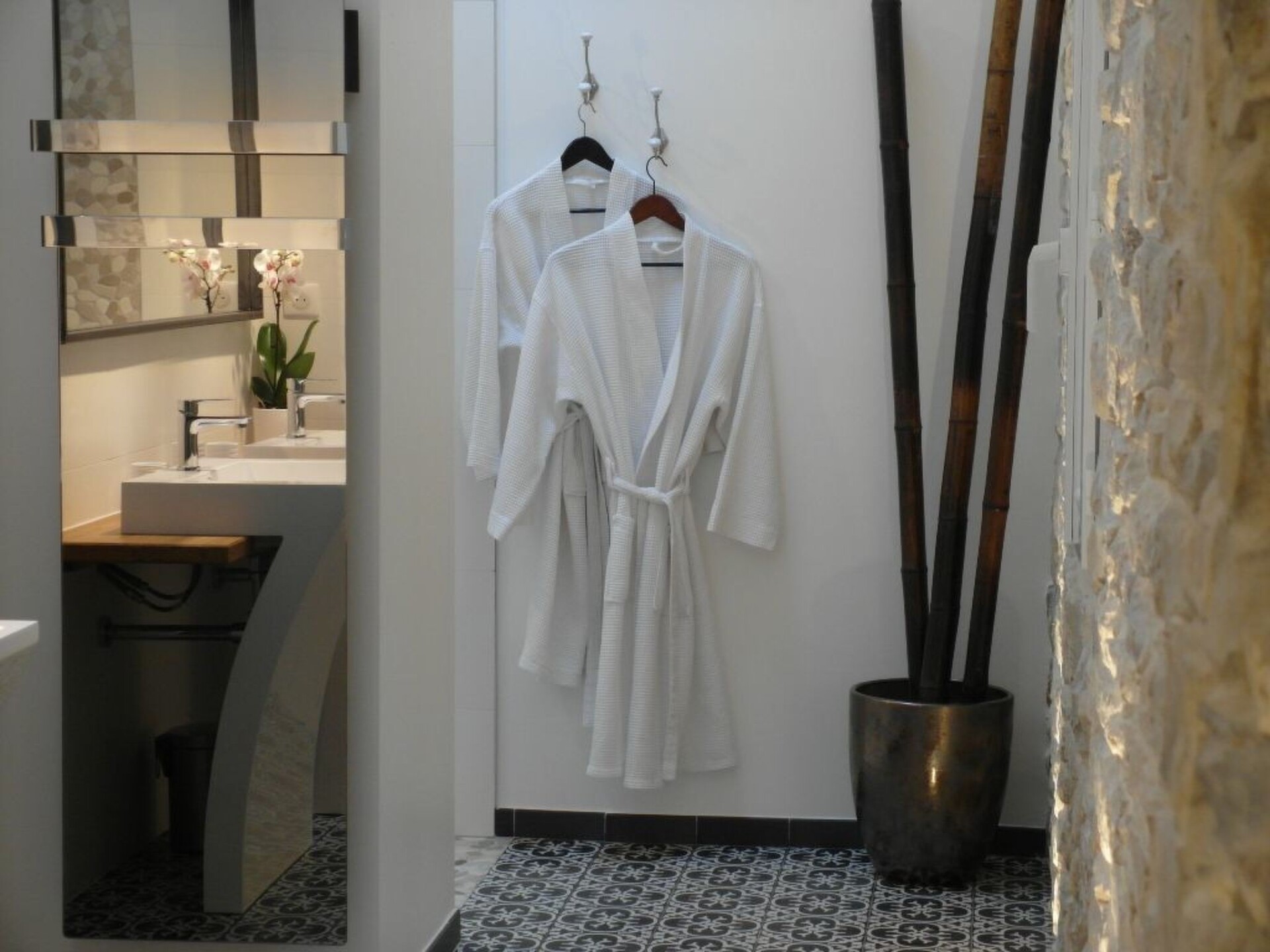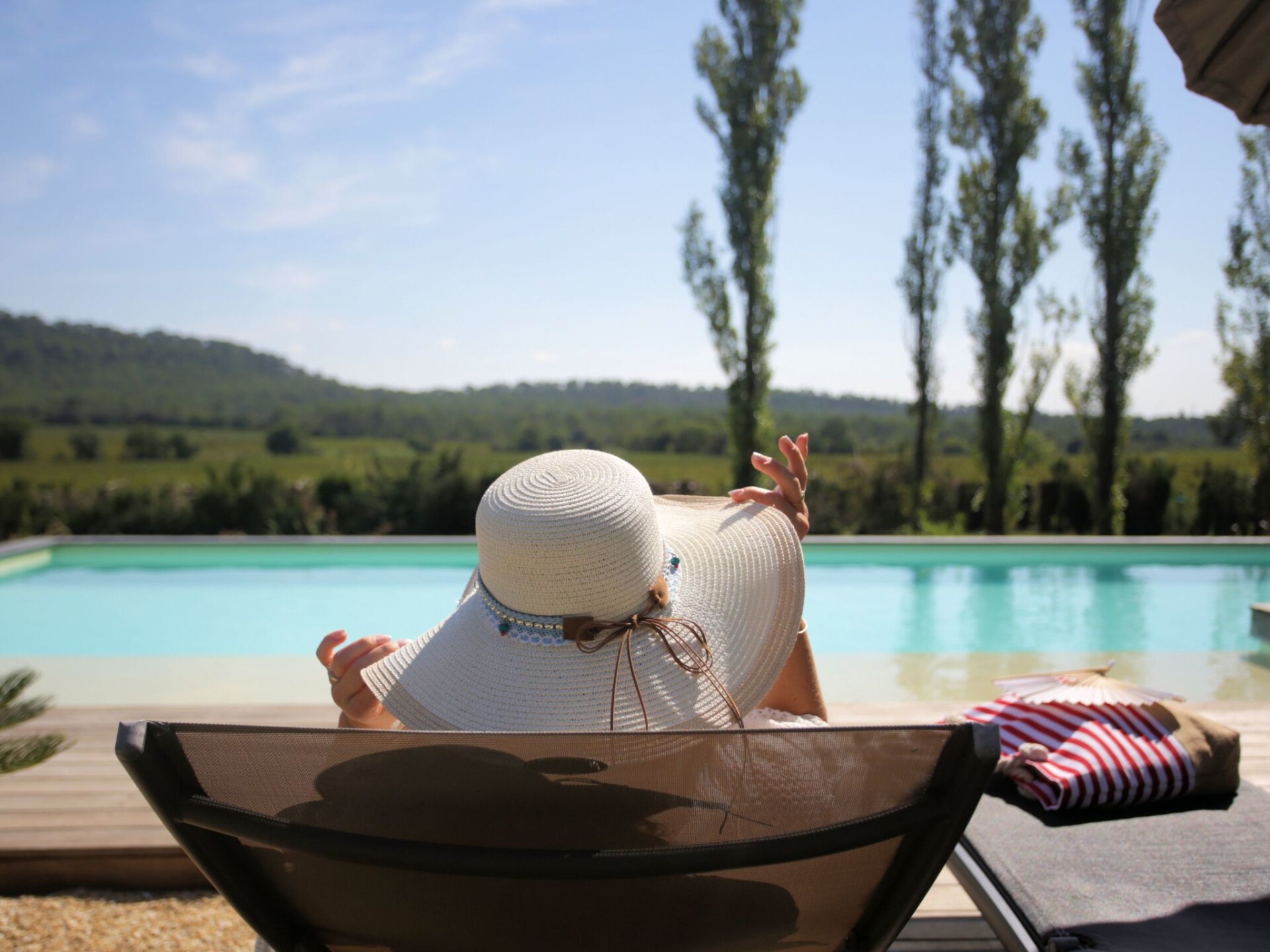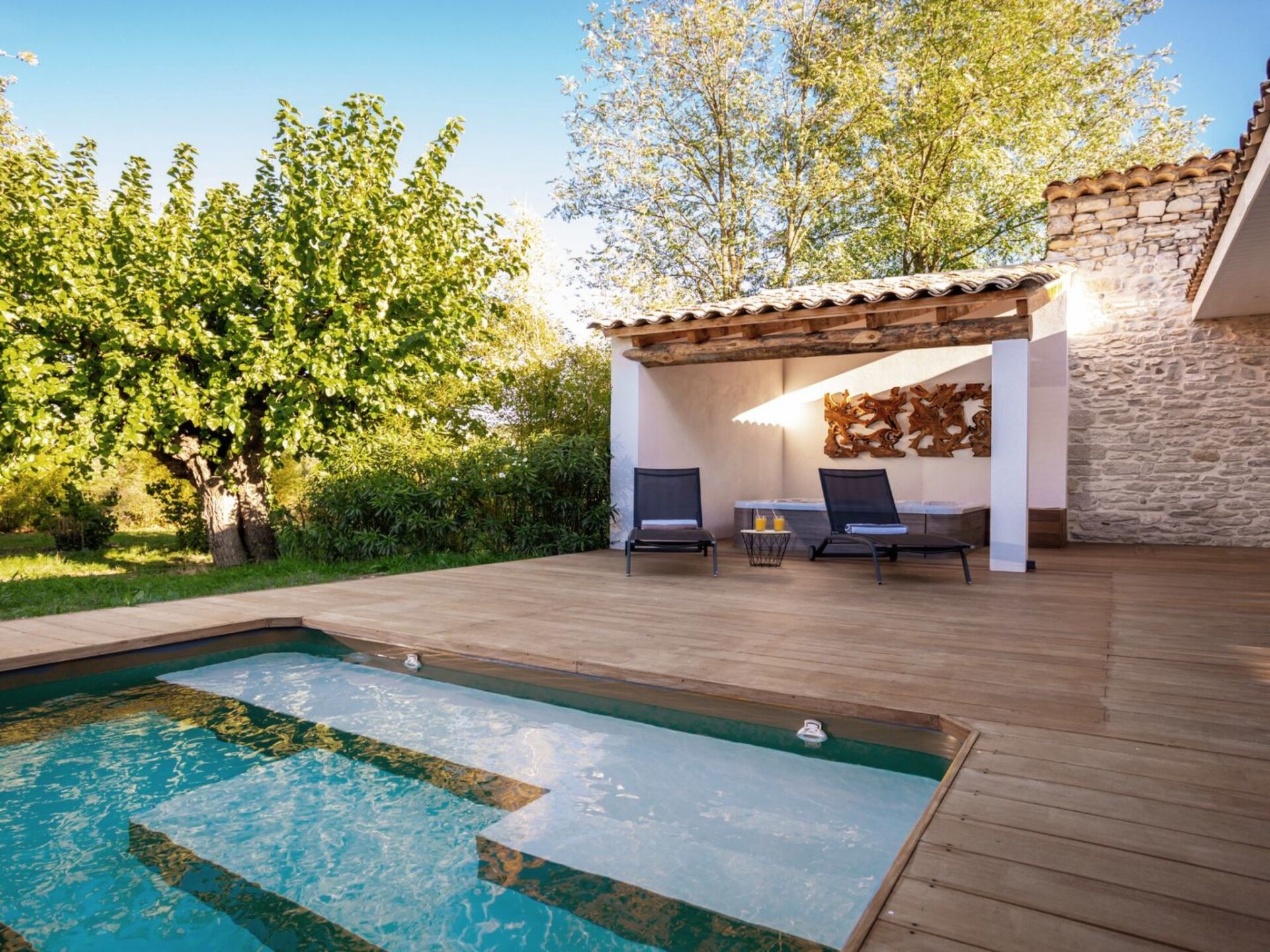 In the heavenly setting of Domaine de Monteils, a former priory that has been completely renovated, this luxury villa with its avant-garde design enjoys a landscaped garden of 1,800 m2 that is not overlooked.Surrounded by 5 hectares of Mediterranean parkland, the estate is located in Carnas, between Nîmes and Montpellier near Sommières, amidst vineyards in a paradise-like setting.Villa Océane comprises: 1 huge bedroom with super king size bed 200x200cm + TV in the bedroom, 1 fully equipped kitchen (induction hob, large fridge/freezer, dishwasher, coffee machine + Nespresso machine (free Nespresso coffee capsules), infusion machine, toaster. 1 bathroom with huge 2-post shower + 3rd outdoor shower, separate wc, 1 living room with large leather sofa. TV in living room: Sony Google TV large screen with home cinema. Large dressing room in entrance hall. Underfloor heating in living room and bedroom.Large 100m2 terrace with private covered spa, garden furniture and sun loungers. Private 7mx3m swimming pool heated from April to October.Private parking and electric vehicle charging point.The estate is surrounded by 5 hectares of Mediterranean parkland. It resembles a small hamlet. There is no overlooking from the garden of the villa, so you would never guess that there are 6 other gites. In addition to the villa's private swimming pool, the estate's huge pool area is also accessible.The Villa Océane stands out for its unusual design: the living room is entirely glazed with sliding windows, giving the impression of living in nature. The rooms are separated by sliding partitions. Designer furniture.This villa is part of a small private hamlet: Le Domaine de Monteils, comprising 7 gites, all for 2 people. It is a very old 9th century priory that has been completely renovated and converted into top-of-the-range designer tourist accommodation.The Domaine is nestled in a 5-hectare Mediterranean park, in absolute peace and quiet, and the atmosphere is always very Zen. Ideal for a romantic holiday for two.With 300 days of sunshine a year, this little corner of paradise in the Gard offers landscapes of rare beauty.On the south side are the ponds of the Camargue and the sandy beaches of the Languedoc. To the north, the Cévennes National Park offers spectacular scenery.A fantastic historical heritage: the city of Avignon, the Roman towns of Nîmes and Arles, the Pont du Gard, the Duchy of Uzès, the historic Languedoc towns of Montpellier, Pézenas, Aigues-Mortes, Anduze, Sommières and Sauve are just some of the jewels in the crown, among a multitude of charming villages and their markets with their southern accent. DE19-1630