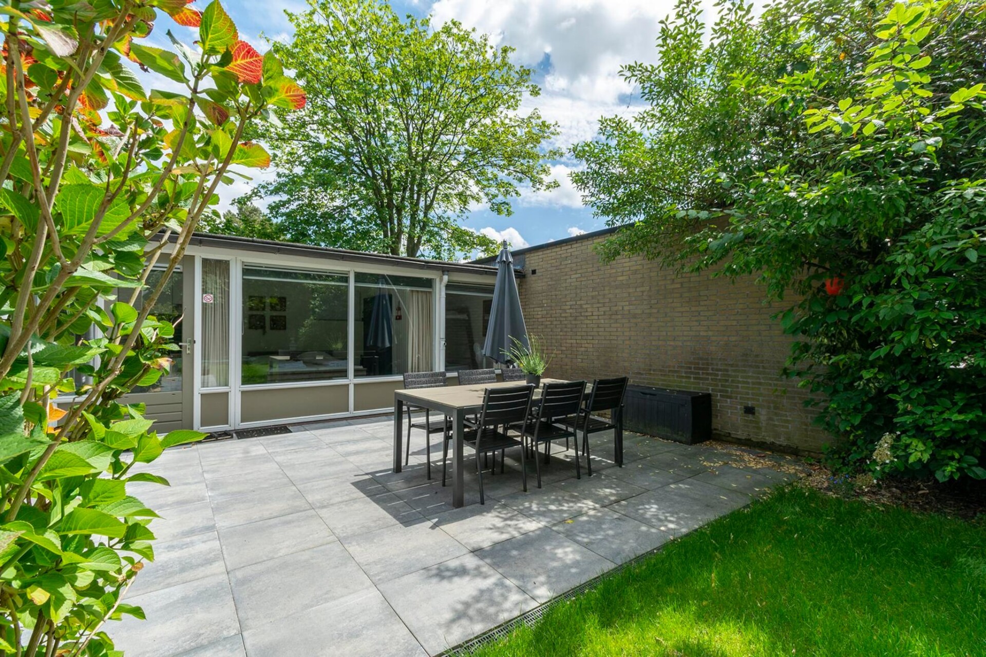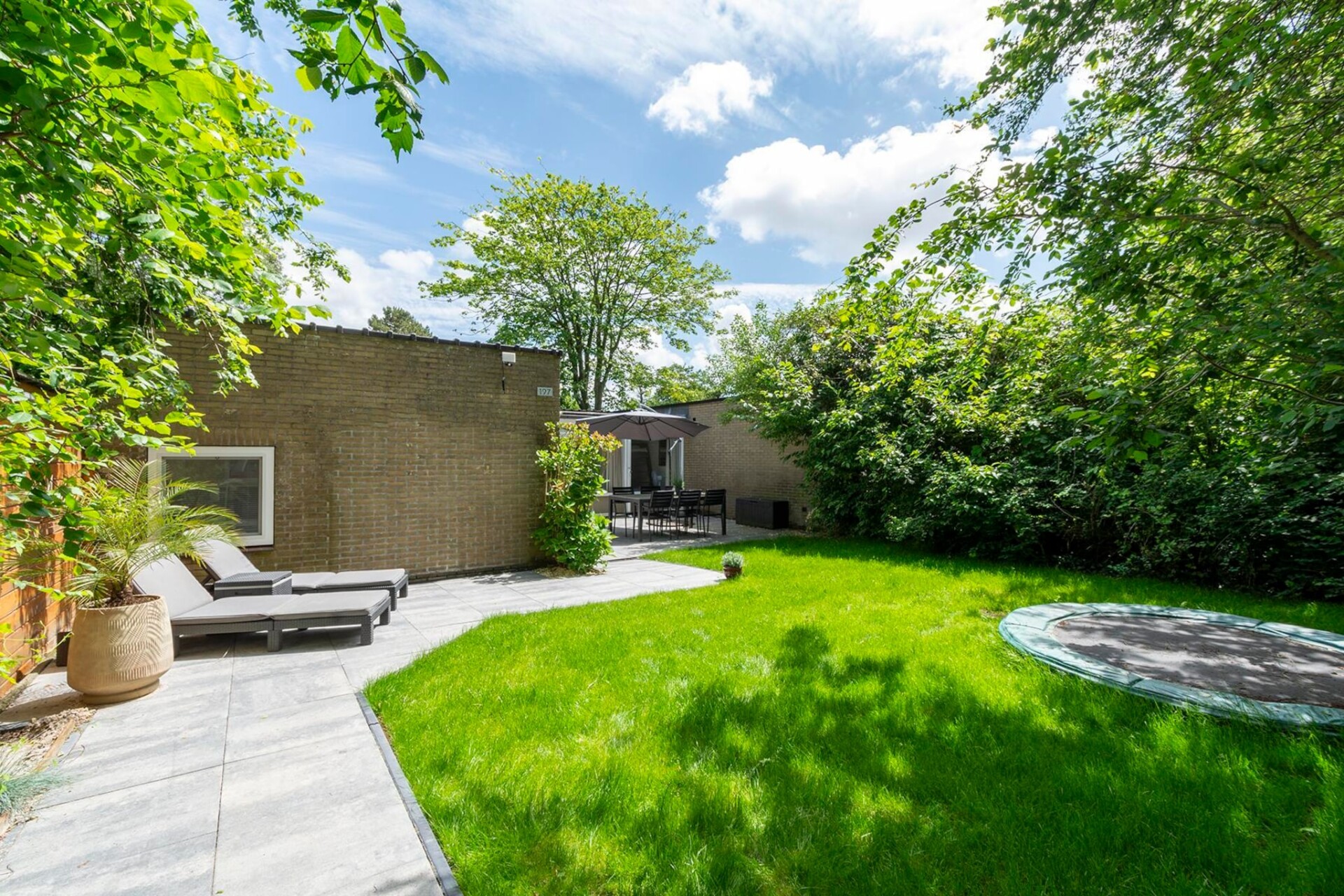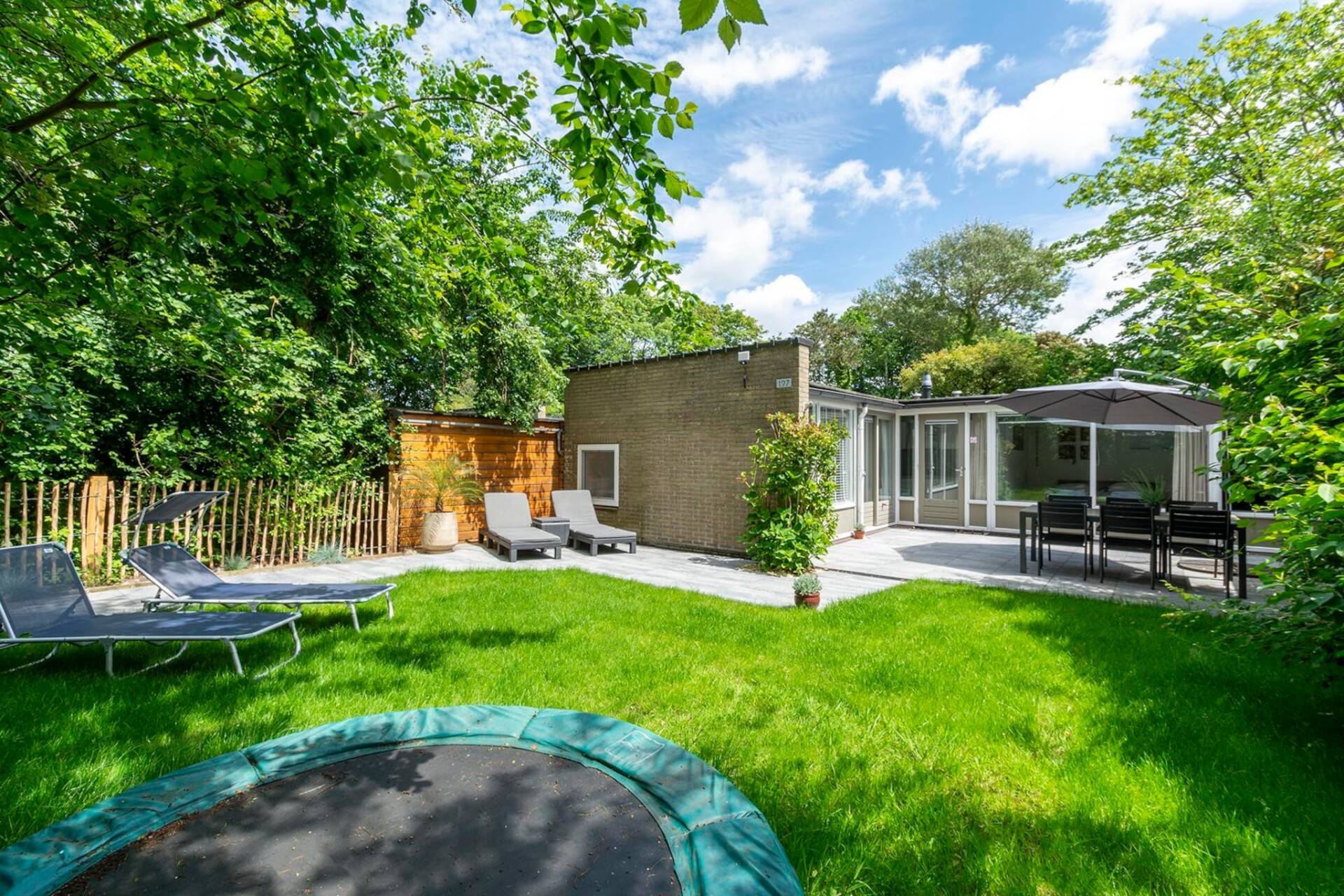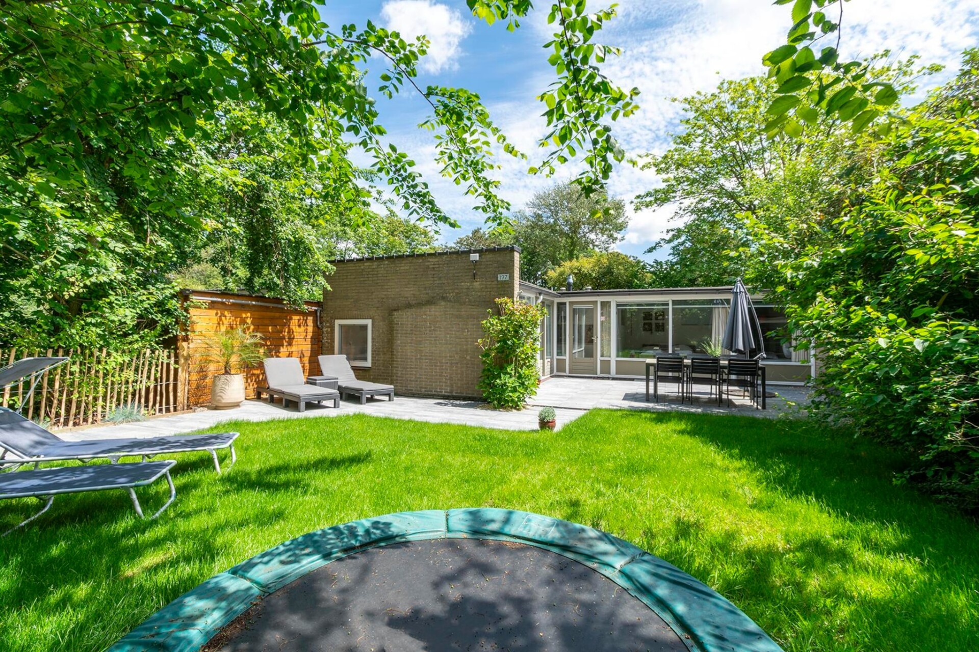 Op het beschutte terras kun je al vroeg genieten van de eerste zon terwijl de kinderen zich vermaken op de trampoline achter in de tuin.