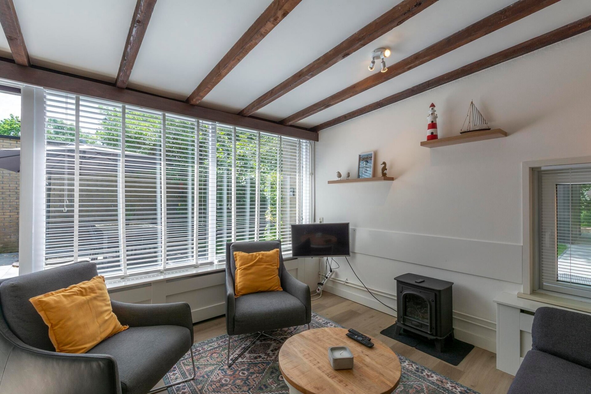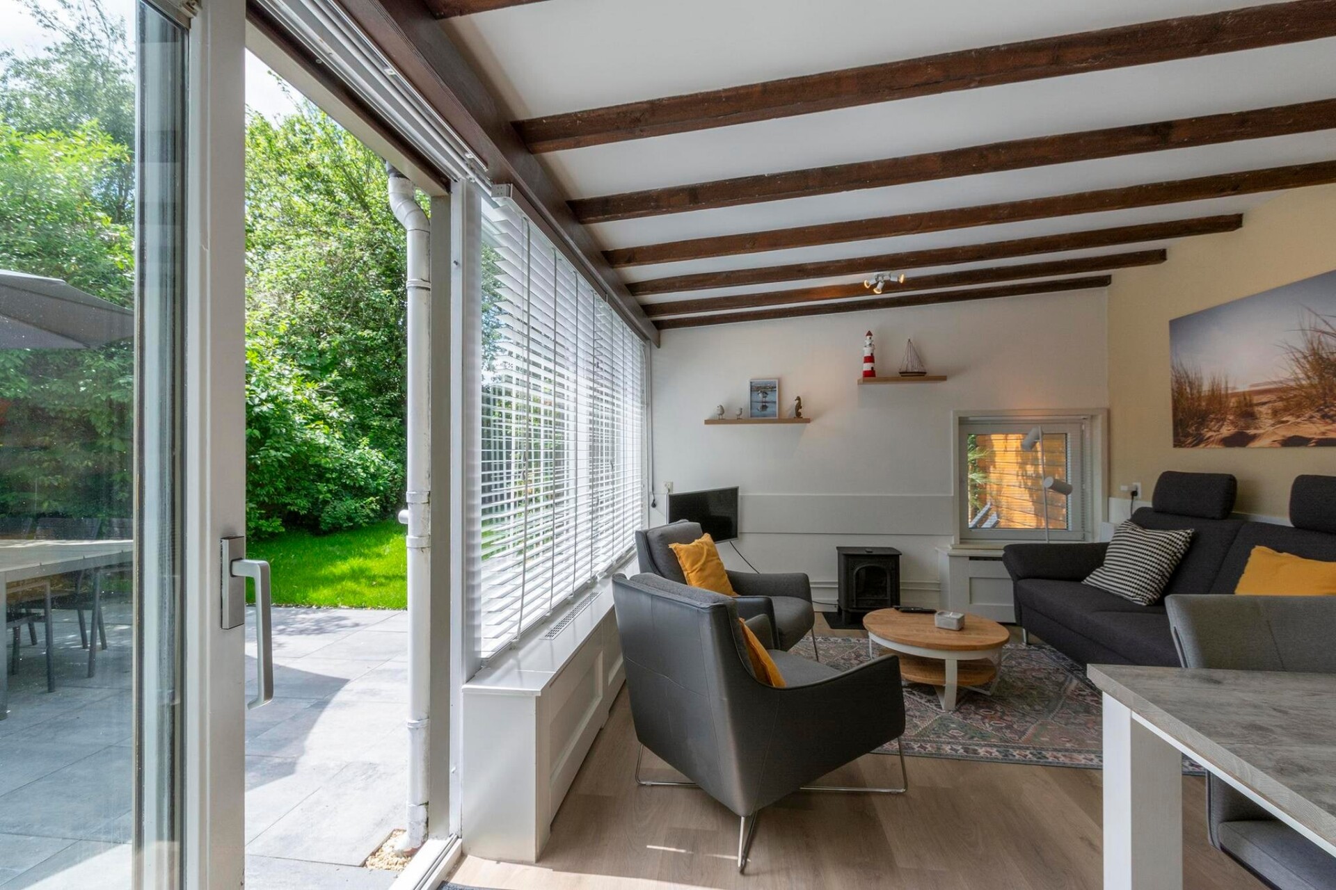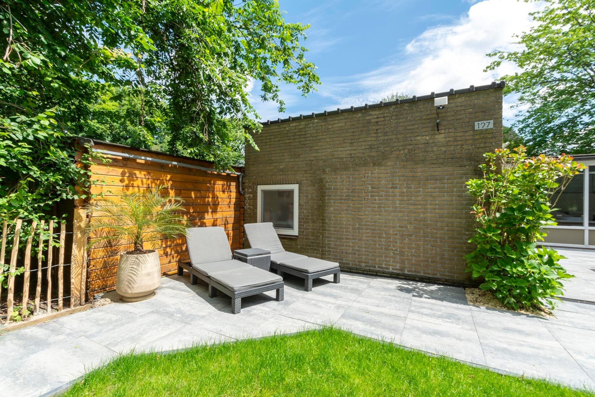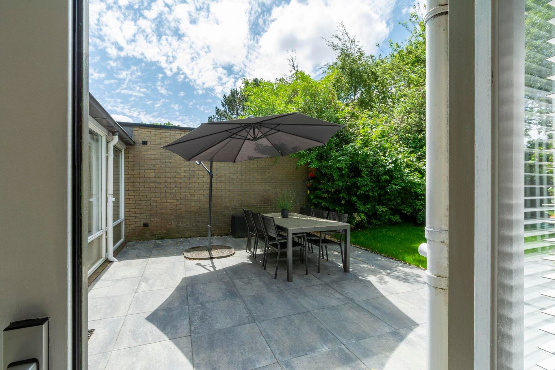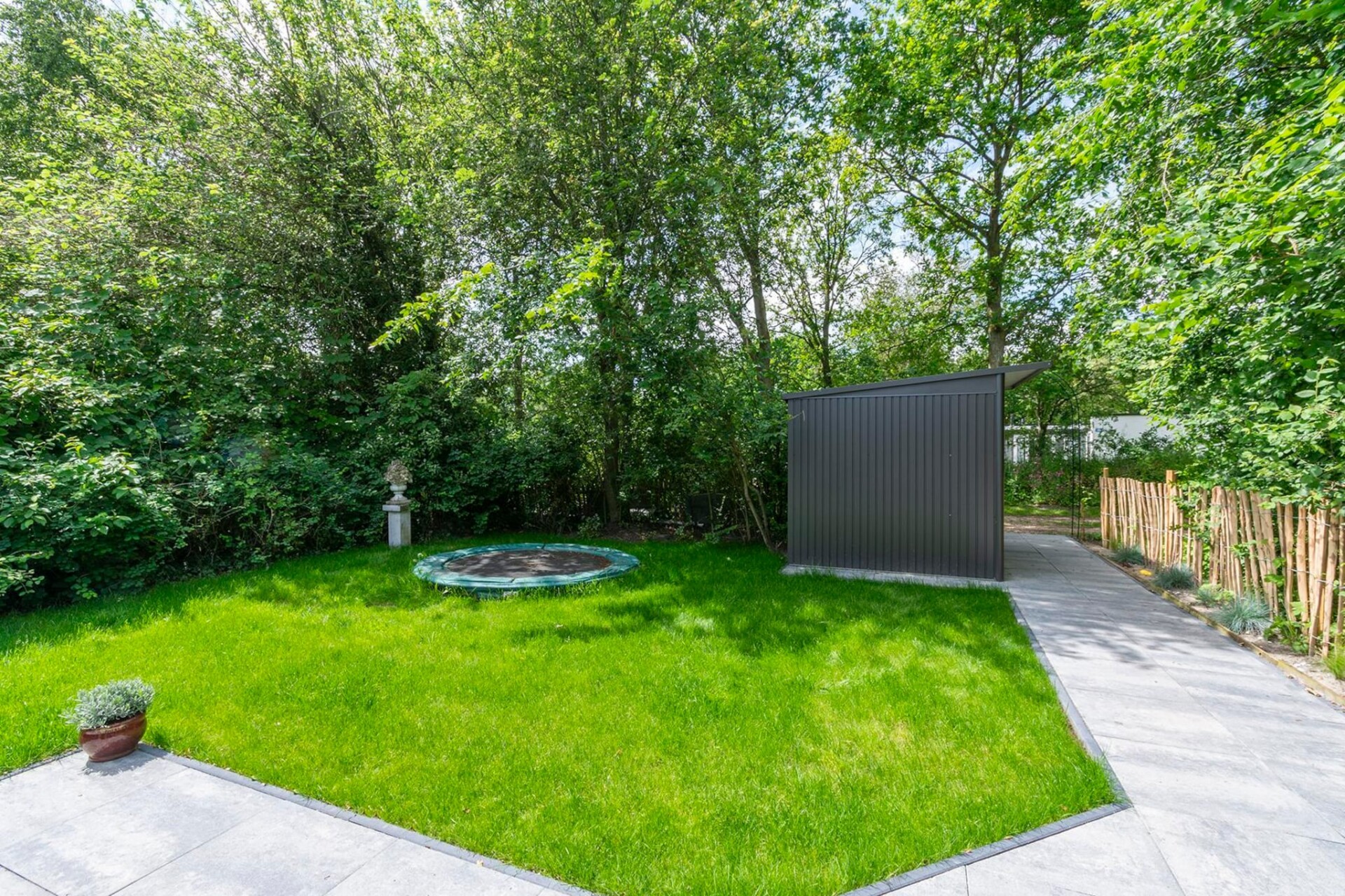 Op het beschutte terras kun je al vroeg genieten van de eerste zon terwijl de kinderen zich vermaken op de trampoline achter in de tuin.