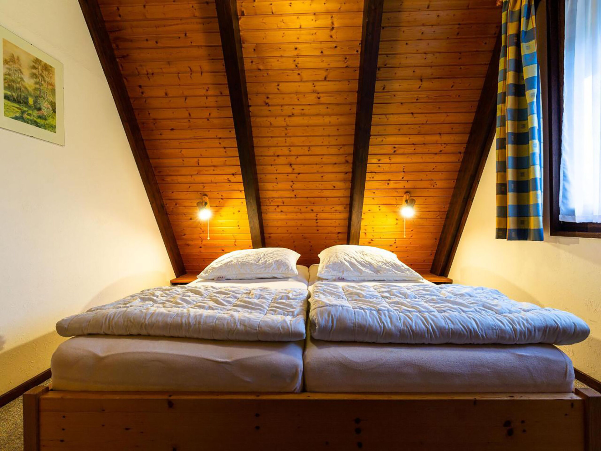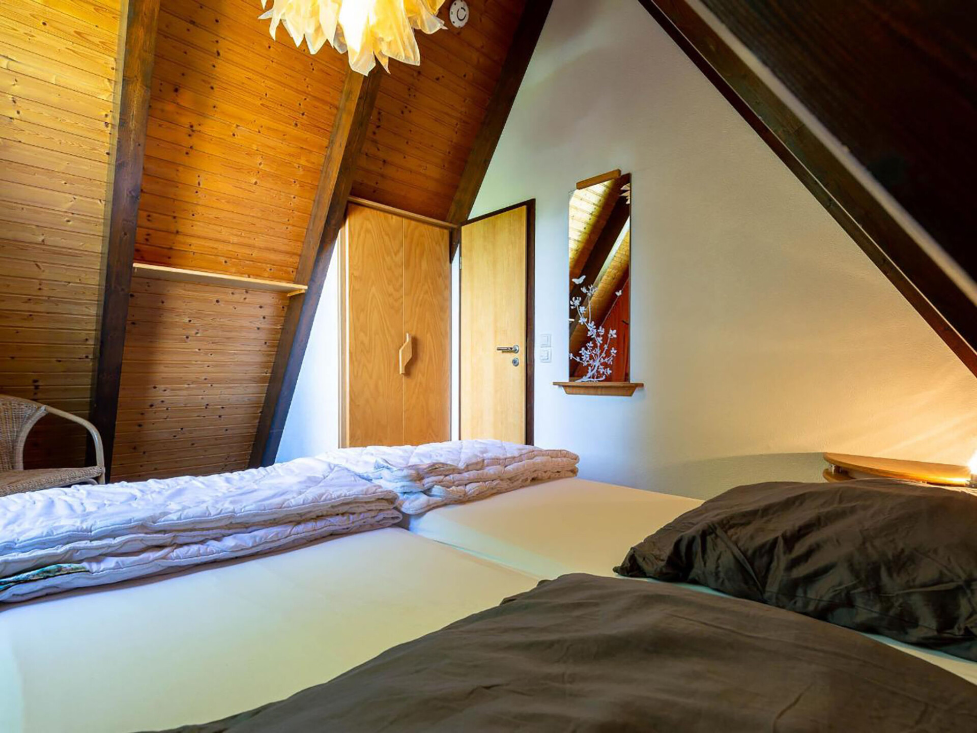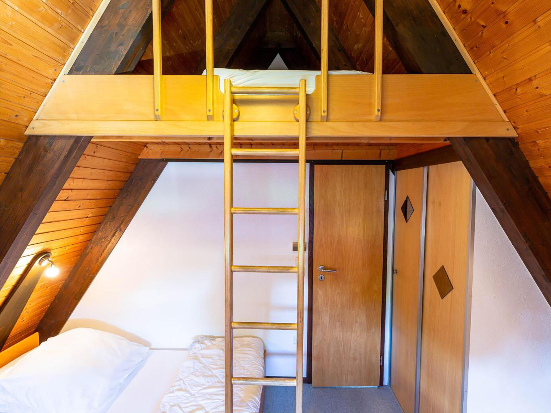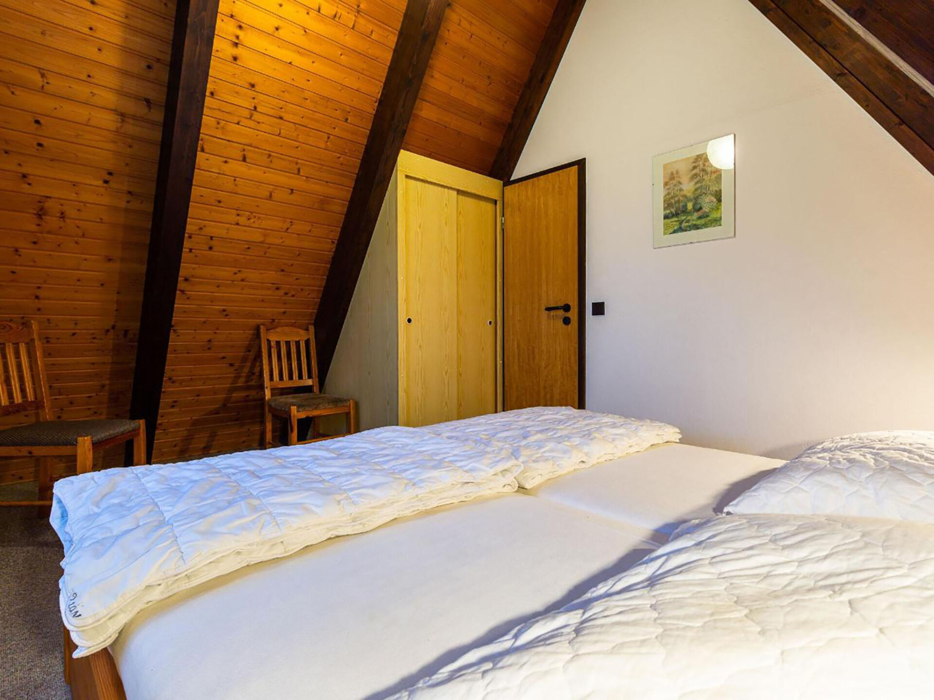 Huis 3-kamers 70 m2 op 2 verdiepingen. Afgeschuinde daken, eenvoudig en met veel hout ingericht: woon-/eetkamer met Sat-TV en radio. Uitgang naar de tuin, naar het terras. Met afgeschuinde daken, open keuken (4-pits kookplaat, elektrische koffiemachine). Douche/WC. Zolderverdieping: 1 kamer met afgeschuinde daken met 3 bedden. 1 2-pers. kamer met afgeschuinde daken. Elektrische verwarming. Terras. Terrasmeubelen, bergruimte. Ter beschikking: Internet (Internet (WiFi), gratis). Parkeerplaats op 500 m. Rookvrij huis. Maximaal 1 klein huisdier/hond toegestaan. Sommige keukens zijn voorzien van een bakoven. Houten huis met aflopend dak tot aan de grond (A-huis).
