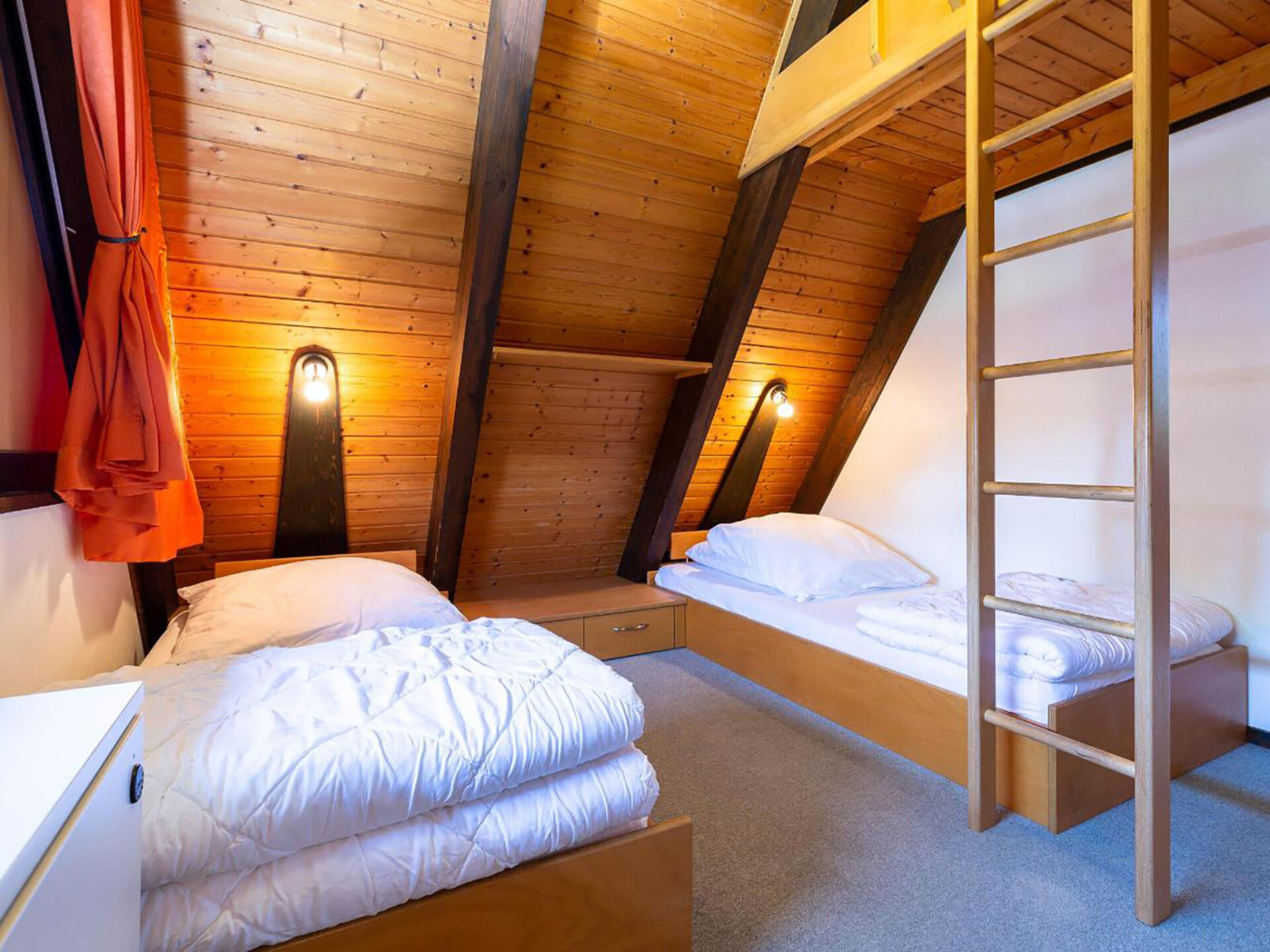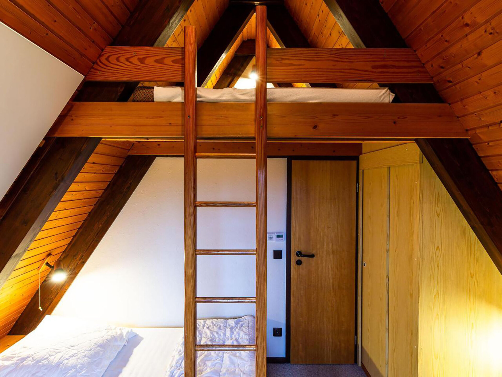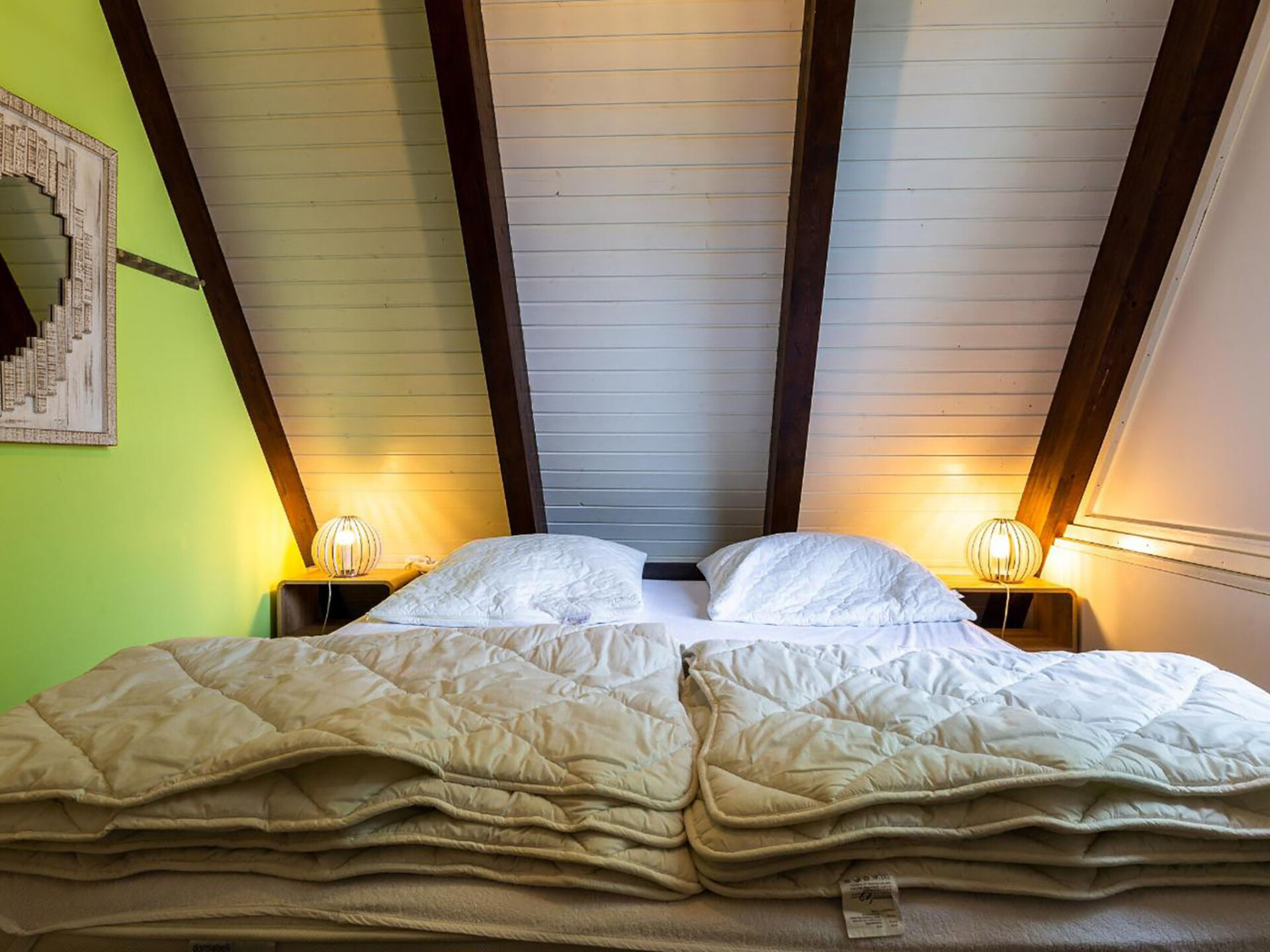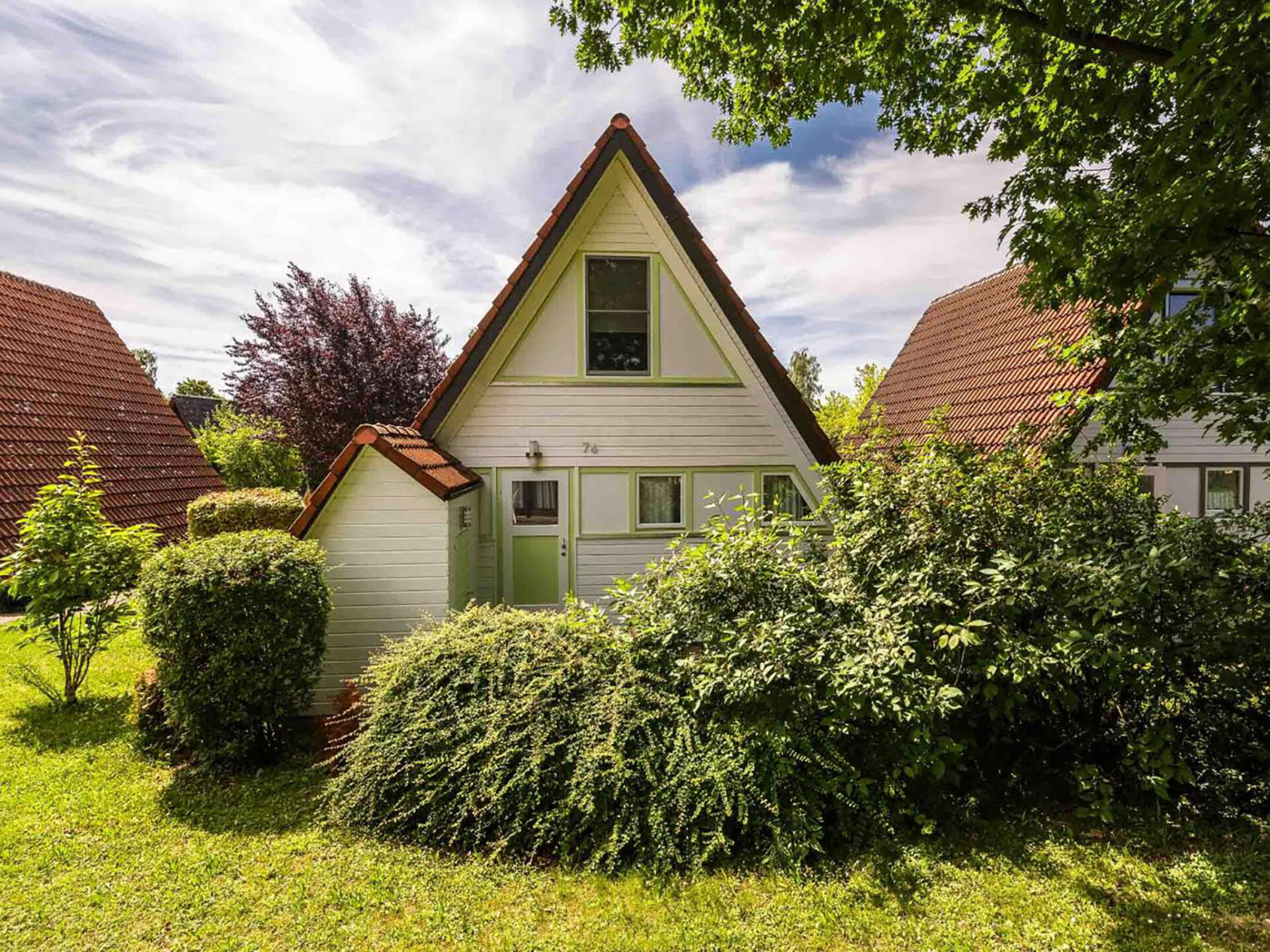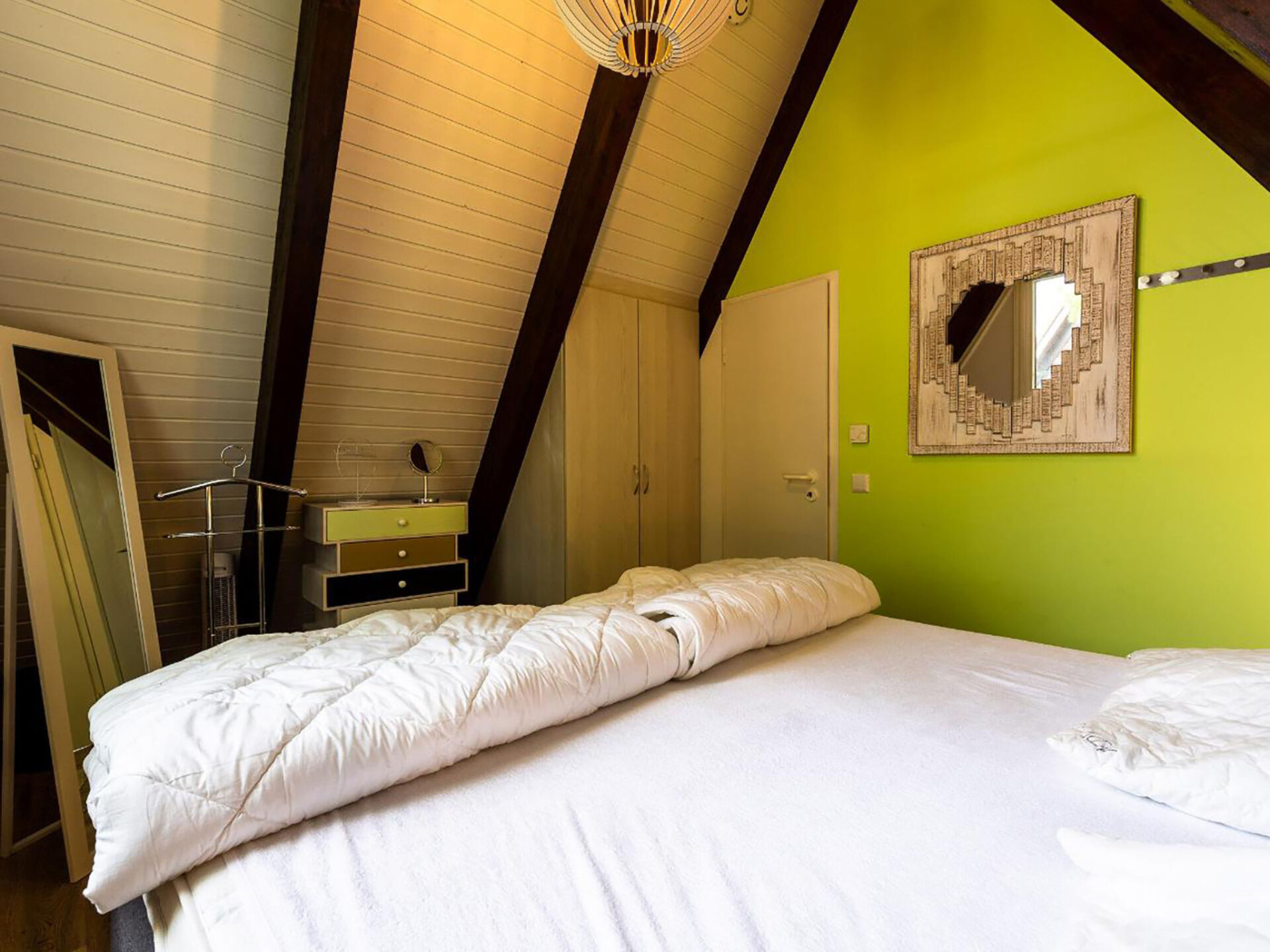 Huis 3-kamers 70 m2 op 2 verdiepingen. Afgeschuinde daken, eenvoudig en met veel hout ingericht: woon-/eetkamer met Sat-TV en radio. Uitgang naar de tuin, naar het terras. Met afgeschuinde daken, open keuken (4-pits kookplaat, elektrische koffiemachine). Douche/WC. Zolderverdieping: 1 kamer met afgeschuinde daken met 3 bedden. 1 2-pers. kamer met afgeschuinde daken. Elektrische verwarming. Terras. Terrasmeubelen, bergruimte. Ter beschikking: Internet (Internet (WiFi), gratis). Parkeerplaats op 500 m. Rookvrij huis. Maximaal 1 klein huisdier/hond toegestaan. Sommige keukens zijn voorzien van een bakoven. Houten huis met aflopend dak tot aan de grond (A-huis).