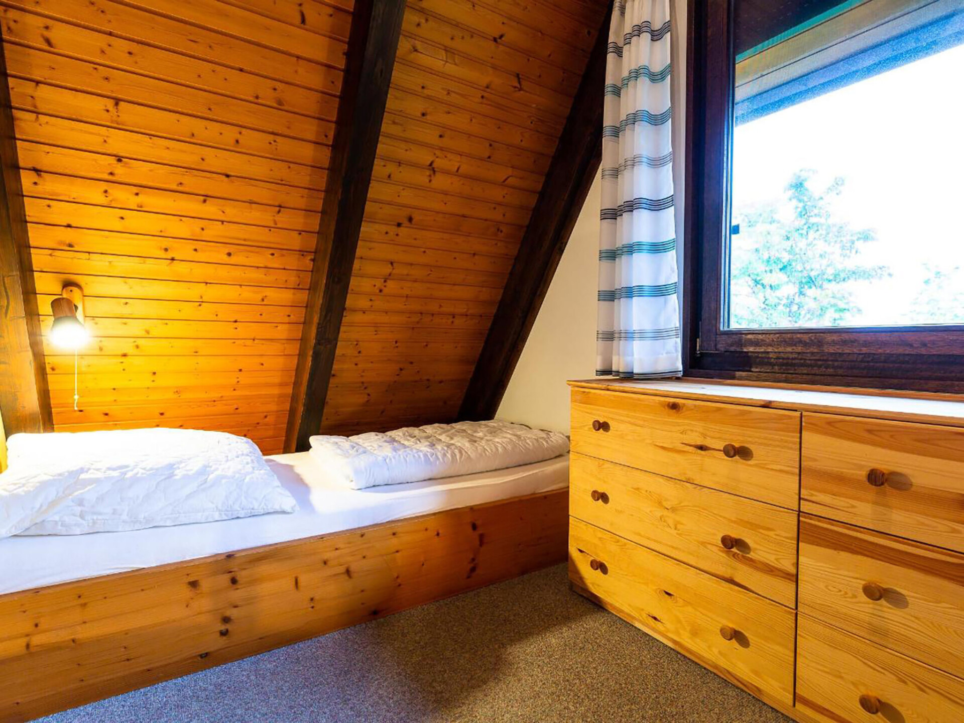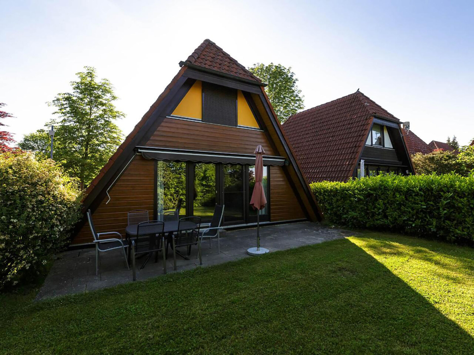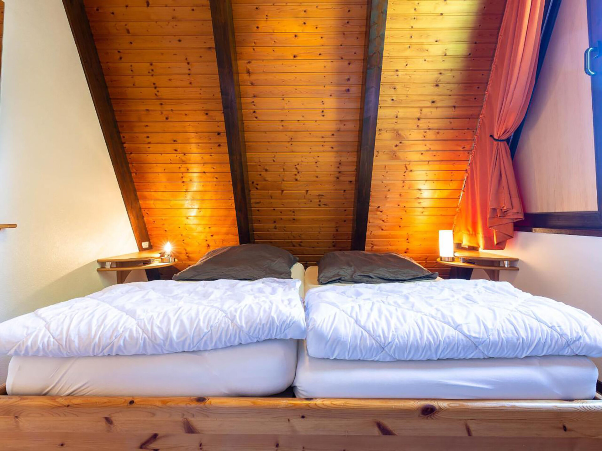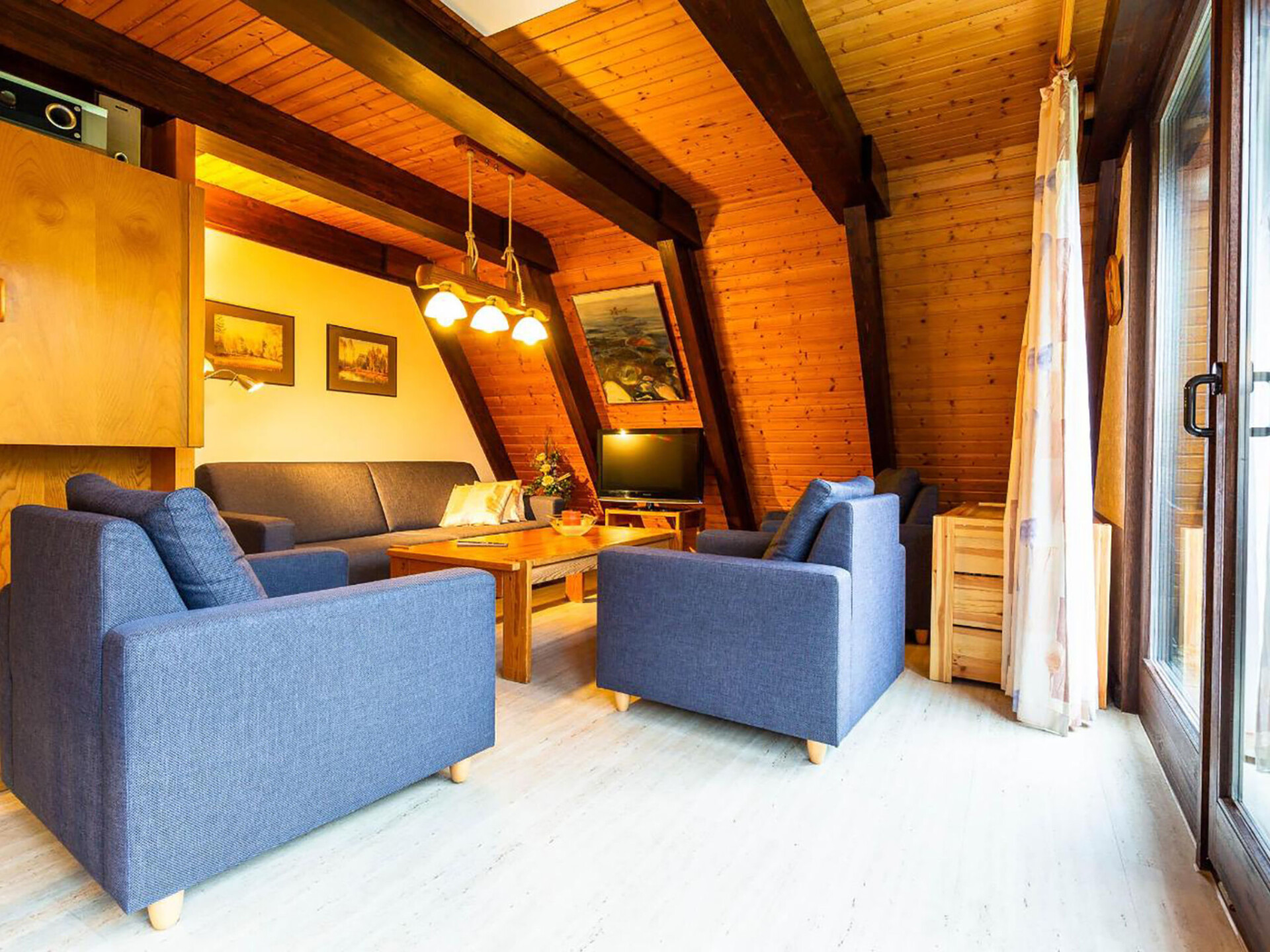 Huis 3-kamers 70 m2 op 2 verdiepingen. Afgeschuinde daken, eenvoudig en met veel hout ingericht: woon-/eetkamer met Sat-TV en radio. Uitgang naar de tuin, naar het terras. Met afgeschuinde daken, open keuken (4-pits kookplaat, elektrische koffiemachine). Douche/WC. Zolderverdieping: 1 kamer met afgeschuinde daken met 3 bedden. 1 2-pers. kamer met afgeschuinde daken. Elektrische verwarming. Terras. Terrasmeubelen, bergruimte. Ter beschikking: Internet (Internet (WiFi), gratis). Parkeerplaats op 500 m. Rookvrij huis. Maximaal 1 klein huisdier/hond toegestaan. Sommige keukens zijn voorzien van een bakoven. Houten huis met aflopend dak tot aan de grond (A-huis).