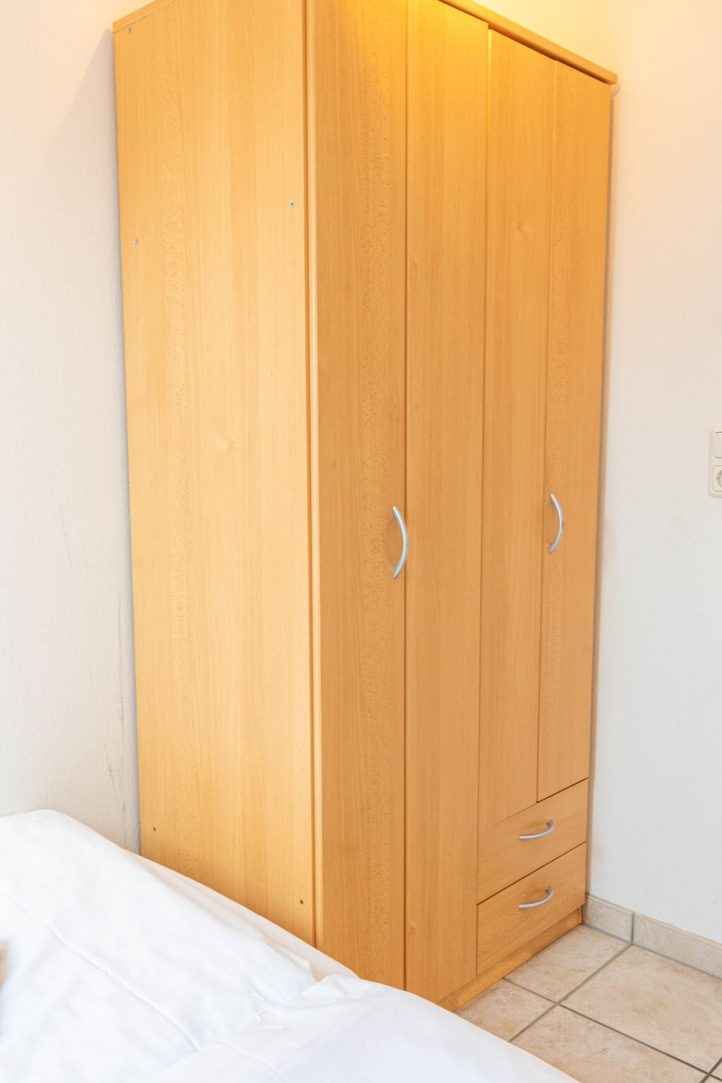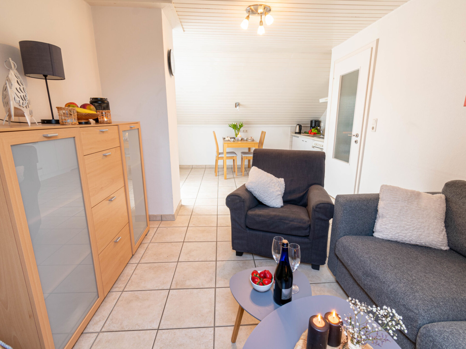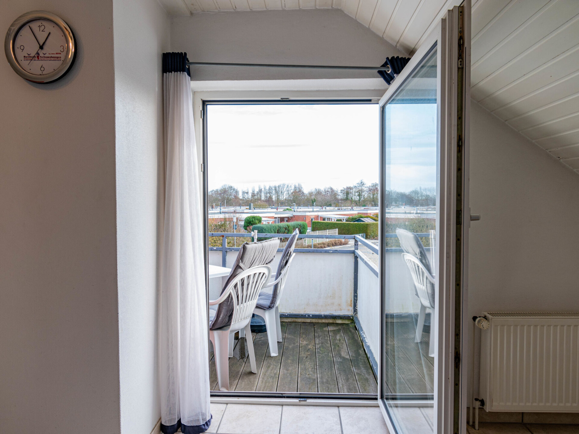 "Juist", appartement 2-kamers 32 m2, op de bovenste verdieping. Afgeschuinde daken, stijlvol ingericht: woon-/eetkamer 12 m2 met Sat-TV (Flatscreen TV). Uitgang naar het balkon. 1 kleine kamer 4 m2 met 1 2-pers bed (2 x 80 cm, lengte 200 cm). Kookhoek (oven, 4 keramische glas kookplaten, broodrooster, waterkoker, elektrische koffiemachine) met eettafel. Douche/WC. Klein balkon 6 m2. Balkonmeubilair. Ter beschikking: kinderstoel (extra). Niet rokers woning. Maximaal 1 huisdier/hond toegestaan. Rookmelders.