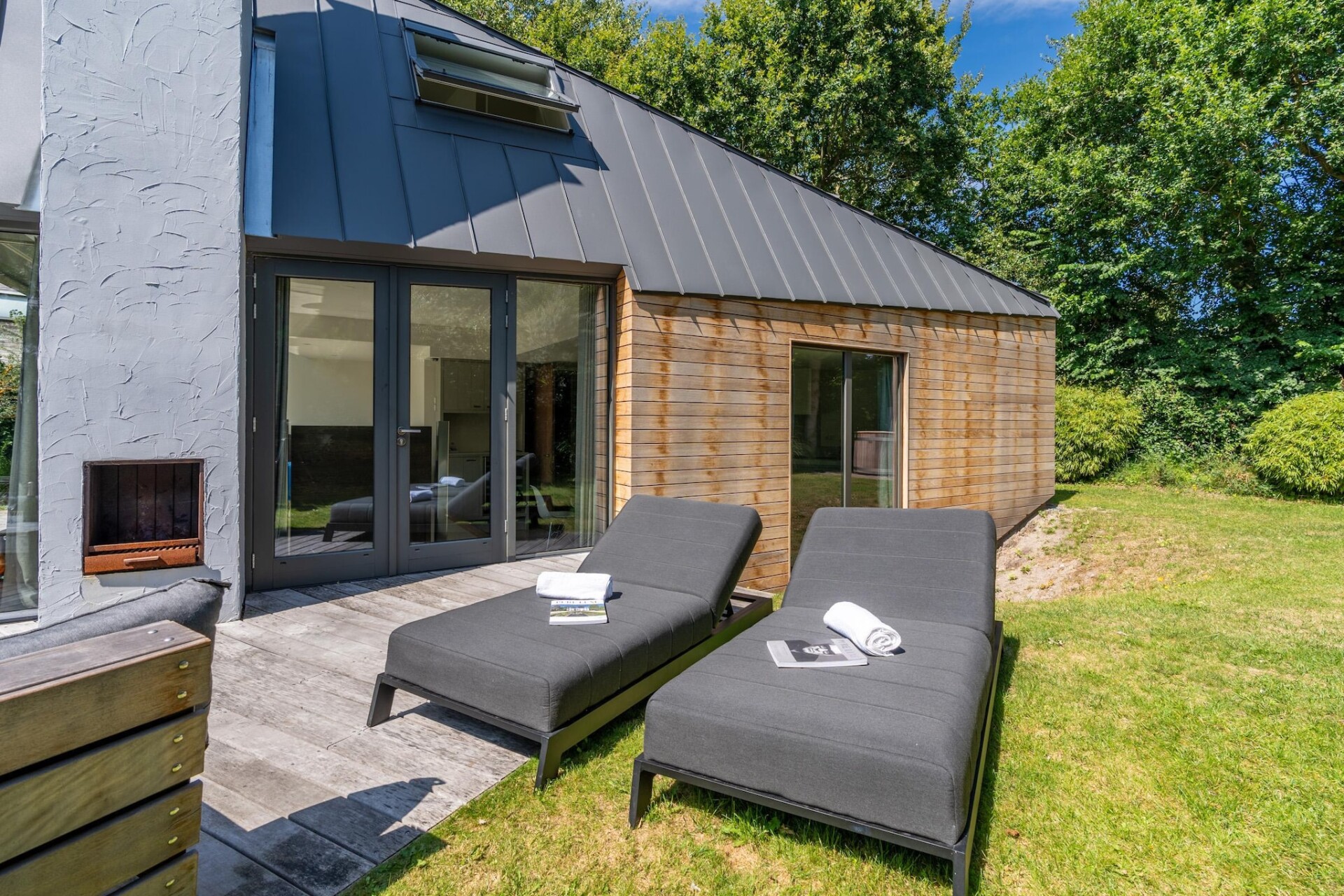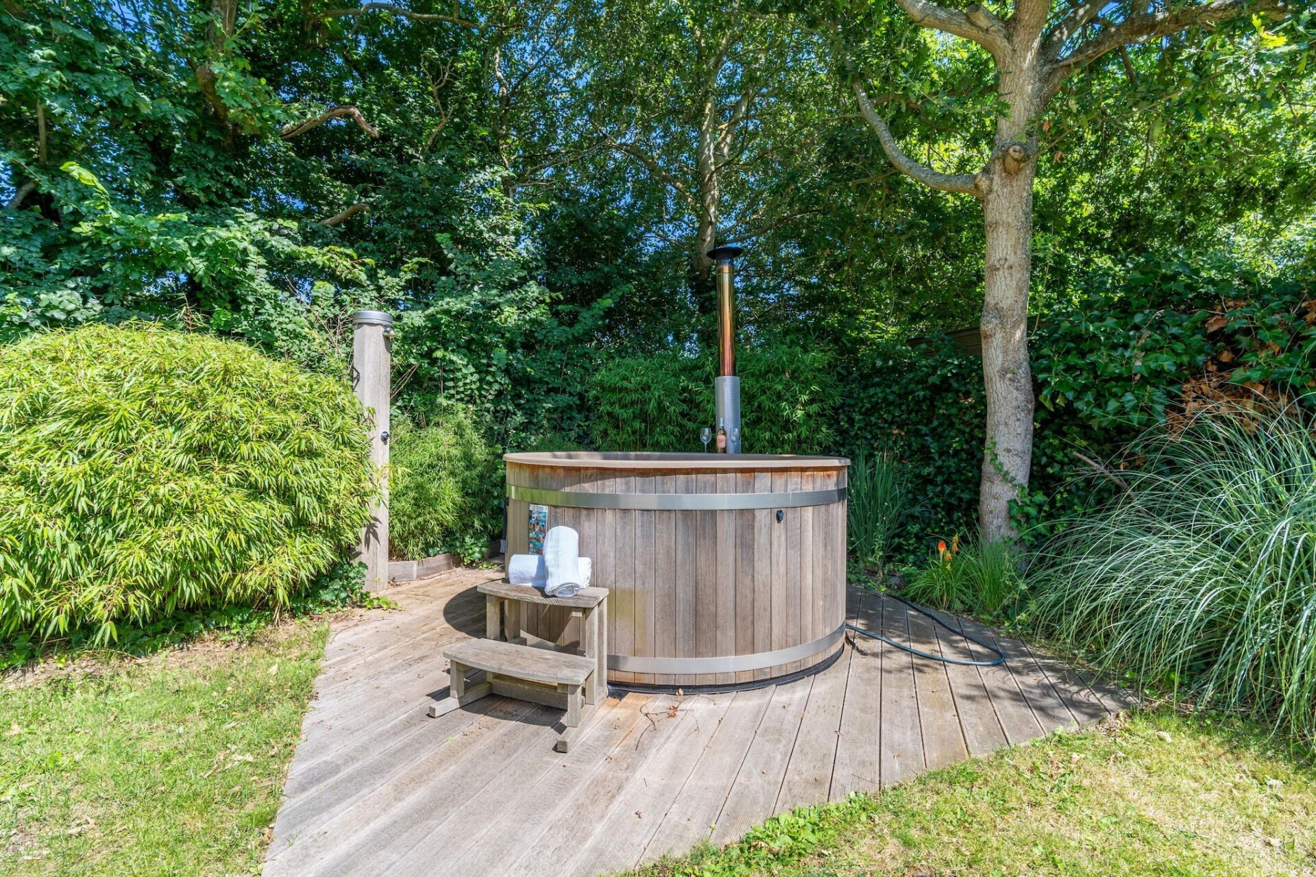 Buiten is het minstens zo genieten als binnen. De loungehoek en de diningset bieden mogelijkheden om te ontspannen of samen te tafelen. De houtgestookte hottub en de buitendouche zijn het hele jaar door te gebruiken. De geur van brandend hout, het zachte geluid van de natuur om je heen en als je naar boven kijkt een fonkelende sterrenhemel, dat komt tot leven bij dit verblijf.