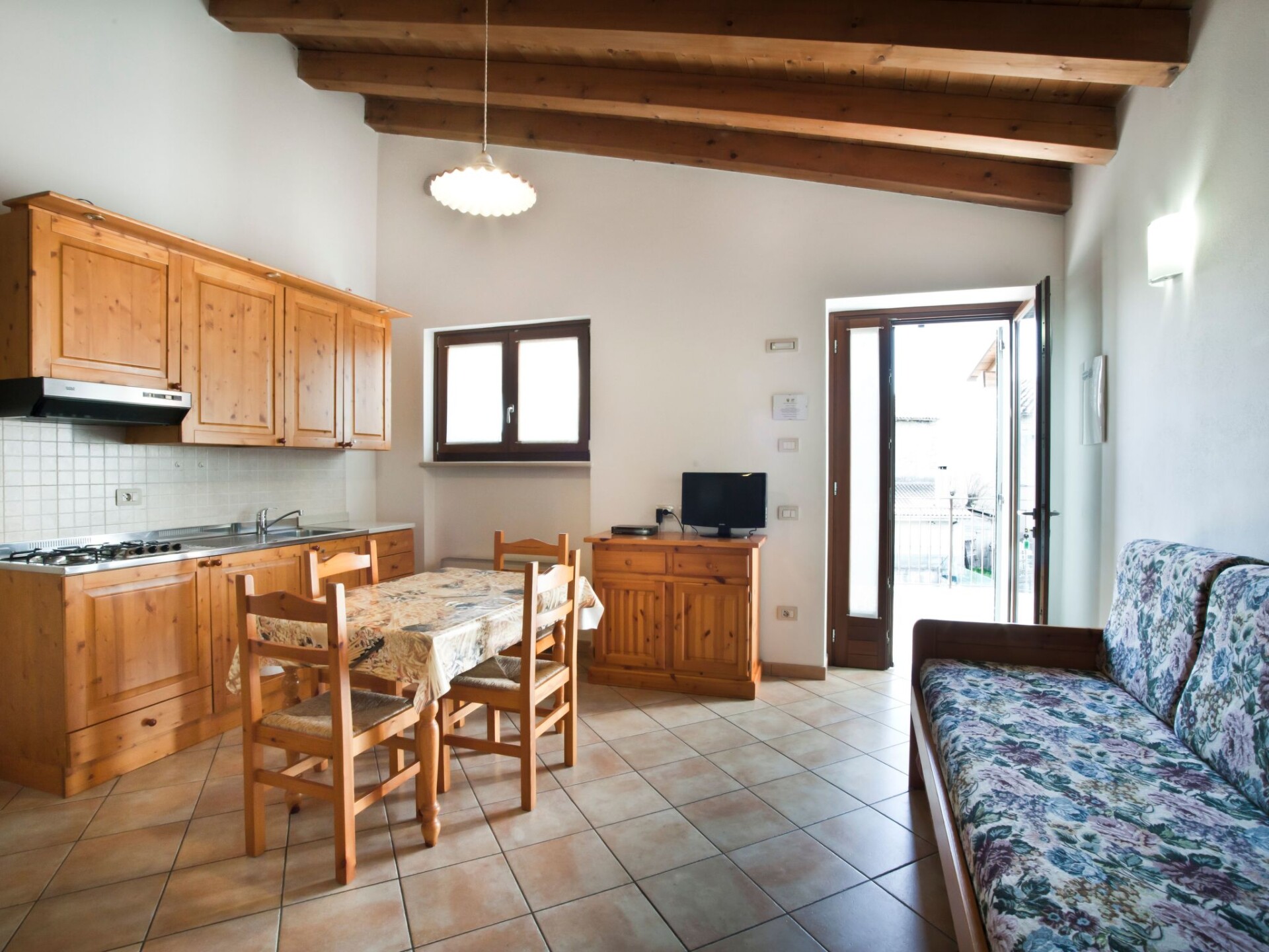 The studio is located on the first floor and consists of a living room with a kitchenette and a bathroom. In the functionally furnished accommodation you will find everything you need for a three-person holiday: the living room offers a kitchenette with a gas cooker and refrigerator in the dining area, as well as a dining table and chairs for four people, while the sleeping area is equipped with a double bed and a single bed. The bathroom is equipped with a shower and hairdryer. The flat is also equipped with air conditioning, television and Wi-Fi. A particularly noteworthy feature of this property is the view of the beautiful Mincio river valley. IT023089B57I5CL9GY