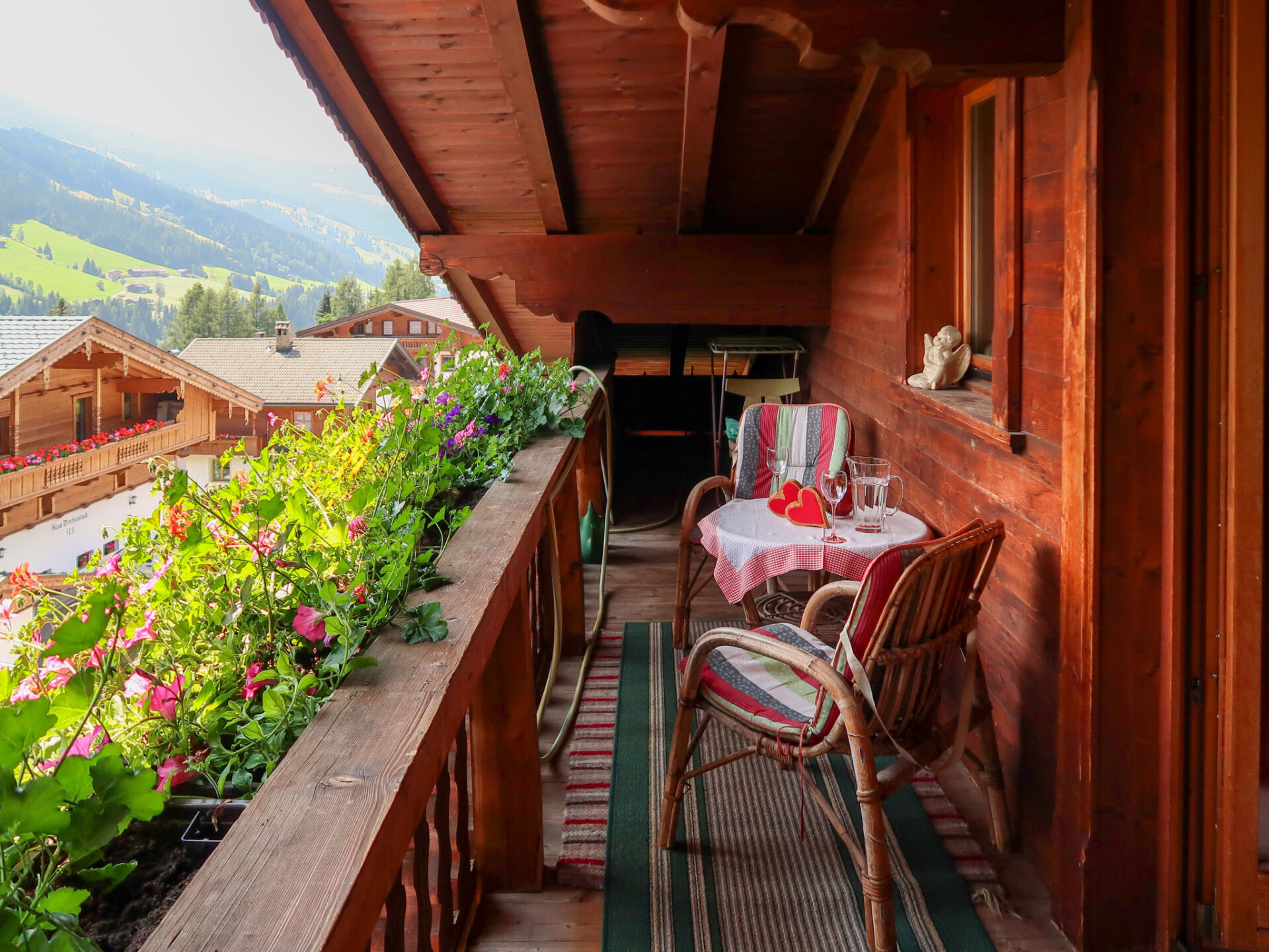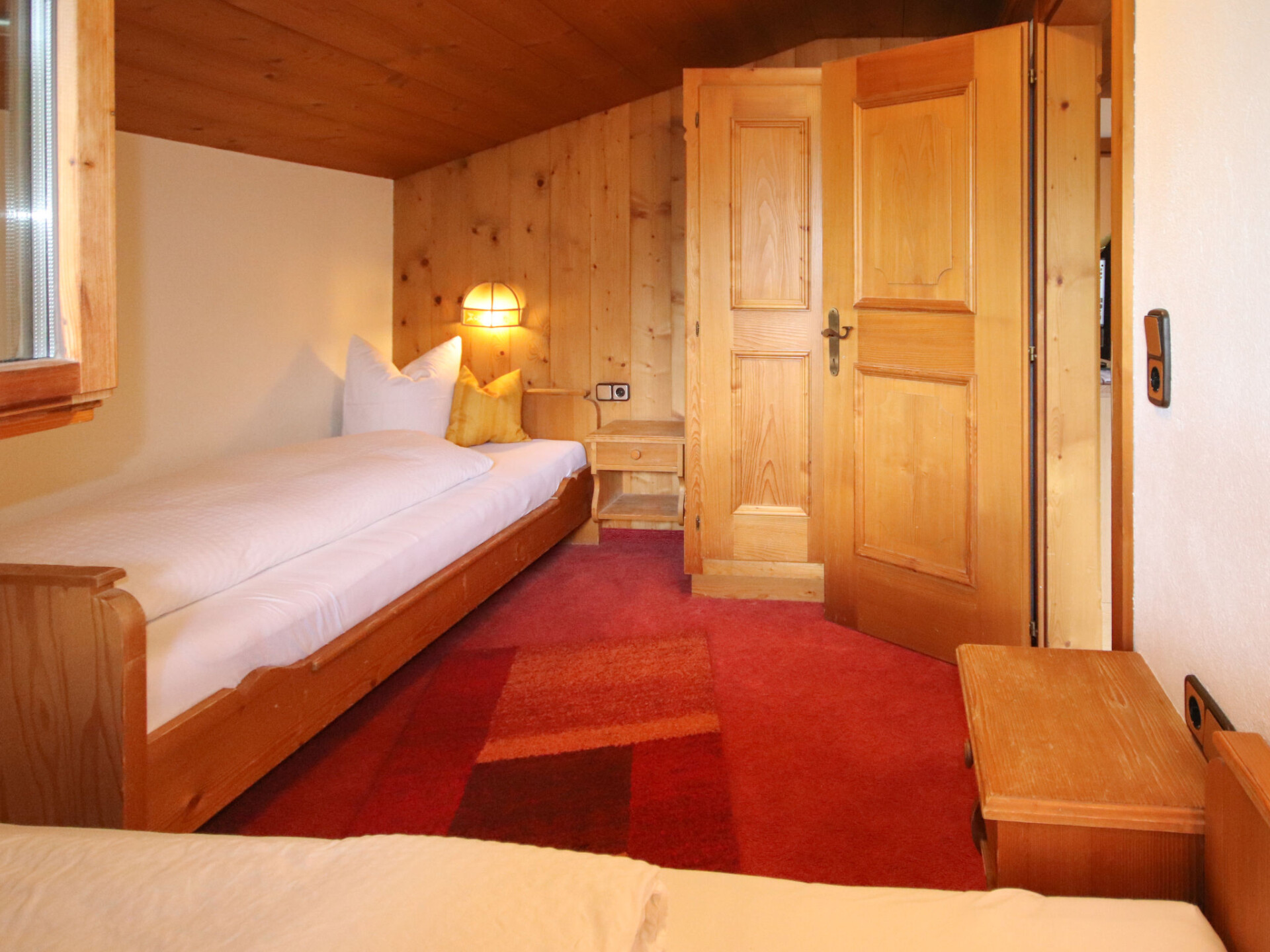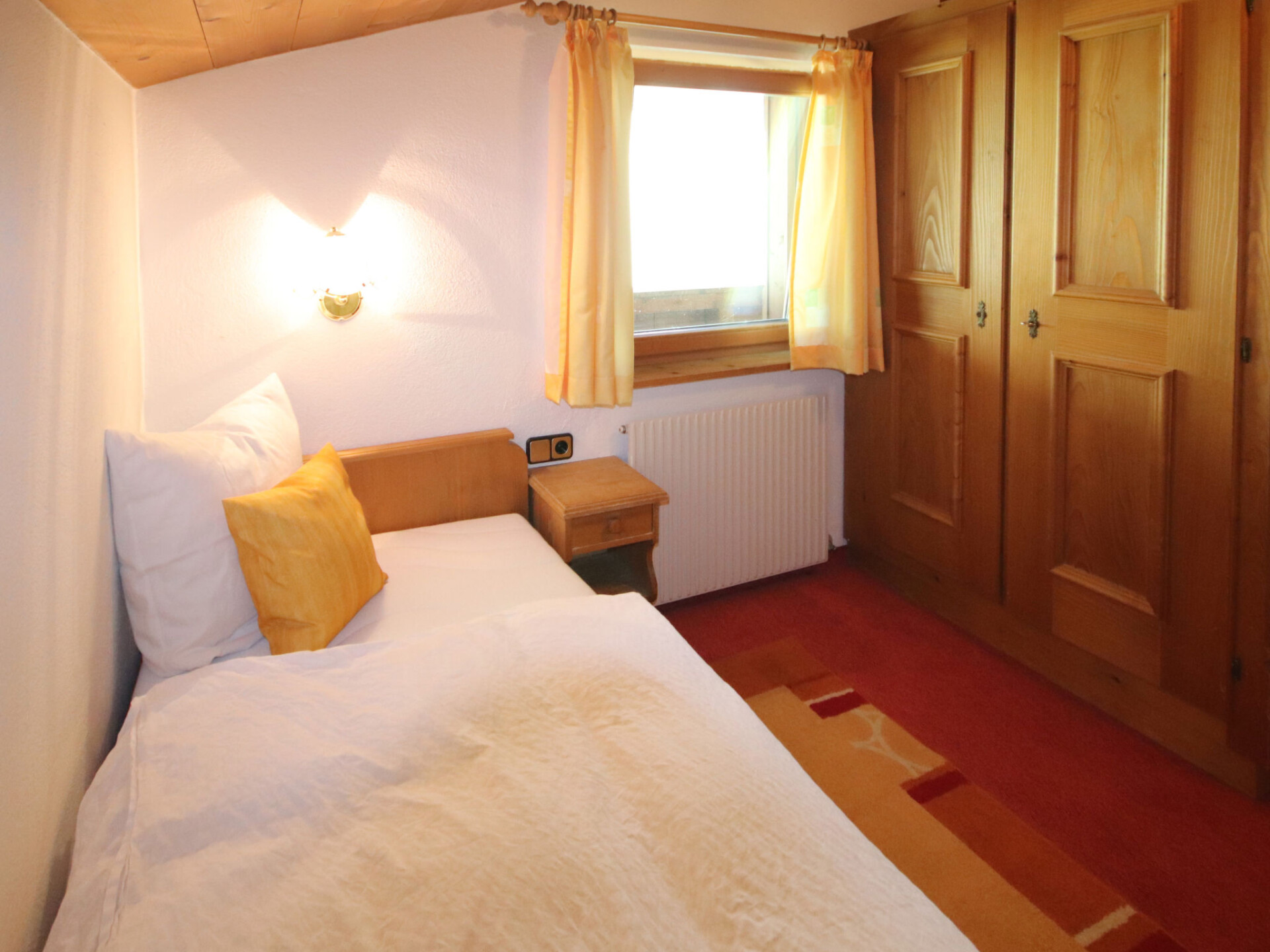 "Elisabeth", appartement 4-kamers 65 m2, op de bovenste verdieping. Gedeeltelijk afgeschuinde daken, gezellig en met veel hout ingericht: zolderverdieping: (steile trap) hal. 1 2-pers. kamer met 1 2-pers bed. 1 kamer met 2 bedden. 1 kamer met 1 bed. Woonkeuken (4-pits kookplaat, oven, afwasmachine, broodrooster, waterkoker, elektrische koffiemachine) met eethoek en Sat-TV (Flatscreen TV), radio. Uitgang naar het balkon. Badkamer, aparte WC, dubbele wastafels. Verwarming. Vloerbedekking. Balkon. Balkonmeubilair. Mooi uitzicht op de bergen. Ter beschikking: haardroger. Internet (Internet (WiFi), gratis). Niet rokers woning. Privé ingang.