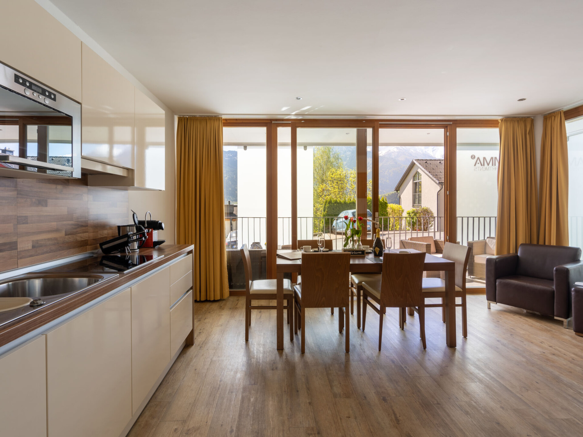 Appartement 3-kamers 54 m2. Licht, smaakvol en gezellig ingericht: 2 2-pers. kamers, elke kamer heeft Sat-TV en Flatscreen TV. Woon-/slaapkamer met 1 2-pers divanbed, eethoek, Sat-TV en Flatscreen TV. Berging. Open keuken (oven, afwasmachine, 4 keramische glas kookplaten, broodrooster, waterkoker, magnetron, elektrische koffiemachine, pads voor de koffiemachine (Nespresso) extra). Badkamer, douche, aparte WC. Vloerverwarming. Groot balkon. Balkonmeubilair. Zeer mooi panoramazicht op de bergen. Ter beschikking: haardroger. Internet (WiFi, gratis). Niet rokers woning. Maximaal 1 huisdier/hond toegestaan. Rookmelders. De beschrijving betreft een voorbeeld van dit type woning in dit complex. 50616-001123-2020