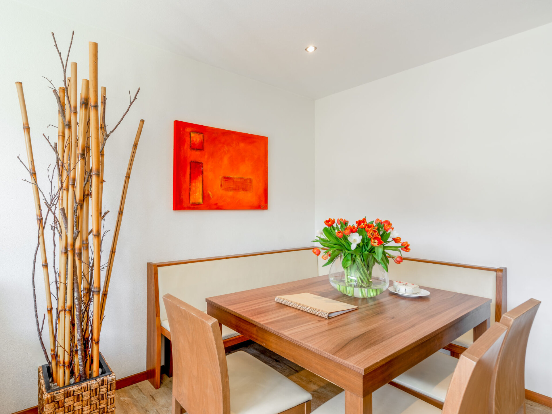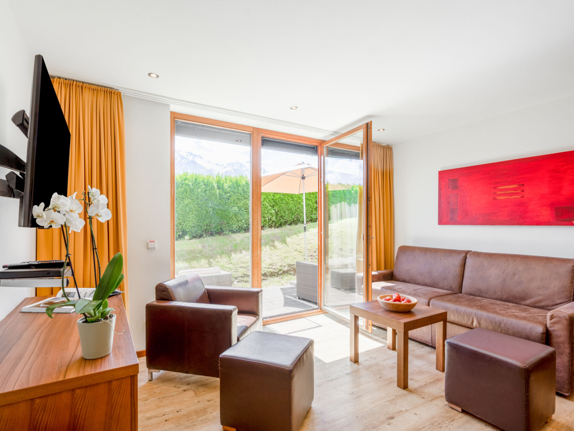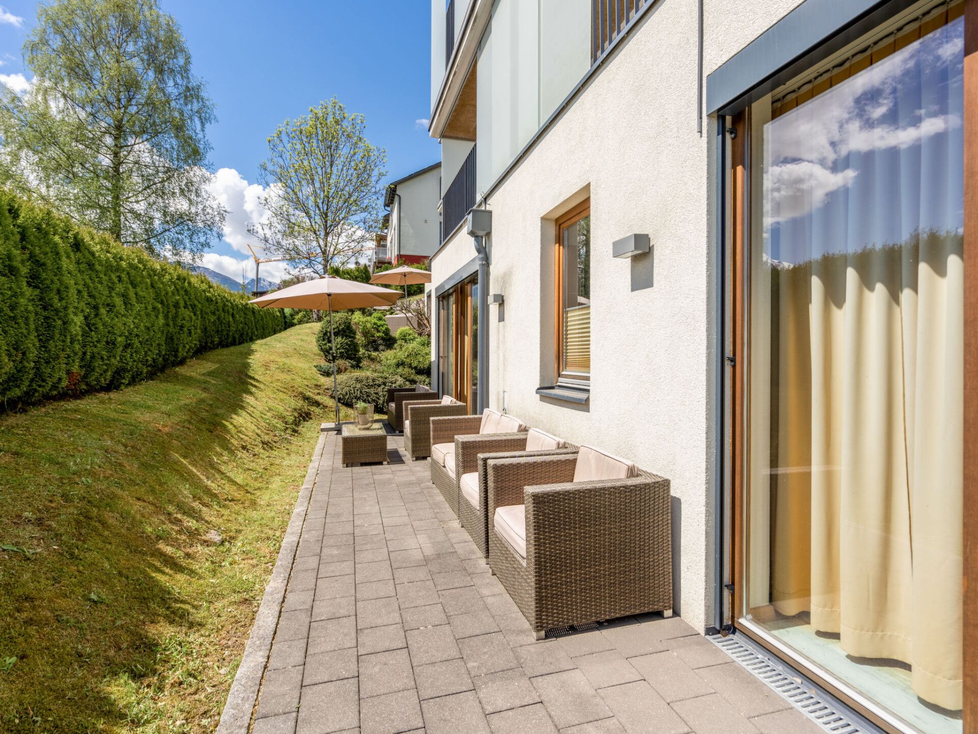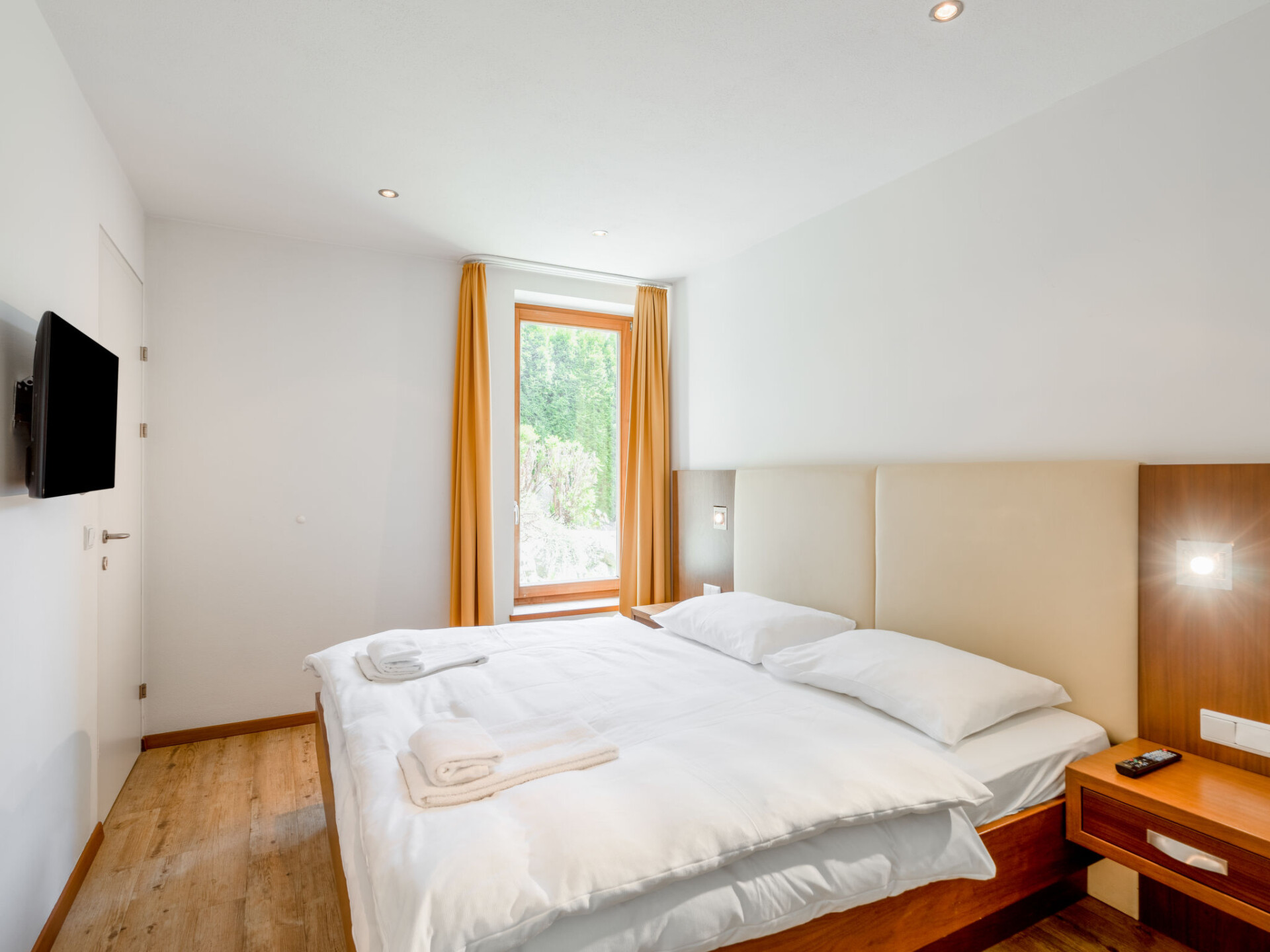 Appartement 3-kamers 75 m2. Licht, smaakvol en gezellig ingericht: 2 2-pers. kamers, elke kamer heeft Sat-TV (Flatscreen TV). Woon-/slaapkamer met 1 2-pers divanbed, eettafel, Sat-TV en Flatscreen TV. Berging. Open keuken (oven, afwasmachine, 4 keramische glas kookplaten, broodrooster, waterkoker, magnetron, elektrische koffiemachine, pads voor de koffiemachine (Nespresso) extra). Badkamer, bad/bidet/WC, aparte WC. Vloerverwarming. Terras. Terrasmeubelen. Uitzicht op de tuin. Ter beschikking: haardroger. Internet (WiFi, gratis). Niet rokers woning. Maximaal 1 huisdier/hond toegestaan. Rookmelders. De beschrijving betreft een voorbeeld van dit type woning in dit complex. 50616-001123-2020