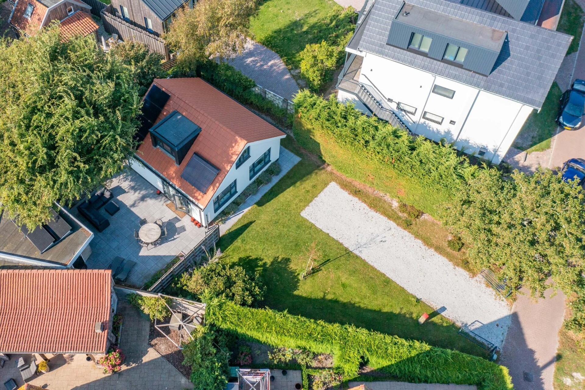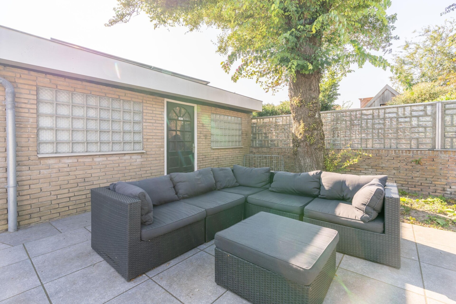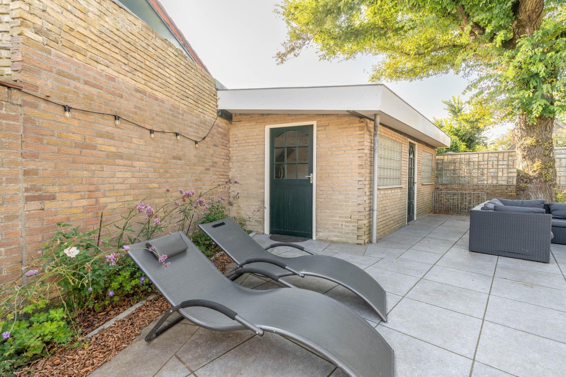 Vanuit de woonkamer kan je via de openslaande deuren op het terras en in de tuin komen. De tuin is volledig omheind en op het terras zijn er verschillende plekken om heerlijk te vertoeven. Tuinmeubilair en een parasol zijn aanwezig.