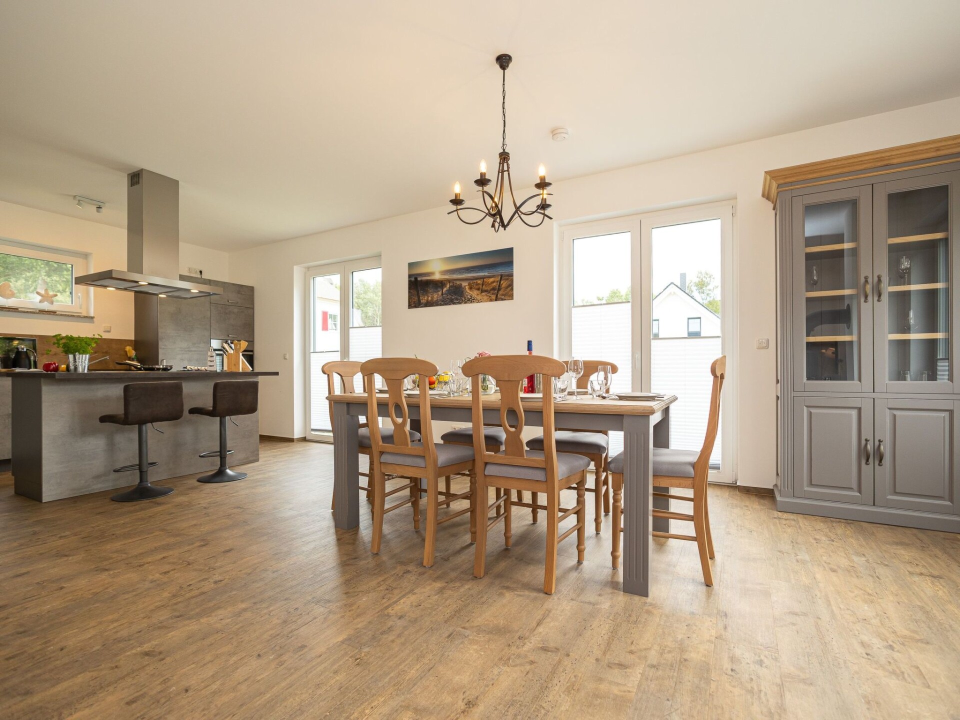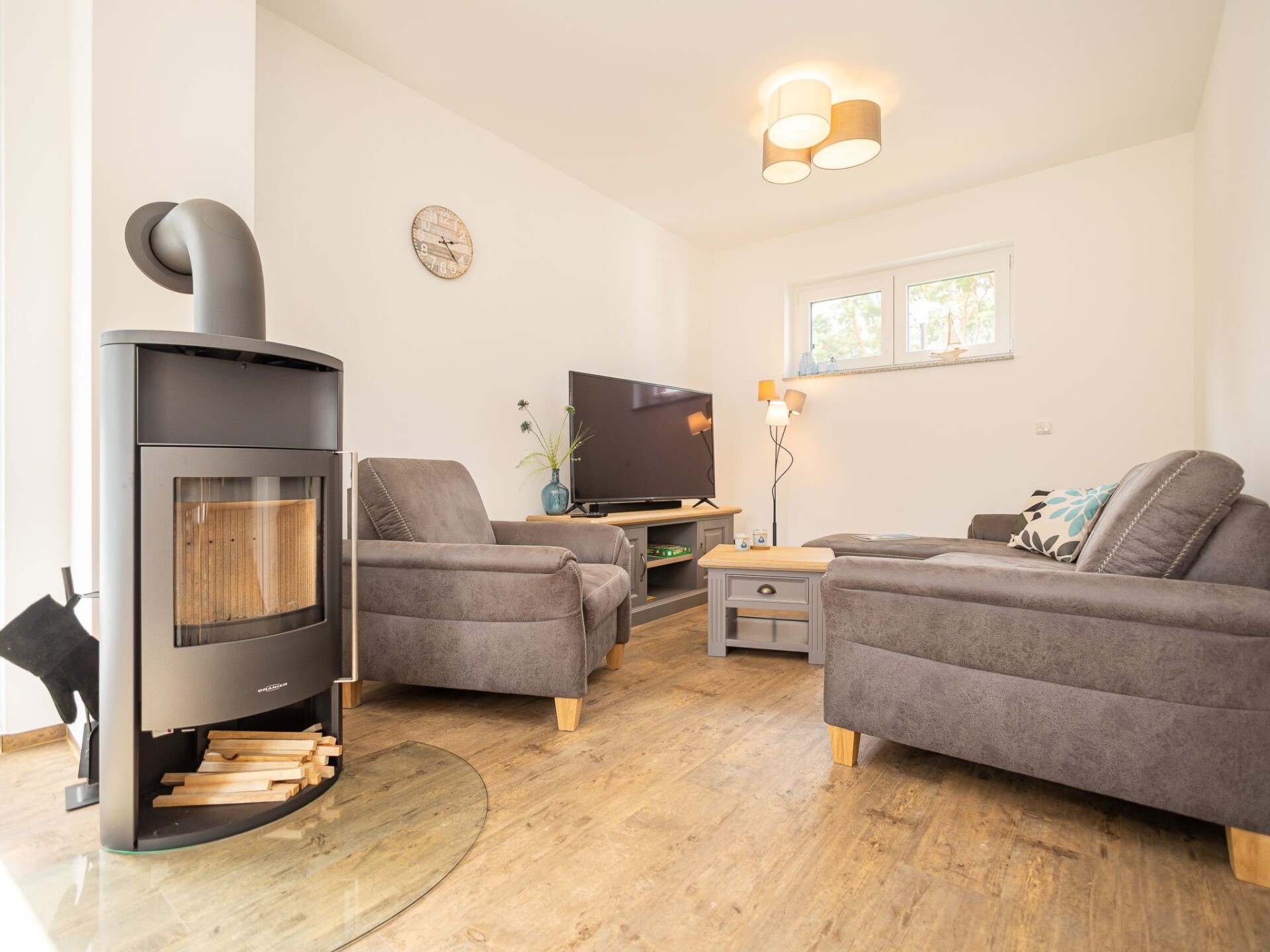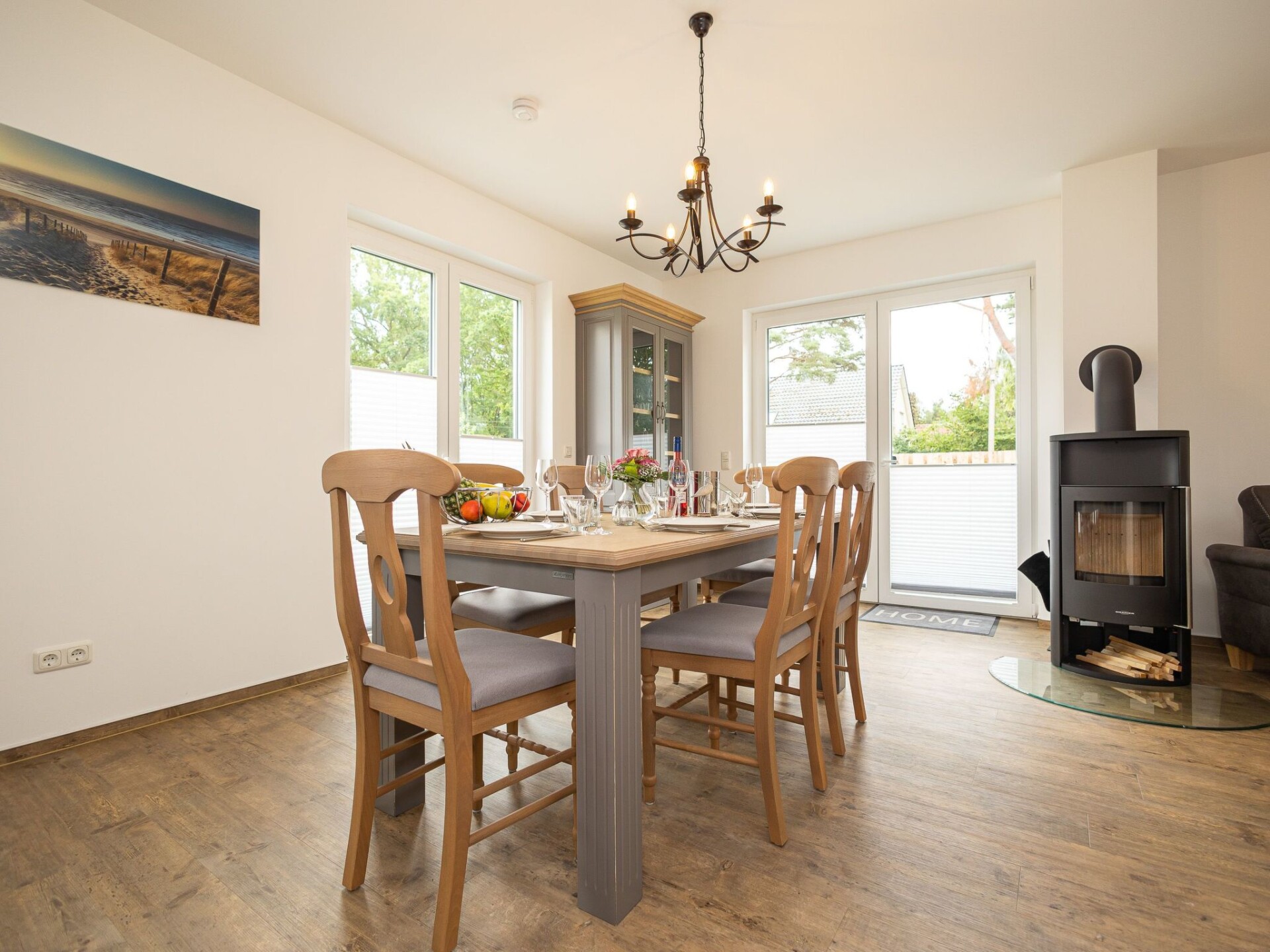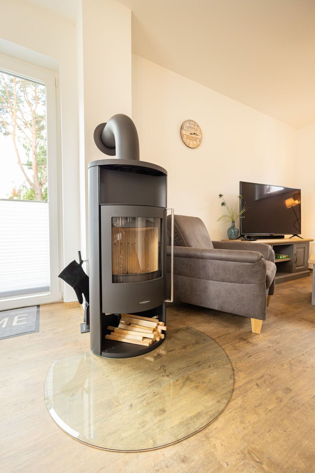 The holiday home, completed in August 2021 and equipped with modern facilities, is located on the edge of a small, cosy holiday home settlement on a 475 sqm plot in the middle of the "Vorpommersche Boddenlandschaft" nature reserve. The mild coastal climate, miles of fine sandy beaches between Zingst and Prerow on Fischland-Darß-Zingst and rustic forests, such as the Zingster Osterwald, which can be explored on foot or by bike, guarantee a relaxing and peaceful holiday at any time of year.The lovingly furnished holiday home offers space for up to 6 people to relax in three bedrooms, a spacious, attractively designed living/dining area and two bathrooms with shower and WC. The house is heated by a modern air heat pump through the central underfloor heating.The living/dining area is located on the ground floor and invites you to linger on approx. 38 square metres. Here you will find a fully equipped kitchen and seating for up to 6 people. The terrace and green areas are easily accessible through the floor-to-ceiling windows and can be used with the garden furniture provided.The living area has a cosy sofa, armchair and fireplace for an evening of TV or music. In the three bedrooms on the upper floor, there are two rooms with double beds and one room with a single bed and a folding wardrobe bed. Travel cots and highchairs are available on request.We ask for your understanding that the house is non-smoking.Friendliness is a matter of course for us as hosts. The current contact person for all questions and problems on site is the operator of the Café & Bar Wolli, which is located in the immediate vicinity of the holiday home area on the cycle path to Pruchten/Zingst ("Östlicher-Backstein-Rundweg", approx. 80 km around the Bodden).This circular route can be shortened by using the Bodden ferries or buses. The cycle path is also suitable for inline skates, roller skates and skateboards, jogging and Nordic walking. The Bodden is ideal for kitesurfing and SUP due to the wind conditions.The Bodden ferry departs from the harbour in Bodstedt several times a day during the season. You can shorten the wait with a tasty fish sandwich and admire the wooden fishing boats typical of the area, the Zeesenboote.The local beach is just a few minutes' walk away. Bodstedt offers holidaymakers and locals fresh fish from the local fisherman and other regional dishes in three small restaurants.Highlights in the area:- Störtebeker Festival on Rügen (75 km)- Climbing forest in Born (23 km)- Karls Erlebnishof in Rövershagen (41 km)- Marlow bird park (38 km)- Stralsund Ozeaneum or Oceanographic Museum (42 km)- Rostock / Warnemünde (61 km)