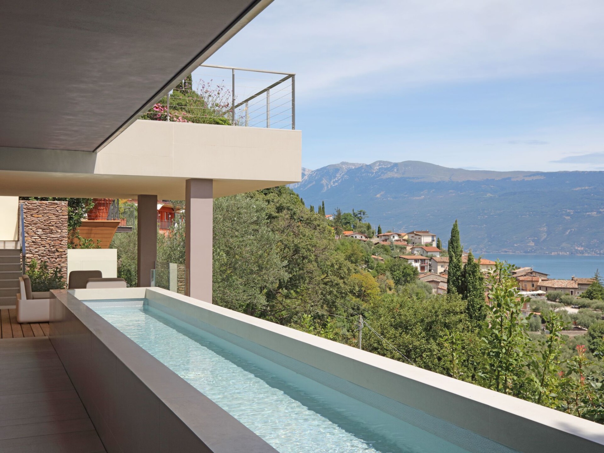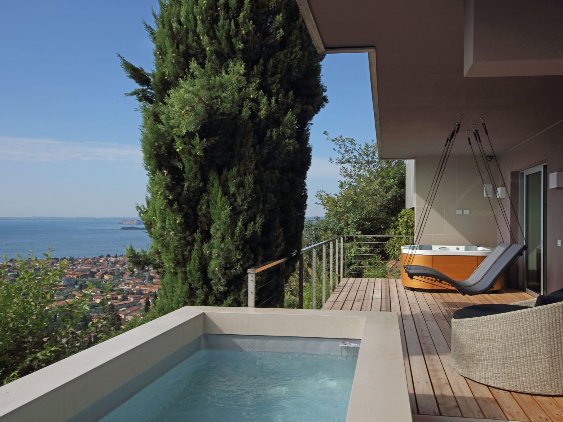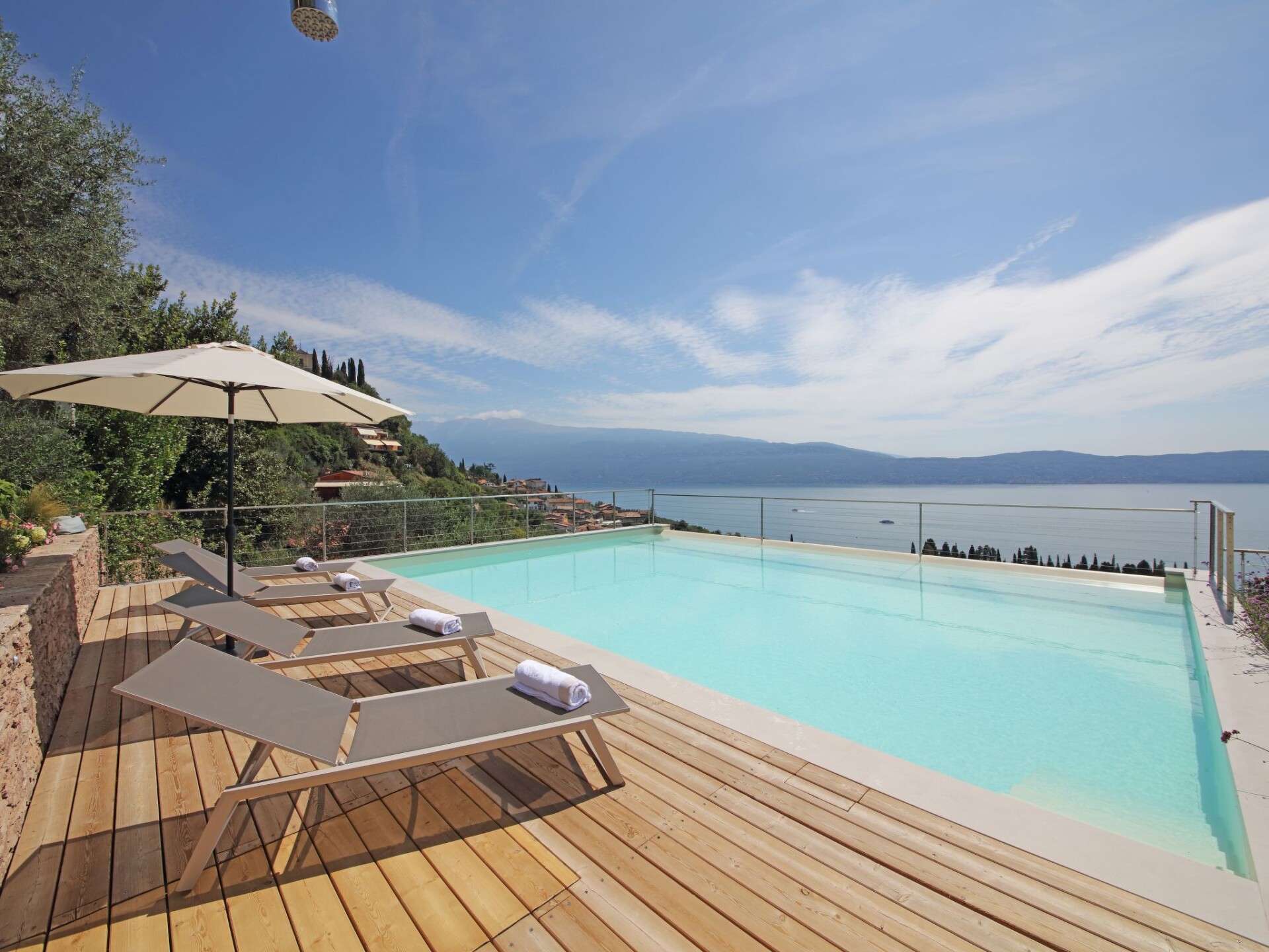 Villa Agave is a luxury villa with a modern style, furnished with exclusive and refined design pieces and with an incredible view of Lake Garda.Staying in the villa one can enjoy extreme privacy, being entirely surrounded by greenery, our guests are guaranteed absolute privacyImmersed in greenery and endowed with ample space, the villa features a wonderful infinity pool with panoramic views. The ideal setting for unforgettable aperitifs and moments of true relaxation.The living room is spacious, comfortable and bright. The open kitchen is equipped with everything you need to cook in complete autonomy during your stay: dishwasher, oven, microwave oven, induction hob, kettle, coffee machine and much more.The sleeping area consists of 4 bedrooms with double beds (each one has a bathroom: 3 with ensuite, one with a separate bathroom) two rooms have bunk beds and a single bed for our younger guests, for a total of 10 beds.The sauna with Turkish bath and heated whirlpool on the terrace complete this splendid villa, ideal for holidays with the family or in the company of friends.The villa has 3 parking spaces.CIR: 017187-CNI-00176- Heller Garden- 5,2 km- Vittoriale degli Italiani- 5,2 km- Bay of Sirens Park- 10 km- Jungle Adventure Park- 11,1 km- Gardagolf Country Club- 14,7 km- Wine Museum- 15,9 km- Caves of Catullus- 17 km- Oil Museum- 17 km- Vallio Terme- 17.4 km- Catullo Spa of Sirmione- 17.8 km- Sirmione Spa- 17,8 km Main attractions- Sirmione Castle - Rocca Scaligera- 18,1 km Nearest airports- Verona-Villafranca Airport- 36.1 km- Bergamo-Orio al Serio Airport- 71.1 km- Parma Giuseppe Verdi Airport- 96.1 km. IT017187B4BJBLUM6Q