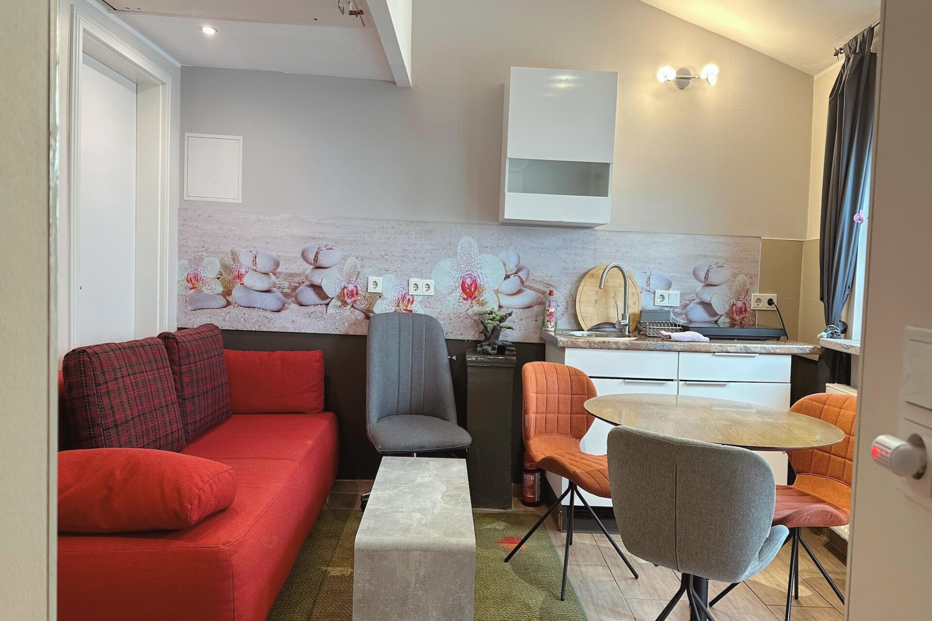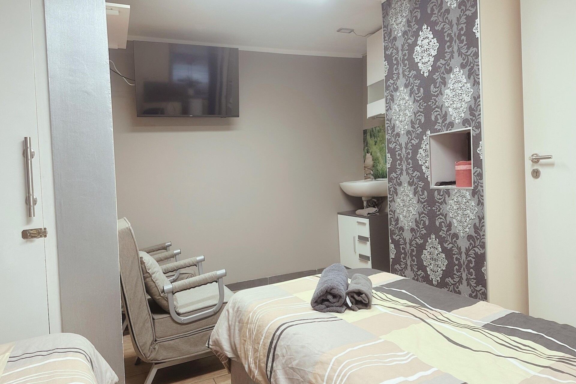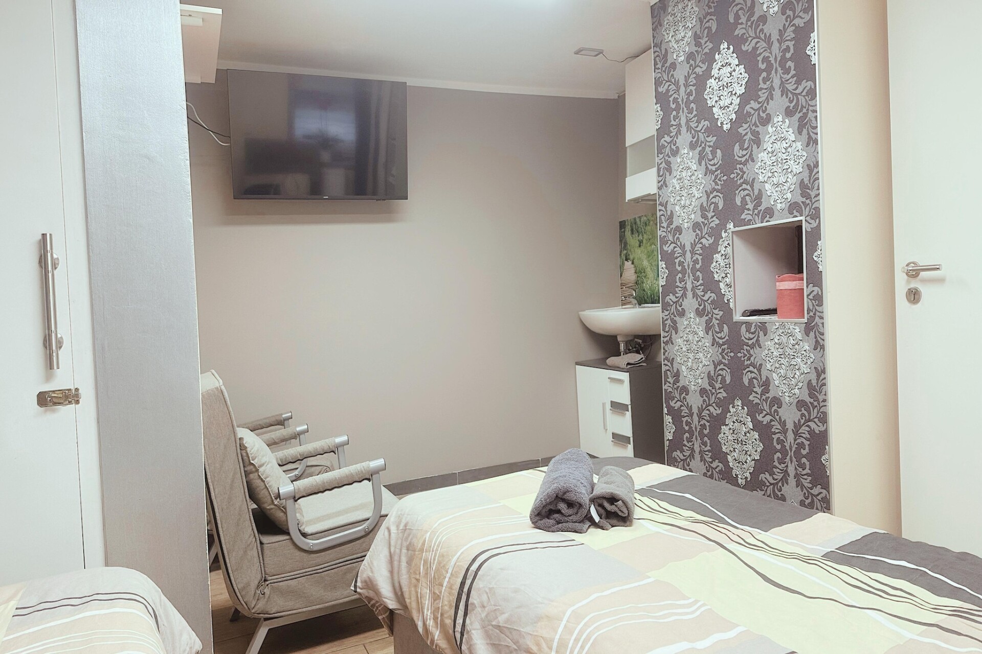 Het appartement beschikt over een lichte woonkamer met een comfortabele eenpersoons slaapbank, een tv en een eethoek – perfect om te genieten van maaltijden of te ontspannen na een dag vol ontdekkingen. De open keuken is volledig uitgerust met een koffiezetapparaat, waterkoker, magnetron, vaatwasser, koelkast en fornuis, waardoor u gemakkelijk alles kunt bereiden, van ontbijt tot diner. De aparte slaapkamer biedt een tweepersoonsbed of twee eenpersoonsbedden, afhankelijk van uw wensen, terwijl de moderne badkamer is voorzien van een douche, toilet, wastafel en haardroger.