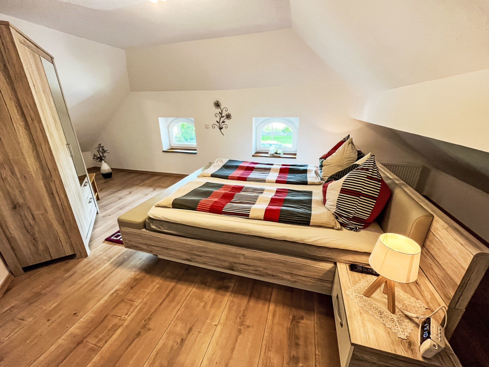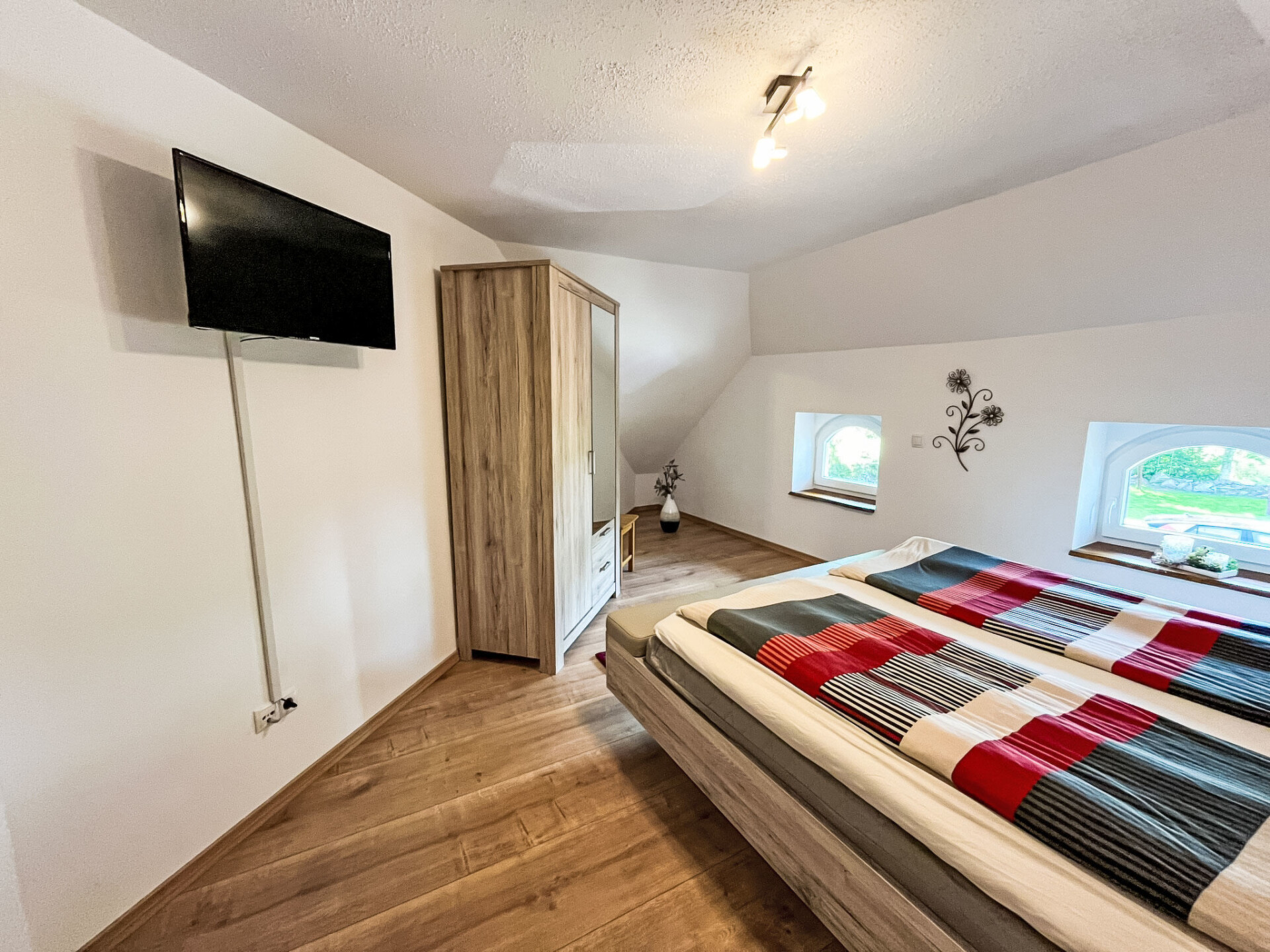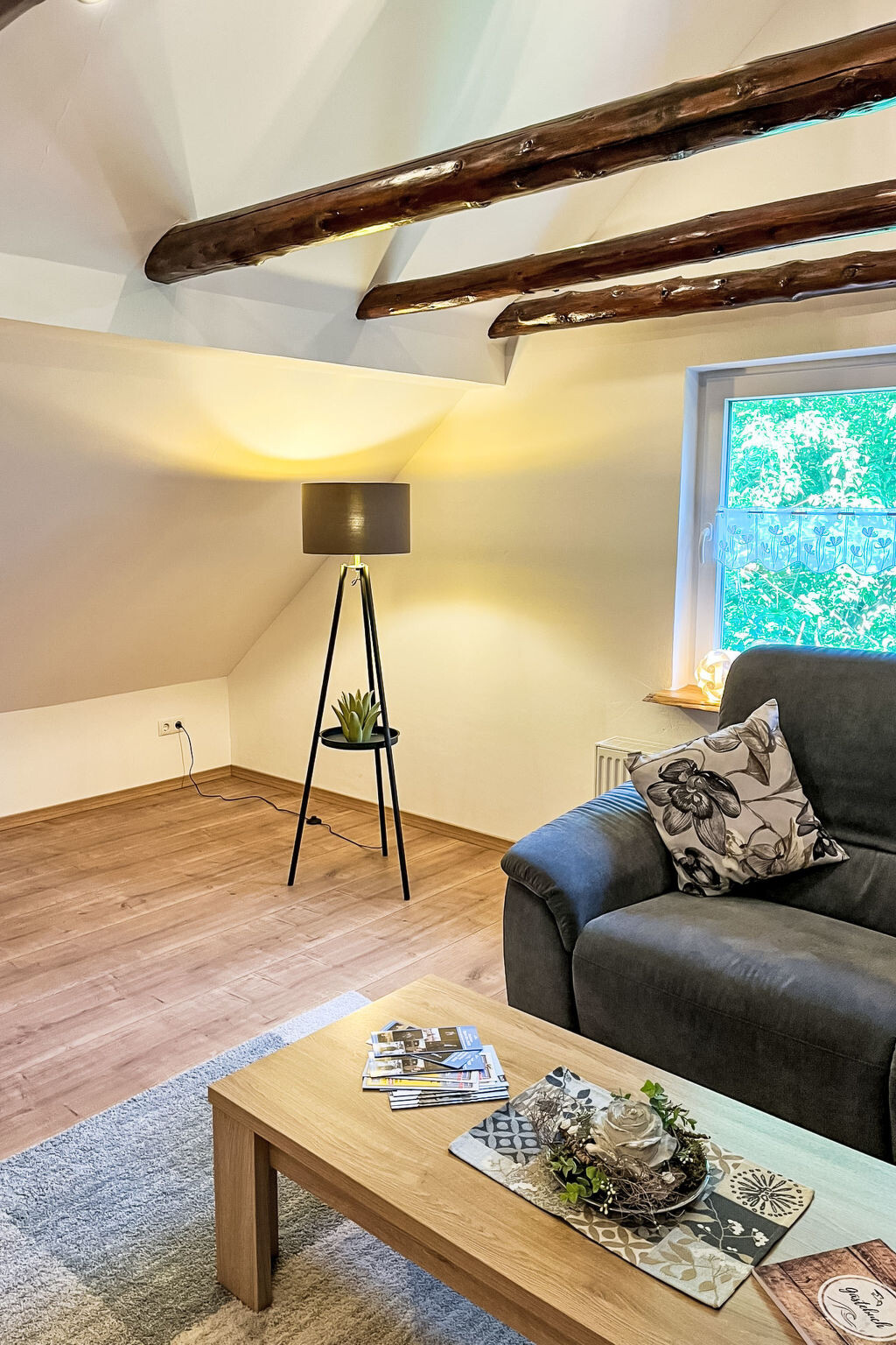 "Ferienhuus up Hütten", appartement 2-kamers 110 m2, op de bovenste verdieping. Gedeeltelijk afgeschuinde daken, gerenoveerd in 2025, smaakvol en gezellig ingericht: woonkamer met Sat-TV (Flatscreen TV). 1 kamer met 1 2-pers bed (2 x 90 cm, lengte 200 cm), Sat-TV (Flatscreen TV). Open keuken (oven, afwasmachine, 4 keramische glas kookplaten, broodrooster, waterkoker, magnetron, elektrische koffiemachine) met eettafel. Uitgang naar het balkon. Bad/douche/WC. Klein balkon, terras. Terrasmeubelen, balkonmeubilair. Ter beschikking: klamboe, kinderstoel, kinderbed (extra), haardroger. Internet (WiFi, gratis). Parkeerplaats bij het huis. Niet rokers woning. Privé ingang, rookmelders.