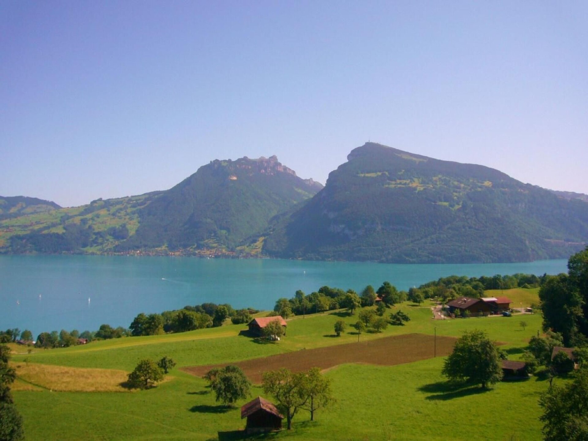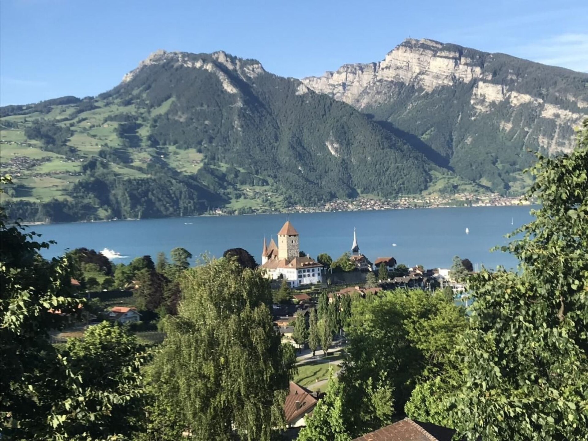 This spacious apartment is on the upper ground floor; light and airy with free WiFi. It consists of a spacious living/dining area with comfortable sofas and TV/DVD. The recently refurbished kitchen has oven/hob and fridge/freezer microwave and Nespresso Coffemaker. The double bedroom comprises a king size bed (can be twinned) and plenty of wardrobe space. There is a bathroom with WC, washbasin and bath/shower as well as a separate cloakroom with WC and hand wash basin, both newly renovated in 2020. The big balcony overlooks the lake and the mountains on the other side with morning sun as well as another balcony for evening sun. Outdoor chairs and lounger available.Although edge of the village and quiet it is but 200 m from a bus stop and 10 mins drive to the nearest town of Spiez. A great restaurant and food shop within walking distance.Other leisure facilities: beautiful hiking countryOther living room features (Living room1): Two sofas and Glastable plus two comfortable TV chairsNearby sports facilities: Mountain climbing, Golf course, Climbing, Mountainbiking, Bike tours, Rafting, Riding possibilities, Rowing, Skiing (alpin), Cross-country skiing, Tennis, Water skiing, Sailing