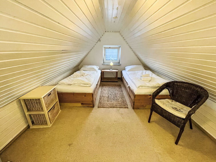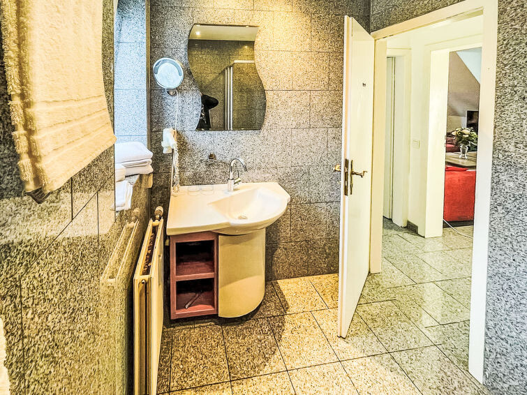 "Fewo 3 in ruhigem Haus", appartement 3-kamers 45 m2 op 2 verdiepingen, op de bovenverdieping. Comfortabel ingericht: woon-/eetkamer met Sat-TV (Flatscreen TV), radio, CD-speler en DVD. 1 kamer met 1 2-pers bed en Sat-TV (Flatscreen TV). Kookhoek (oven, afwasmachine, 4 keramische glas kookplaten, broodrooster, waterkoker, magnetron, elektrische koffiemachine) met bar, eettafel. Douche/WC. 2e Verdieping: (steile trap), 1 kamer met afgeschuinde daken, hoogte van het plafond 30 - 180 cm met 2 bedden en Sat-TV (Flatscreen TV). Verwarming. Ter beschikking: kinderbed, haardroger. Internet (WiFi, gratis). Parkeerplaats (1 Auto) bij het huis. Niet rokers woning. Maximaal 1 huisdier/hond toegestaan. Rookmelders.