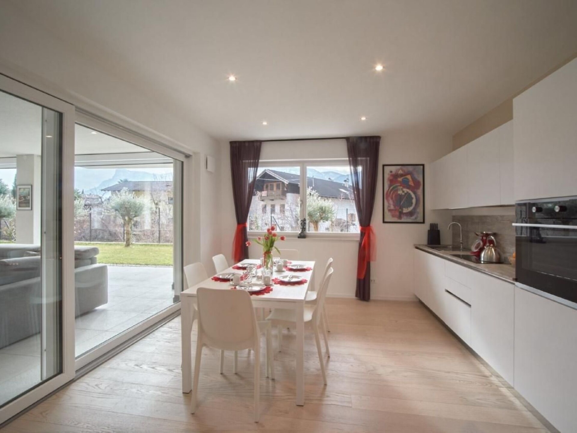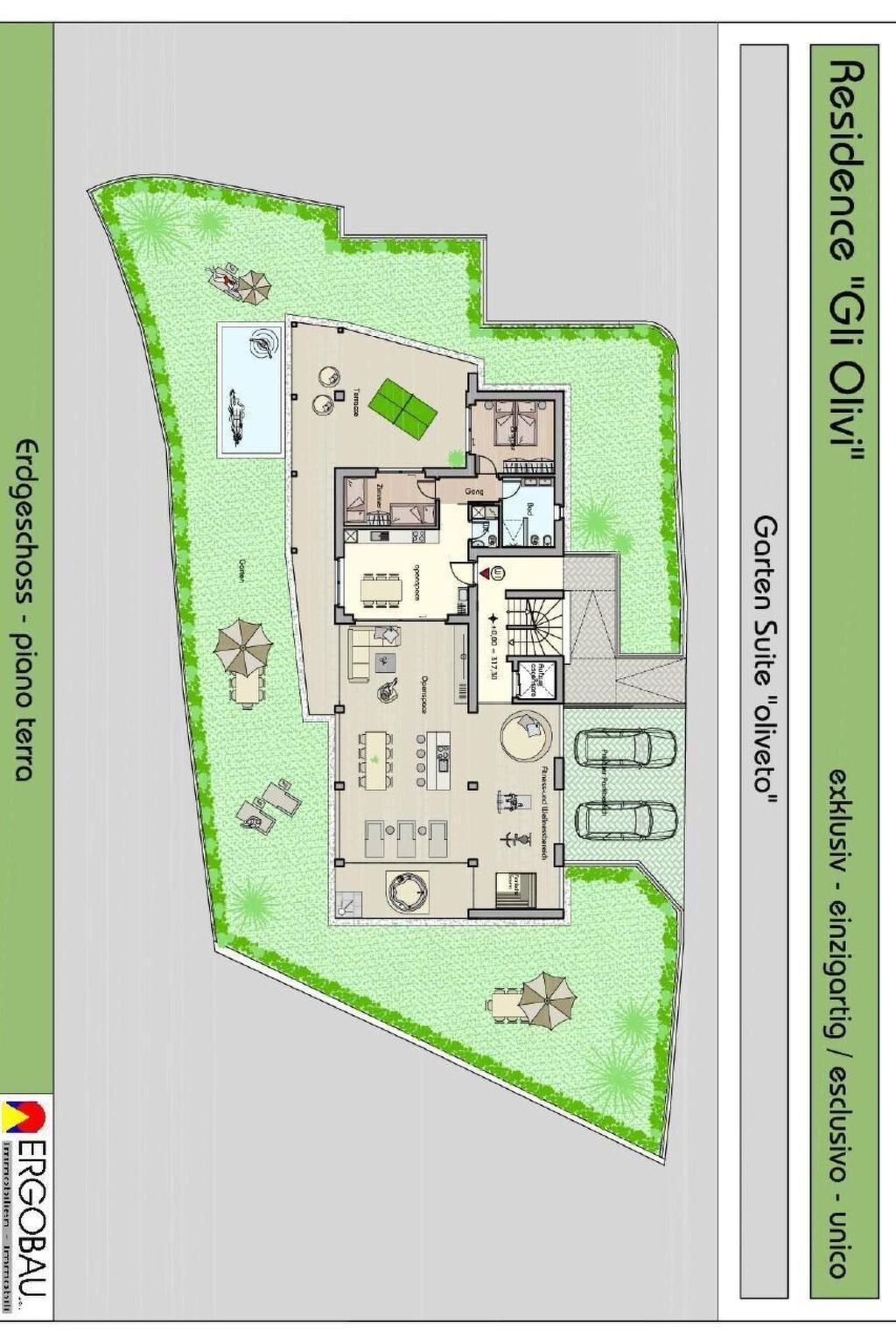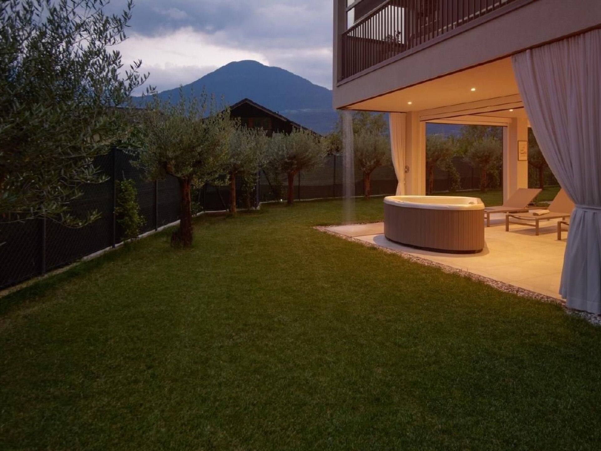 Maximaal 1 huisdier/hond toegestaan. " Residence Olivi " is located in the southern part of the Burggrafenamt, surrounded by green nature and can be reached via our private access road. In the southern part of the complex is the Aschlbach stream and to the north the property is protected by the mountain that leads to Merano 2000. The building consists of four residential units and is built according to the "Nature" climate house standard. The project with a modern language was planned in a traditional rural context while respecting nature. Due to the south-west exposure, the protection of the north winds, the entire building is surrounded by olive trees, which can only grow naturally in this part of the Burggrafenamt. The hillside, adjacent to the residence, is cultivated with a small olive grove of 40 olive trees. The Aschlbach stream, with the sound of water (white noise) flowing south of the residence, will have a relaxing effect on you and make your sleep easier. The two flat types "Garden & Wellness Oliveto" on the ground floor and "Penthouse & Wellness Oleario" on the upper floor both have a living room with kitchen, bathroom, main bathroom, two double bedrooms, large covered outdoor areas, which include an outdoor living room with kitchen / bar counter and wellness area with relaxation area. Each unit has two garages, a cellar and an outdoor parking space. "Garden & Wellness Oliveto" The flat extends over the entire ground floor, surrounded by a 440 m² garden, olive trees and cypresses. On the outside there is also a herbarium with basil, rosemary, chives, etc. to add extra flavour to your dishes. Your garden is maintained daily by our robot so that you always have an English lawn. The interior area ( 70m² ) consists of a living room with kitchen, two double bedrooms, bathroom and main bathroom. The covered outdoor area ( 170m² ) is divided into a living and wellness area. Outdoor area: The covered living area has an outdoor sofa, 65'' TV area, table 6 seats, outdoor kitchen, bar area. The wellness area consists of a Finnish sauna, a treadmill, an exercise bike, a whirlpool and a relaxation area.Private mini pool "Dolcevita" (unheated) only for the Apartment Garden, unique in South Tyrol from April/May to September/October, depending on weather conditions.CANCELLATION:A deposit must be paid in cash when the flat is handed over. This deposit will be refunded by bank transfer after the flat has been cleaned. Entire accommodation unit: - Climate house " Nature " - Underfloor heating - Automatic decentralised aeration and final ventilation - Bus system - Ceiling lighting with Led - Soundproof windows - Pictures and sculptures - Air conditioning with heating function - House key 2 copies, remote controls garage 2 copies, key cellar and power room Entrance area: - Wardrobe Teppic Living area - kitchen: - Dining table with six chairs - kitchen - Dishwasher - Taps - Refrigerator - Freezer - Extractor hood - Washing machineWeber electric barbecue - Guest book - games - books - Sonos sound system - tablet - 3 * Remote control air conditioning - 1* Remote control outdoor markings - Thermometer - 2 glass water jugs - 1 plastic water jug - Curtains, drapes - 6 cutting boards small - 6 large chopping boards - Laundry hanger - 4 large wooden saucers - 6 large saucers fabric - 1 cutting board professional - 2 Bread basket small and large - 3 salt bowls 2 round, 1 square - 2 rugs - 1 metal fruit basket - 1 champagne holder - 1 funnel - 20 pocket clips - 1 dustpan with broom - 1 iron 1 Bűgelbret - 16 flat plates Omnia 27 - 16 Dessert plates Omnia 22.5 - 16 deep plates Omnia 28 - 16 coffee cups Omnia - 16 saucers coffee Omnia - 16 Mocha cups Omnia - 16 saucers mocha Omnia - 8 Cereal bowl Rotondo 15 - 2 Handle pan Barazzoni 28 - 2 Barazzoni saucepan 24 - 12 Water glass Barazzoni San Remo - 6 Drinking glass Cortina 25cl - 6 Drinking glass Accademia 46cl - 1 ashtray - 2 WMF salad servers - 1 square grater - 1 peeler WMF - 2 salt/pepper mill Westmark - 2 ladle Brabantia - 2 slotted spoon Brabantia - 2 turners Brabantia - 1 spaghetti tongs Brabantia - 1 corkscrew - 1 Brabantia tin opener - 1 whisk - 2 cooking spoons - 2 wooden spoons with hole - 8 melamine egg cups - 6 Guzzini drinking glasses - 1 Mocca 6Tz Forever - 1 Pavoni coffee machine - 1 cream and sugar mixer - 1 stainless steel pasta strainer - 1 hand shovel + whisk - 1 salad spinner Emsa - 2 Gefu cutting board - 1 flute pot Eva - 2 knife block Brabantia - 1 lemon squeezer WMF - 1 Toaster Philips - 1 Melitta coffee machine - 1 egg boiler - 2 cake forks WMF - 4 cutlery WMF Miami - 12 wine glass Bordeaux goblet - 12 wine glass red wine - 12 champagne glass - 2 pot set WMF Provence Plus - 2 Slip rugs - 1 clothes pegs with basket - 1 carpet entrance door - 4 towel rails shower - 2 soap dispensers 1 teak shower tray - 1 cowhide rug - 1 ironing board - 1 clothes horse - Dried flowers 6 times - Bucket with mop - extension cord - Pepper - salt - rubbish bags Day WC: - WC - Wash basin - Washing machine - Wall cupboard - Vanity unit Washbasin - Toilet roll holder - Toilet roll - Toilet brush - Ceiling lighting - Mirror lighting - Towels - Soap Bathroom: - WC - Toilet roll holder - Toilet paper - Toilet brush - Bidee - Washbasin with vanity unit - Walk-in shower - Toilet fume cupboard - wall mirror - towel radiator - towels - Bath rug - 1 shower wall scrubber - Soap dispenser - Shower mat - Towel hook - Bathrobe - Large towel - Small towel - Soap - Hair dryerDouble room 1: - Double bed with separator - wardrobe - coat hanger - Bedside chest of drawers - Night lamp with reading lamp and USB connection - pictures - Smart TV 32" - Duvet covers with pillowcase - Duvets - Pillows - Sheets Double room 2: - 2 single beds - wardrobe - coat hanger - Bedside chest of drawers - Night lamp with reading lamp and USB connection - pictures - Smart TV 32" - Duvet covers with pillowcase - Duvets - Pillows - Sheets Outdoor area: - Divan with sleeping accommodation - Livi