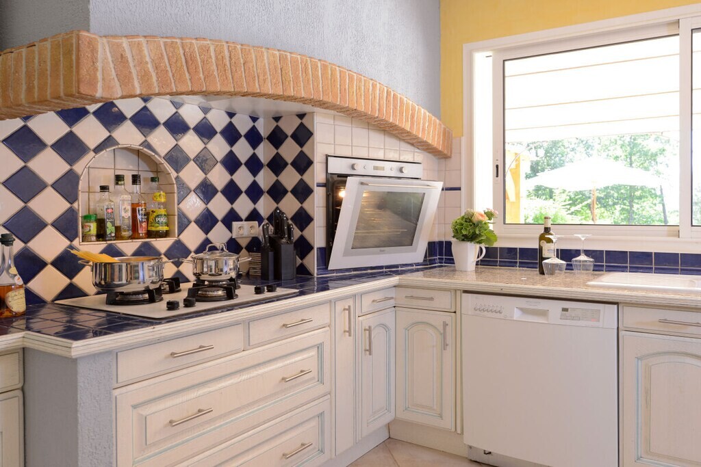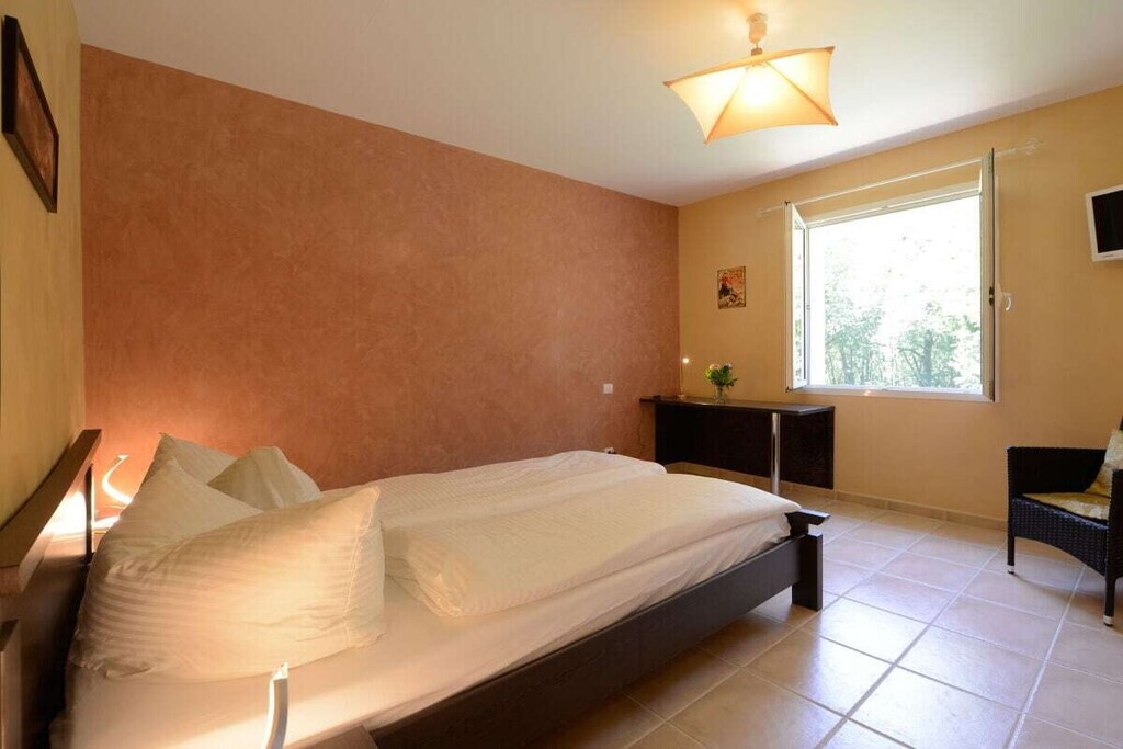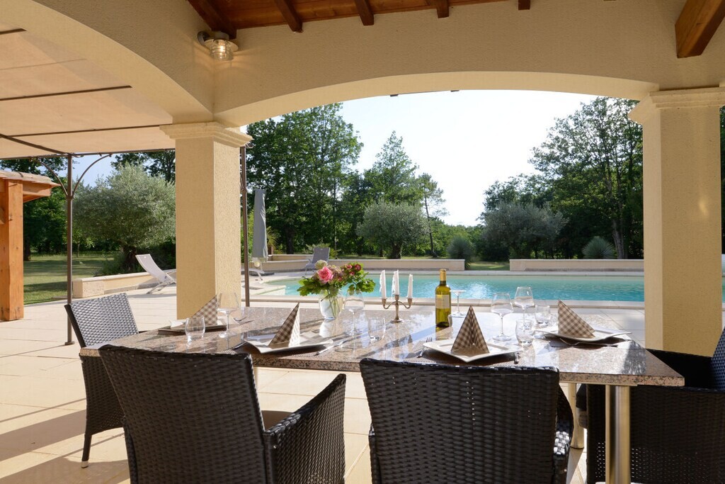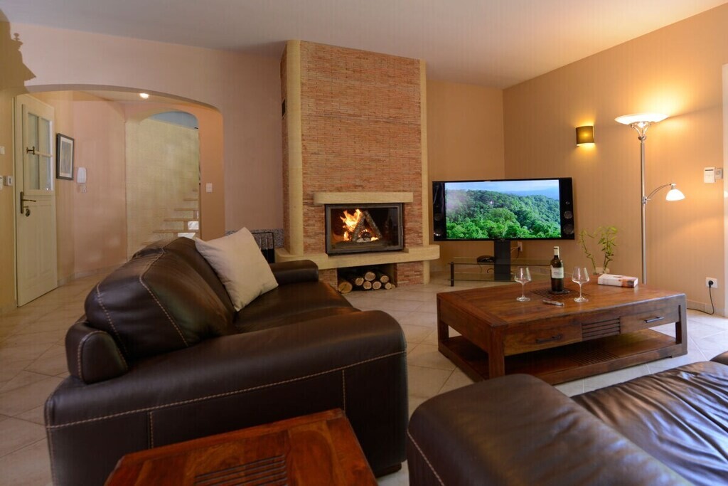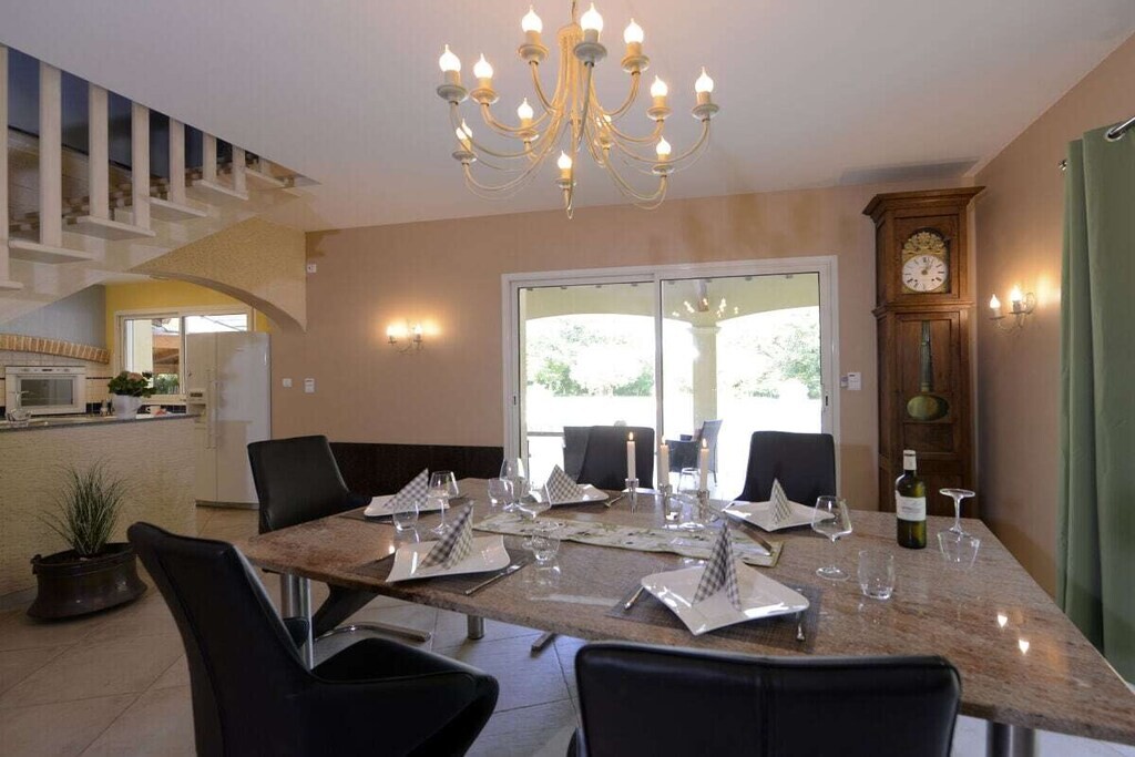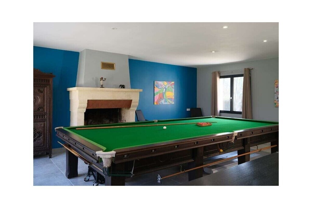 Voor huisdieren biedt een "Dog House"-gedeelte zowel zonnige als schaduwrijke plekken voor veilige, begeleide verblijven. Het hoofdhuis beschikt over een ruime woon- en eetkamer met antieke meubels, een leren bank bij de open haard en een goed uitgeruste Franse landelijke keuken met moderne voorzieningen. De villa heeft vier slaapkamers, waaronder een master suite met en-suite badkamer en inloopkast. Buiten kunt u genieten van het privézwembad, tuinhuis, BBQ, terras en privéparkeergelegenheid. Deze villa biedt luxe, ontspanning en privacy voor een onvergetelijk verblijf.