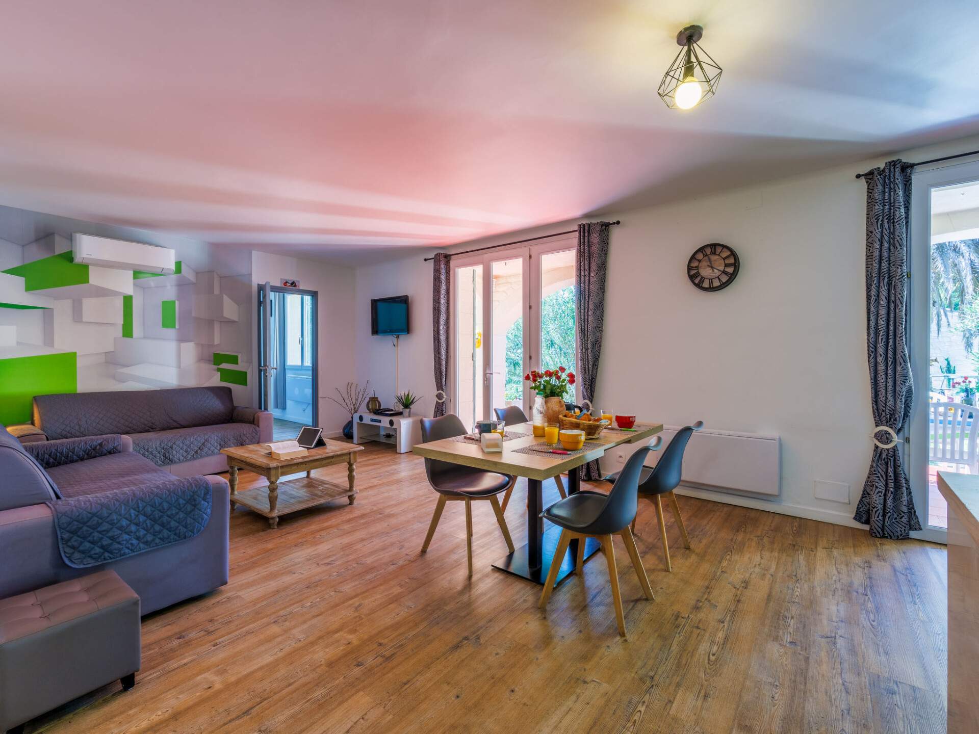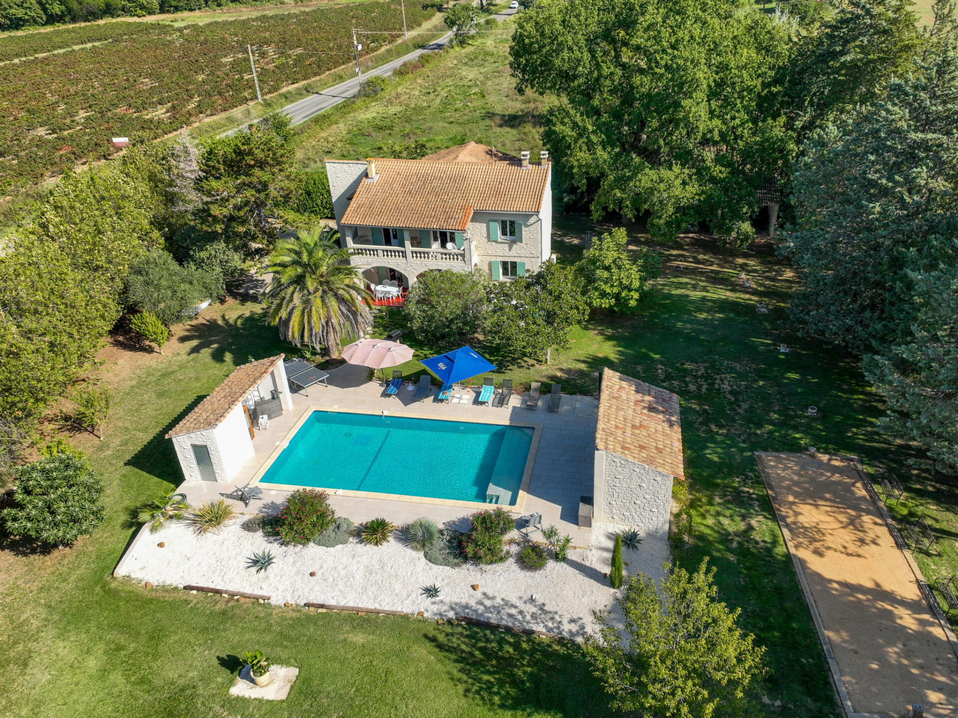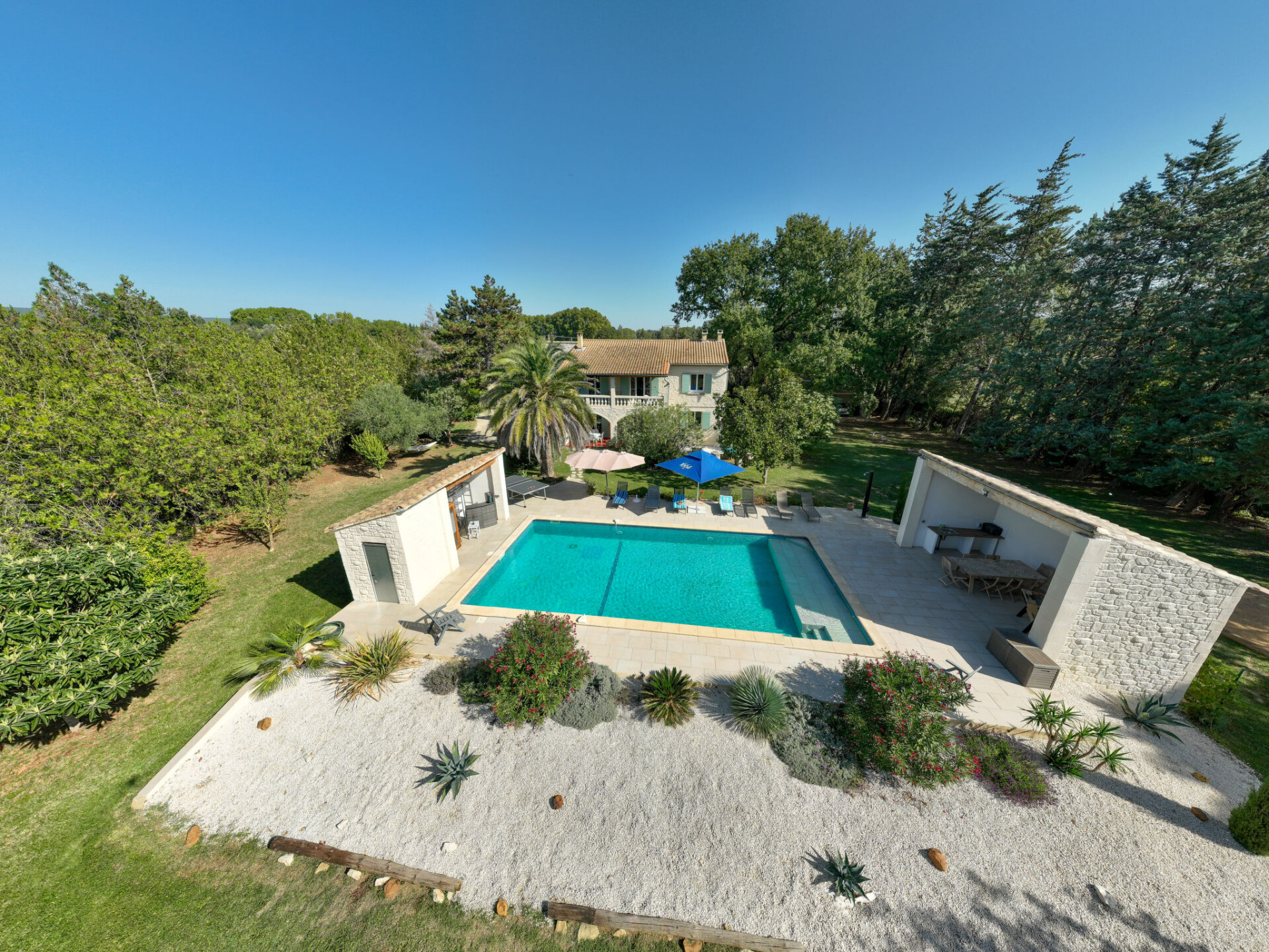 Uzès: Mooi eengezinswoning "L'Aouzet", van 2 verdiepingen, omgeven door bomen. Aan de rand van de plaats, 3 km van het centrum van d'Uzès, geïsoleerde, rustige ligging, 73 km van zee, 10 km van het meer, op het zuiden. Voor alleengebruik: verzorgde tuin 3.000 m2 (omheind) met gazon en planten, openluchtzwembad hoekig, verwarmd, geen inkijk (12 x 6 m, 100 - 190 cm diepte, seizoensgebonden beschikbaarheid: 01.Mei. - 15.Okt.) met alarminstallatie. Buitendouche, poolhouse, jeu de boules, badminton, tuinmeubelen, barbecue, onderhoud zwembad door de eigenaar/tuinman. In het huis: tafeltennis, tafelvoetbal, trampoline. Parkeerplaats (voor 3 auto's). Winkel 3 km, levensmiddelenwinkel 3 km, supermarkt 3 km, bakkerij 3 km, bushalte "Mairie" 1.5 km, meer (zwemmen) "Lac de la Bouscarasse" 10 km. Jachthaven 36 km, golfterrein (9 holes) 6 km, tennis 3 km, manege 15 km. Attracties in de buurt: Arènes de Nîmes 27 km, Vignobles de Tavel 24 km, Le Pont du Gard 15 km, Palais des Papes d'Avignon 40 km, Musée 1900 6 km, Musée du Bonbon 5 km. Bekende meren kunnen gemakkelijk worden bereikt: Lac Dupuy 10 km. Wandelgebied Sentier des Capitelles 2.5 km, La Vallée de l'Eure à Uzès 1.4 km, Le Belvédère des Garrigues 1.5 km. Baby uitrusting (incl.).