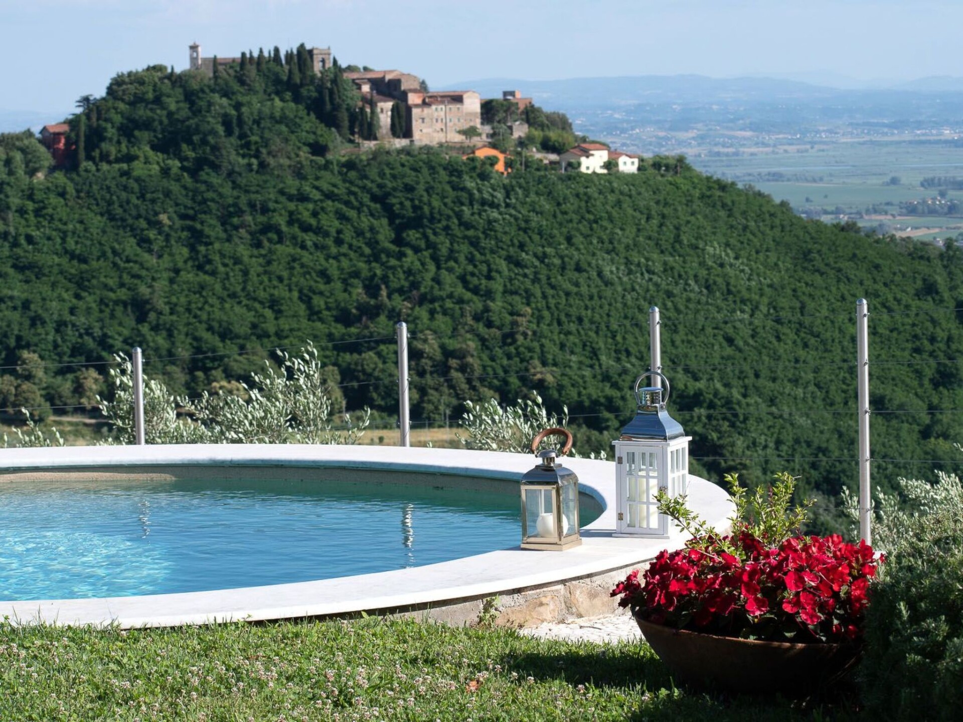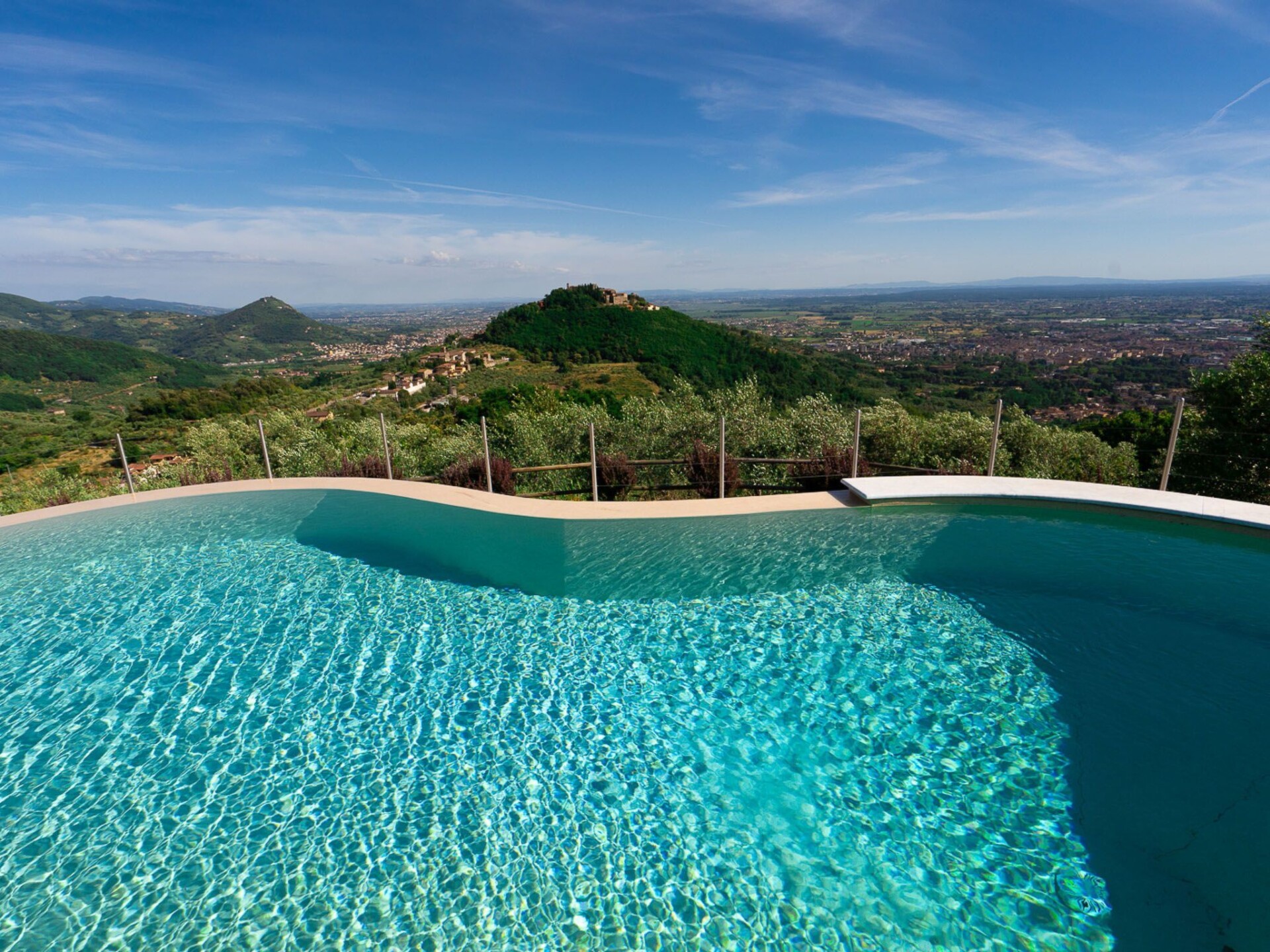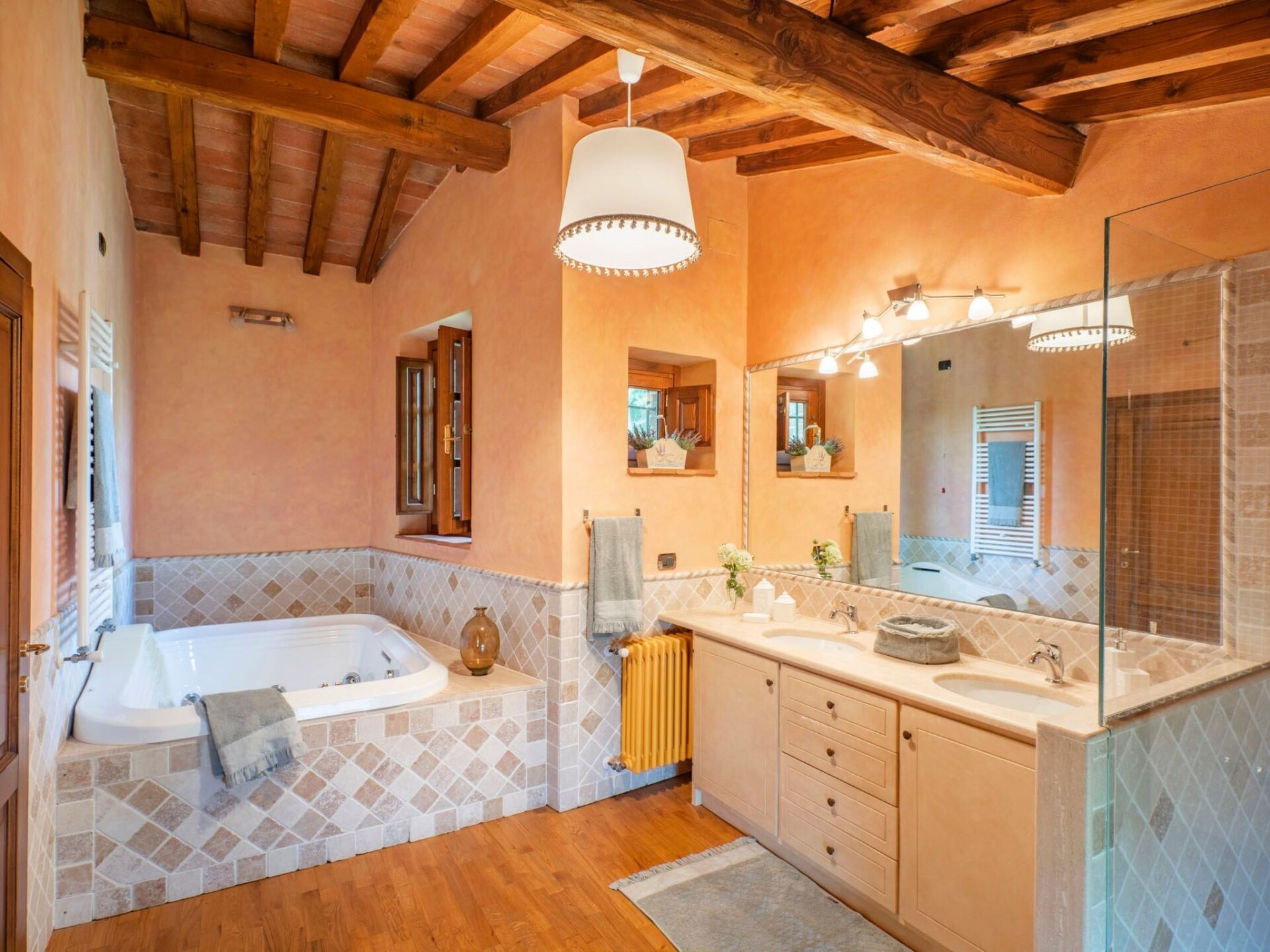 De villa is omringd door een grote omheinde tuin met buitenzwembad met panoramisch uitzicht en hydromassagezitplaatsen, waar men zich kan ontspannen ondergedompeld in het groen en de rust van het platteland.