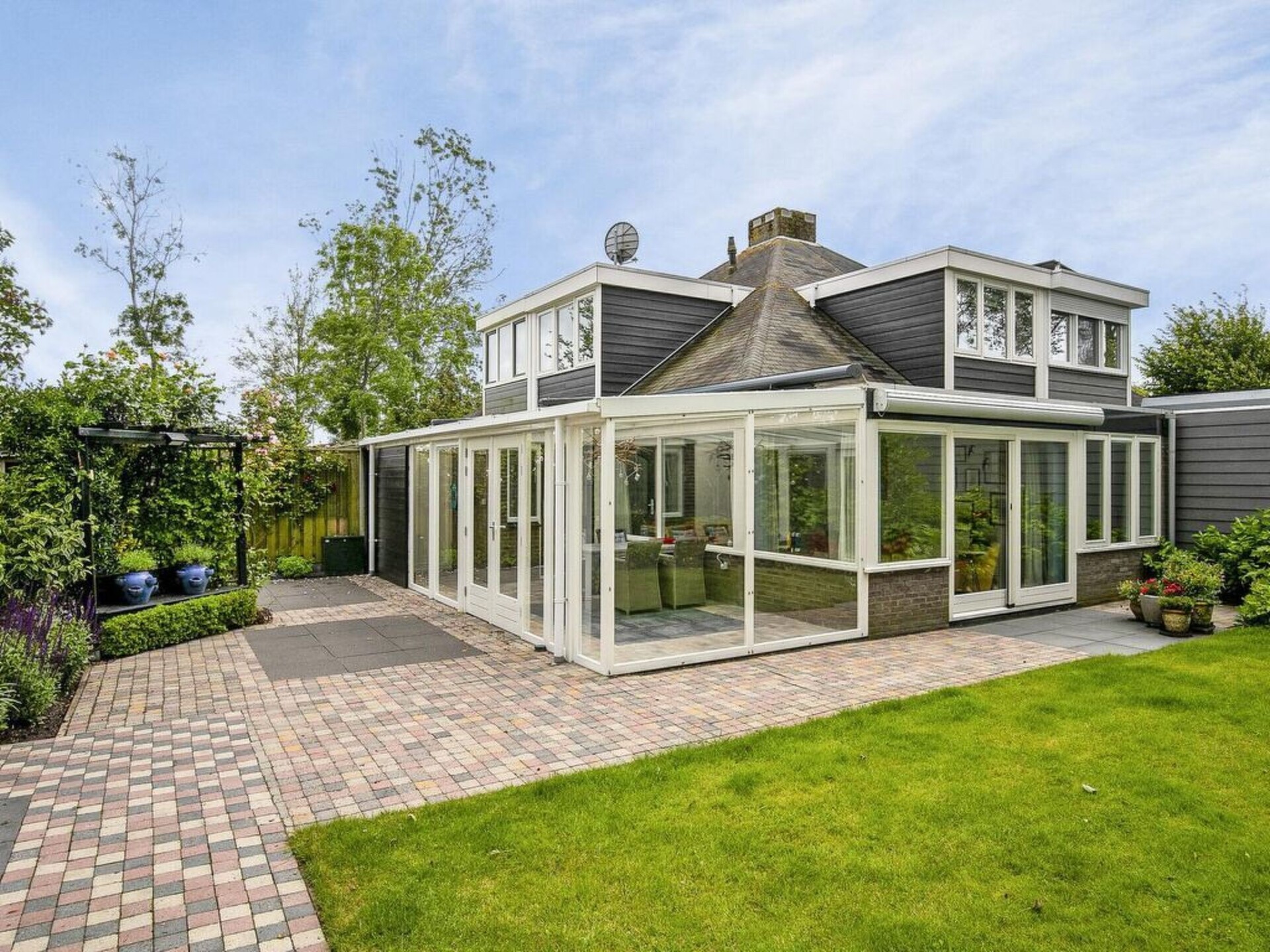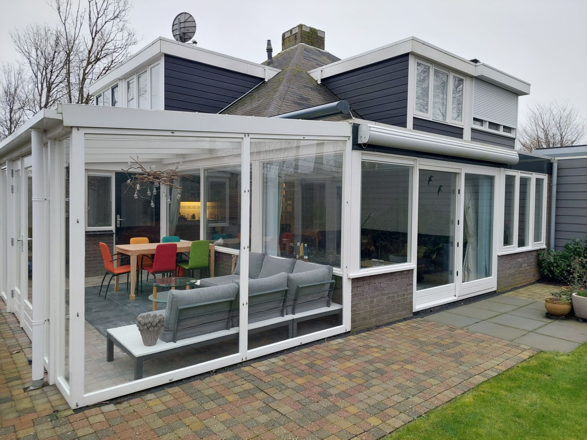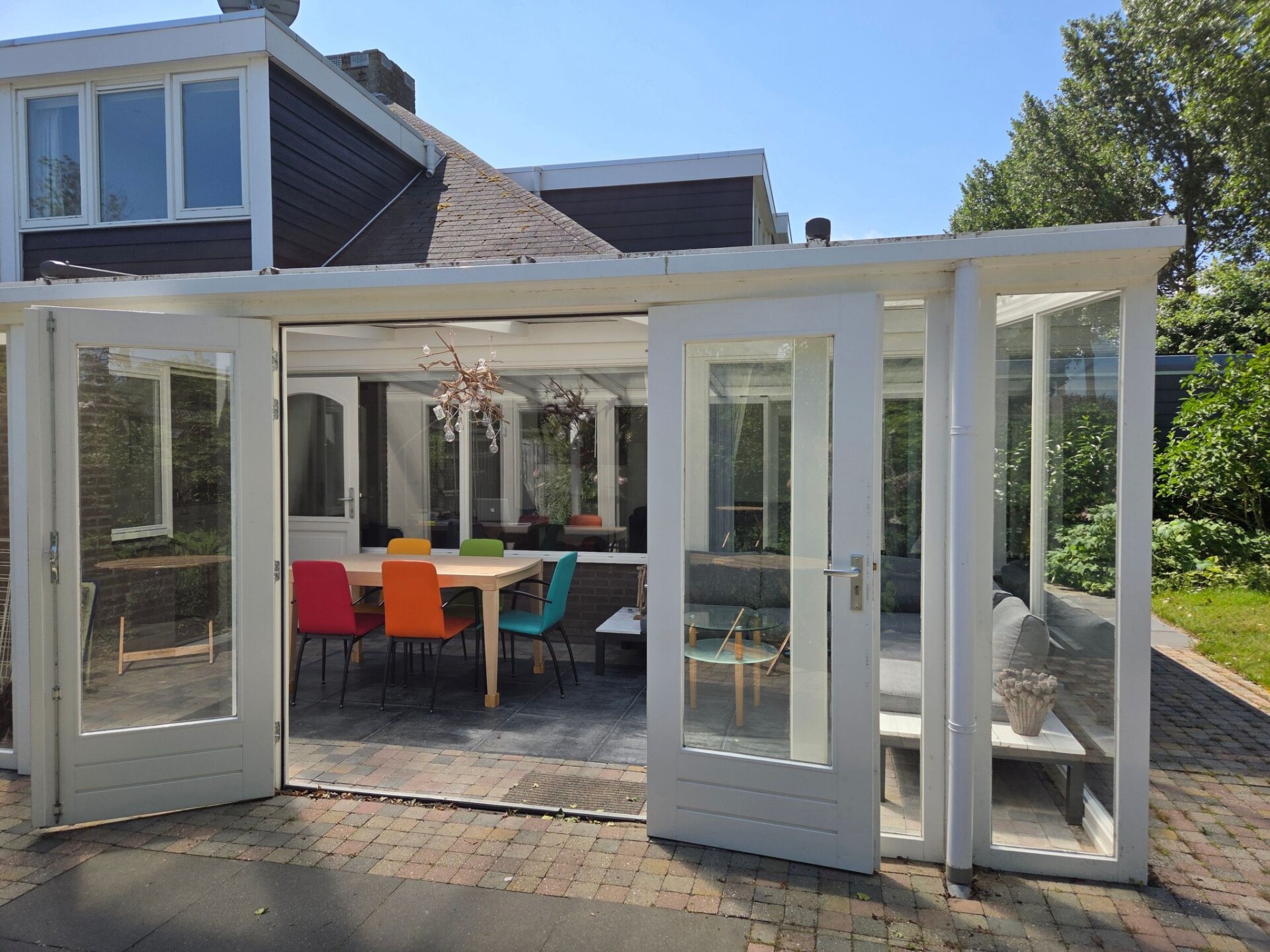 Via de tuinkamer / veranda bereik je de woning. Dit is een heerlijk ruimte om te verblijven en te genieten met zicht op de tuin. Voor de warme dagen is er een elektrische zonnewering over het dak voorzien. De tuinkamer is niet voorzien van verwarming.