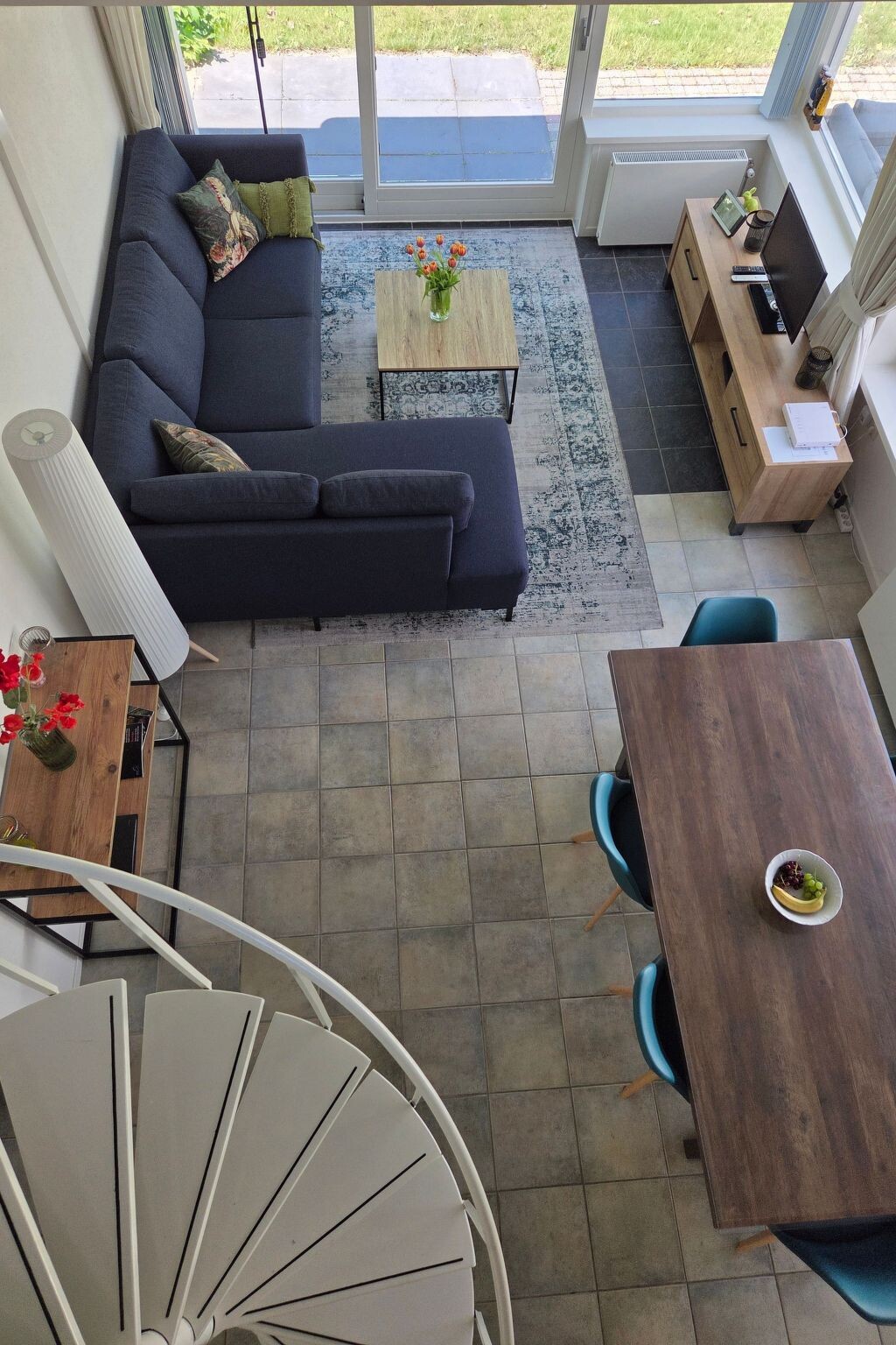 In de woonkamer staat een eettafel met 6 stoelen. Ook een kinderstoeltje is beschikbaar. De zitruimte met smart-tv is ideaal om te ontspannen na een drukke dag. In de hele woning is wifi voorzien waardoor thuiswerken ook een mogelijkheid is.