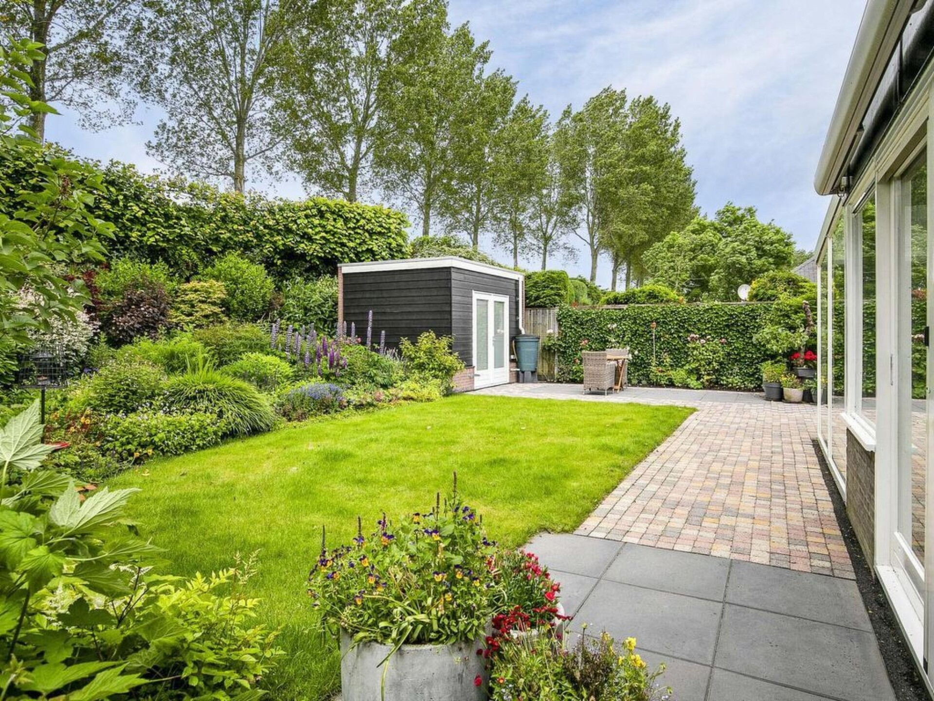 De zonnige tuin is voorzien van een terras met sierbestrating, siertuin en een luxe stenen berging met dubbele deuren. Deze is ideaal voor het opbergen van fietsen, duikmateriaal e.d. De berging kan slotvast achtergelaten worden en is voorzien van licht en elektriciteit. Er is eveneens terrasmeubilair aanwezig om te genieten van de zon. Voor wie liever wat schaduw heeft, is er ook een zonneluifel voorzien.