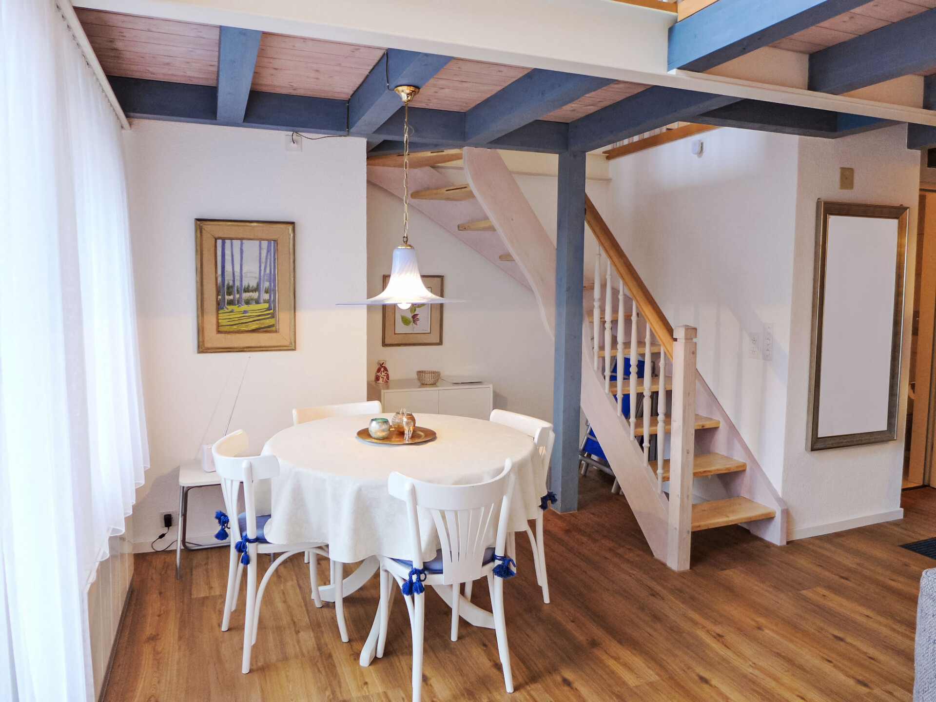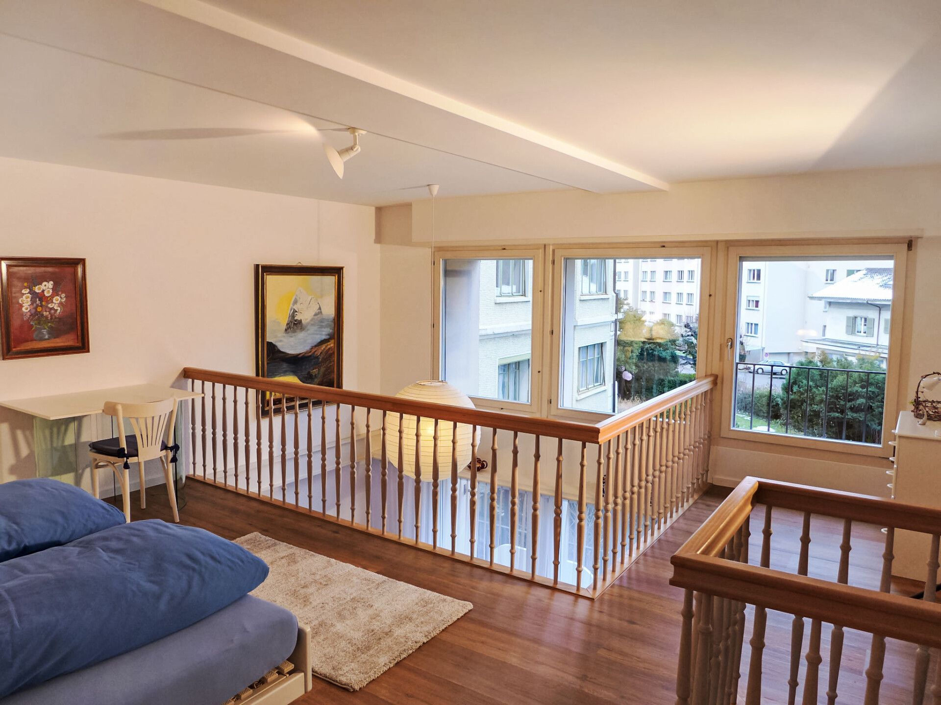 "Galeriestudio Jungfraublick", studio 1-kamer 58 m2 op 2 verdiepingen op de 1e verdieping, op het zuiden gelegen. Ruim en licht, zeer comfortabel en smaakvol ingericht: open woon-/eetkamer 17 m2 met panoramavenster met Kabel-TV, Flatscreen TV, radio, elektrische verwarming en elektrische rolluiken. Uitgang naar het balkon. Keuken 5 m2 (3-pits kookplaat, oven, afwasmachine, broodrooster, waterkoker, magnetron, elektrische koffiemachine, pads voor de koffiemachine (Nespresso) extra). Bad/WC. Bovenverdieping: (steile trap) groot galerij 23 m2 met panoramavenster met 1 2-pers bed (2 x 90 cm, lengte 200 cm), TV, Kabel-TV en elektrische rolluiken. Balkon 7 m2, op het zuiden gelegen. Balkonmeubilair. Mooi uitzicht op de bergen en de plaats. Ter beschikking: strijkijzer, haardroger. Internet (Internet (WiFi), gratis). Niet geschikt voor kleine kinderen. Niet rokers woning, geen parkeerplaats. Rookmelders.
