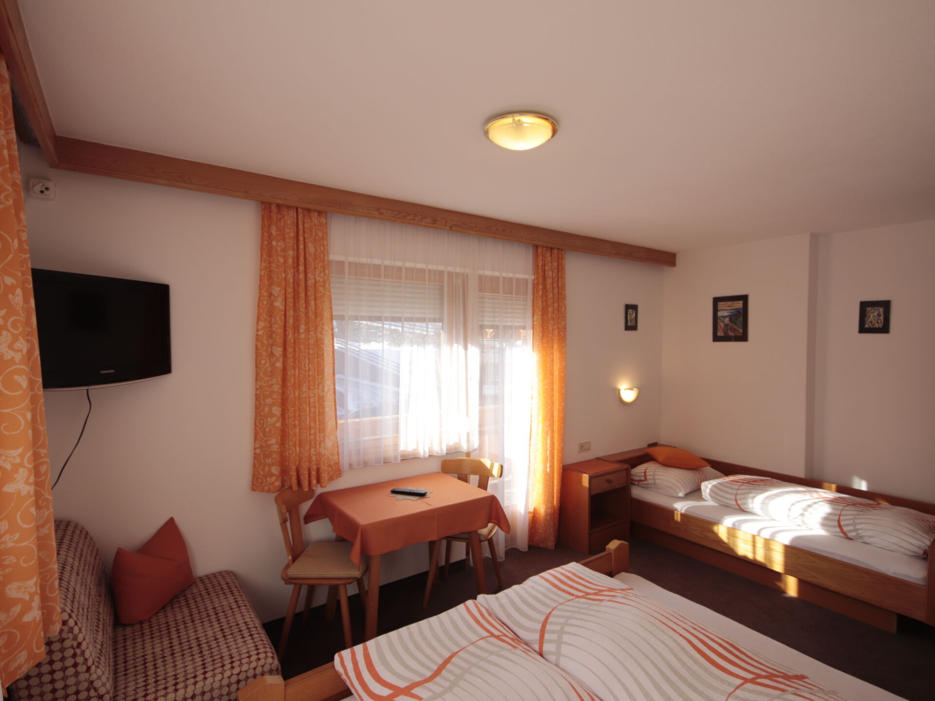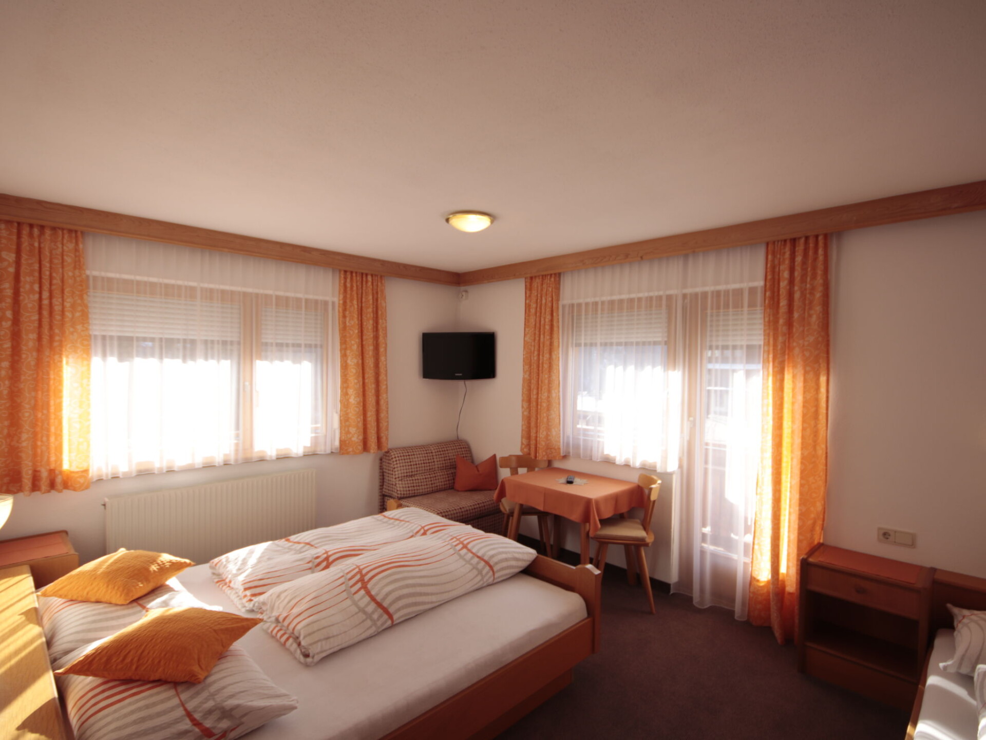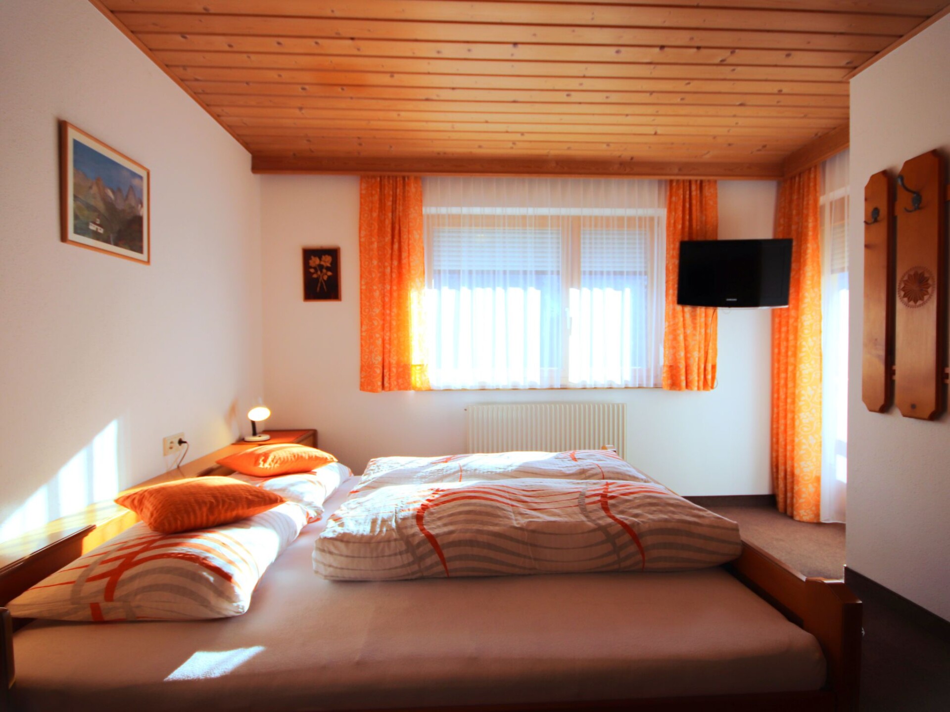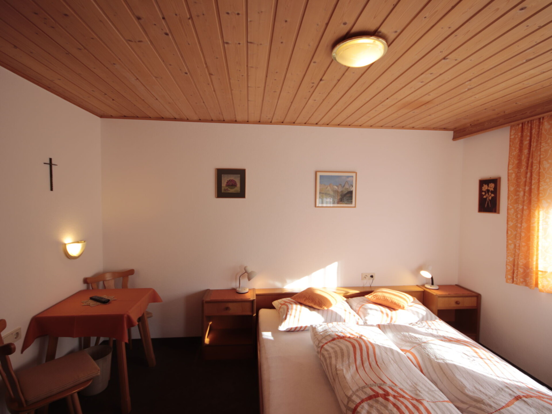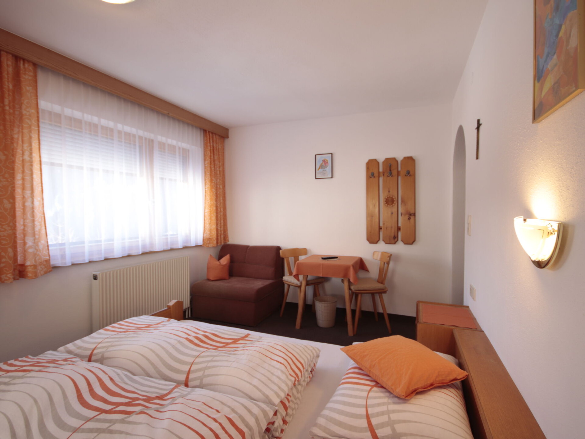 "Garni Regina", appartement 5-kamers 120 m2 op 2 verdiepingen. Rustiek en met veel hout ingericht: souterrain: woon-/eetkamer met eettafel en eethoek. Uitgang naar het terras. Open keuken (oven, afwasmachine, 4 keramische glas kookplaten, magnetron, elektrische koffiemachine). Aparte WC. Bovenverdieping: 1 2-pers. kamer met douche/WC en Sat-TV. Uitgang naar het balkon. 2 kamers, elke kamer heeft 1 bed, 1 2-pers bed, douche/WC en Sat-TV. Uitgang naar het balkon. 1 kamer met 1 2-pers bed, douche/WC en Sat-TV. Uitgang naar het balkon. Vloerbedekking. Balkon, terras. Uitzicht op de bergen. Ter beschikking: kinderstoel, kinderbed. Internet (Internet (WiFi), gratis). Niet rokers woning. Rookmelders, brandblusser.