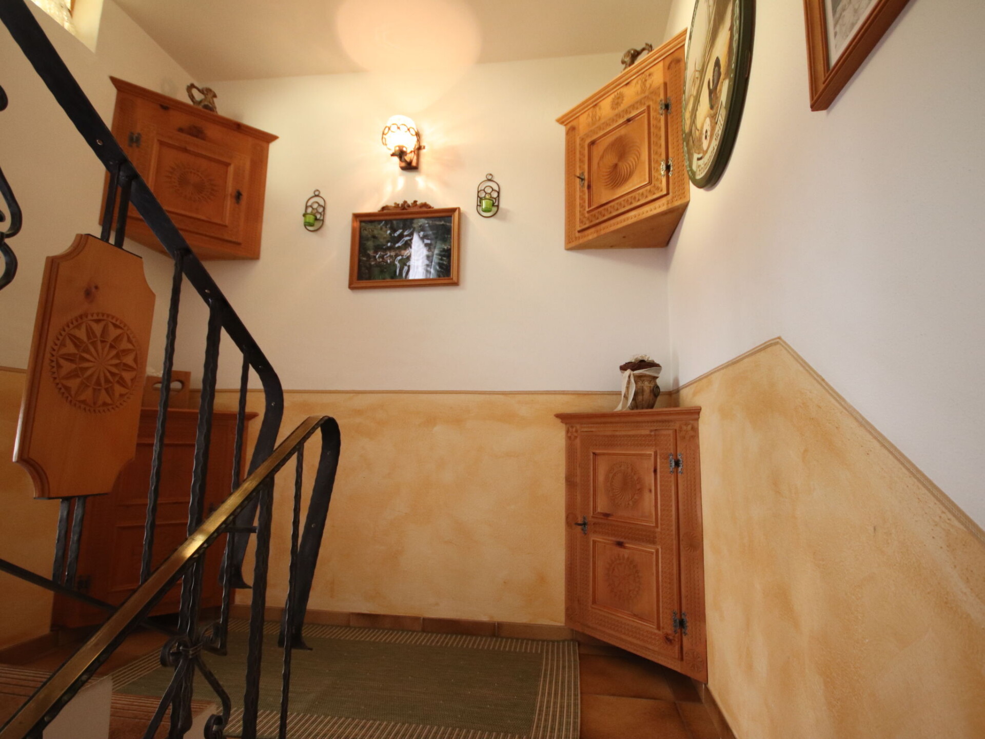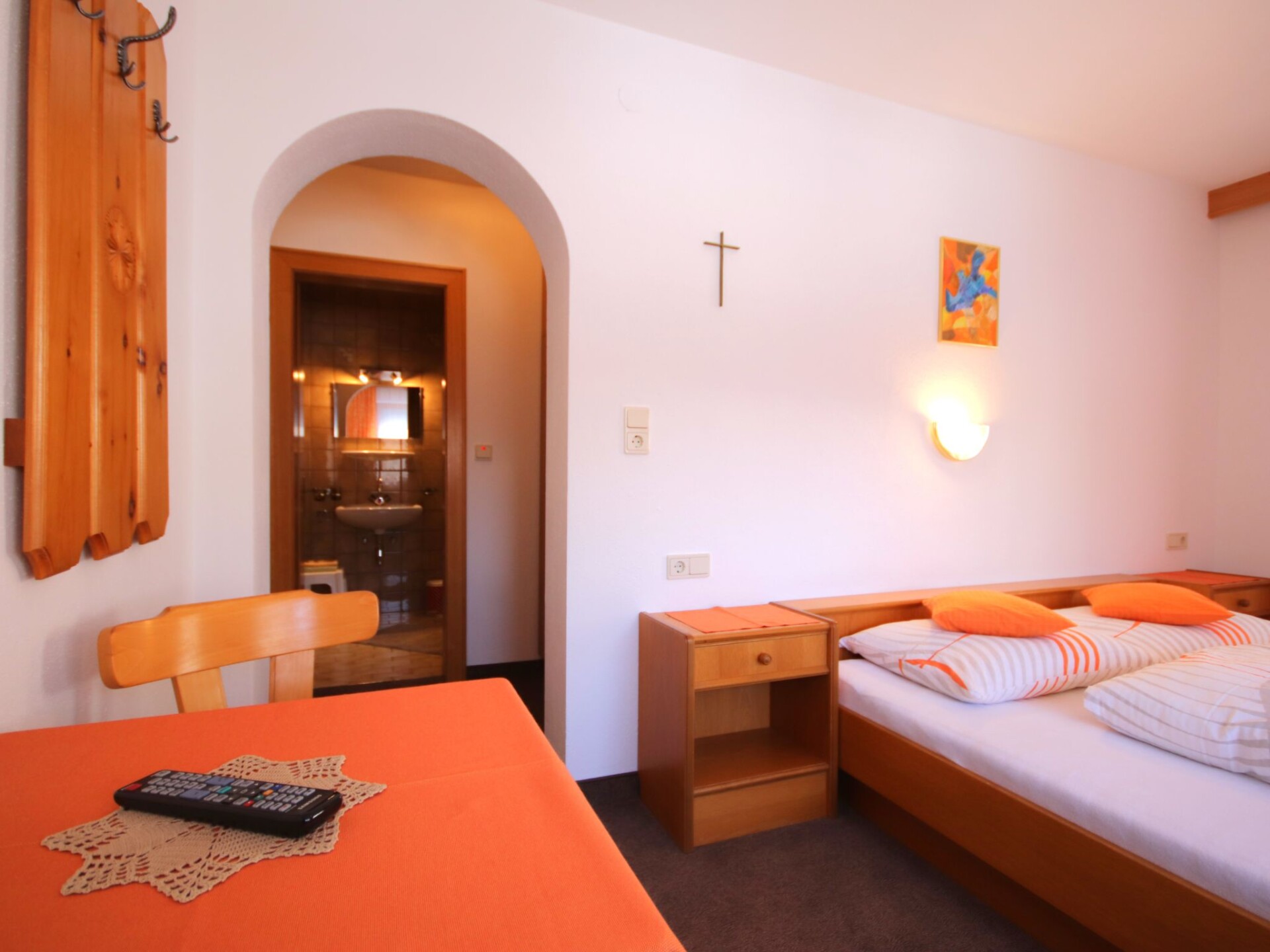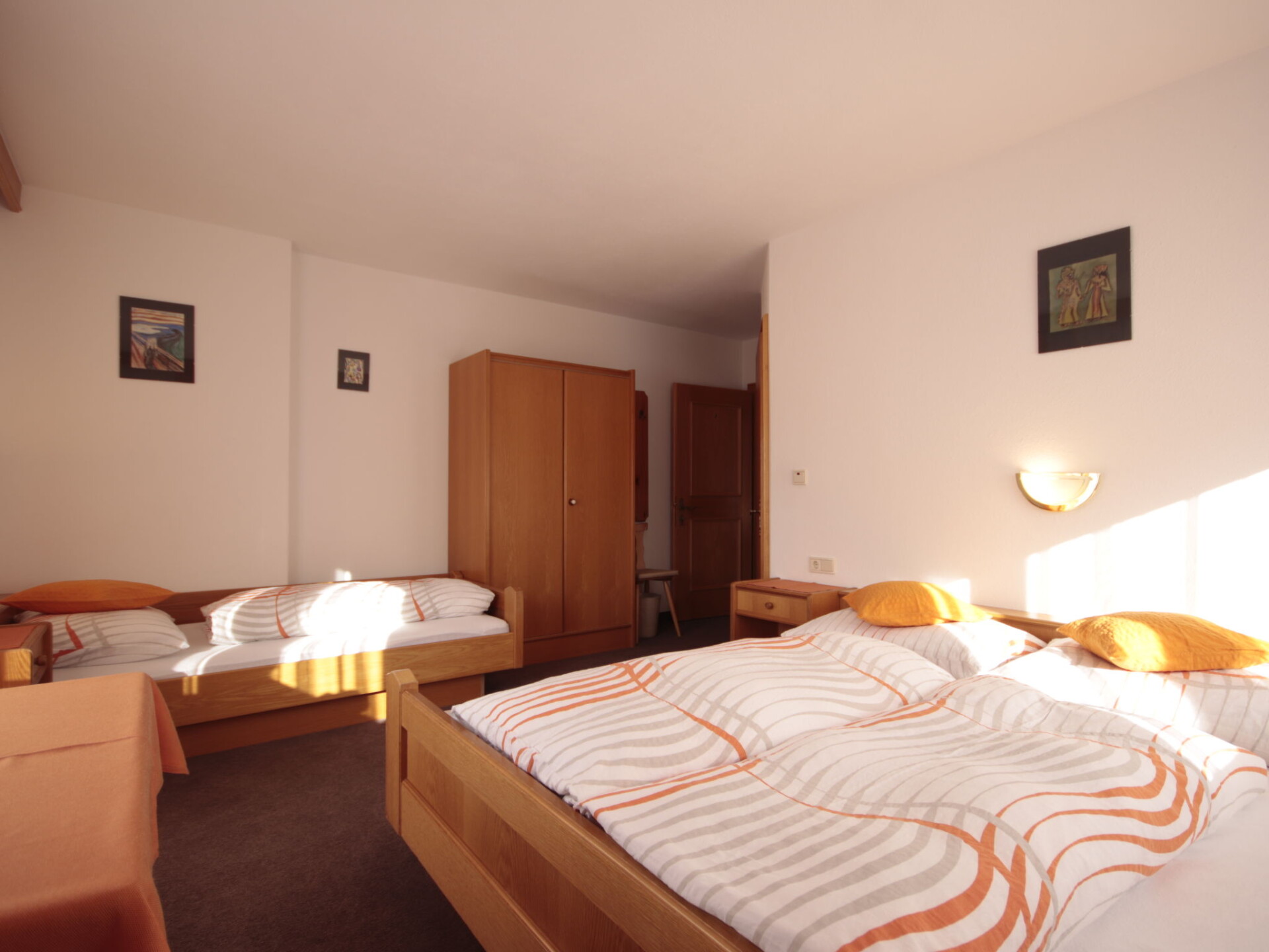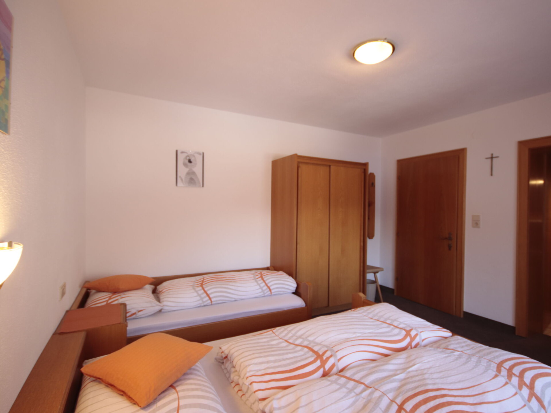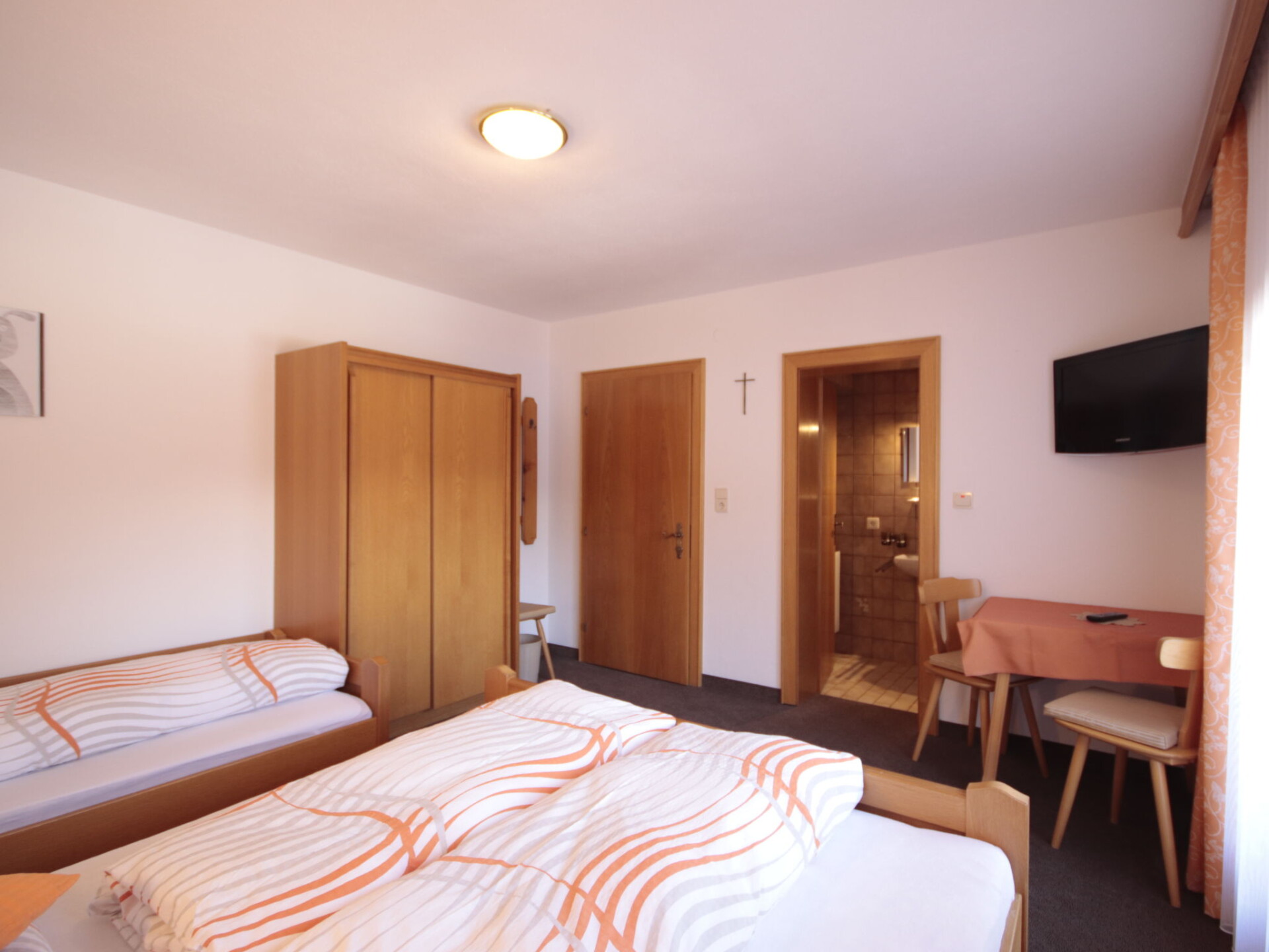 "Garni Regina", appartement 5-kamers 120 m2 op 2 verdiepingen. Rustiek en met veel hout ingericht: souterrain: woon-/eetkamer met eettafel en eethoek. Uitgang naar het terras. Open keuken (oven, afwasmachine, 4 keramische glas kookplaten, magnetron, elektrische koffiemachine). Aparte WC. Bovenverdieping: 1 2-pers. kamer met douche/WC en Sat-TV. Uitgang naar het balkon. 2 kamers, elke kamer heeft 1 bed, 1 2-pers bed, douche/WC en Sat-TV. Uitgang naar het balkon. 1 kamer met 1 2-pers bed, douche/WC en Sat-TV. Uitgang naar het balkon. Vloerbedekking. Balkon, terras. Uitzicht op de bergen. Ter beschikking: kinderstoel, kinderbed. Internet (Internet (WiFi), gratis). Niet rokers woning. Rookmelders, brandblusser.