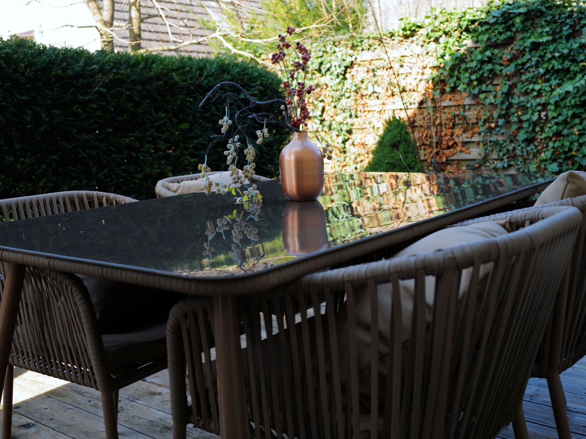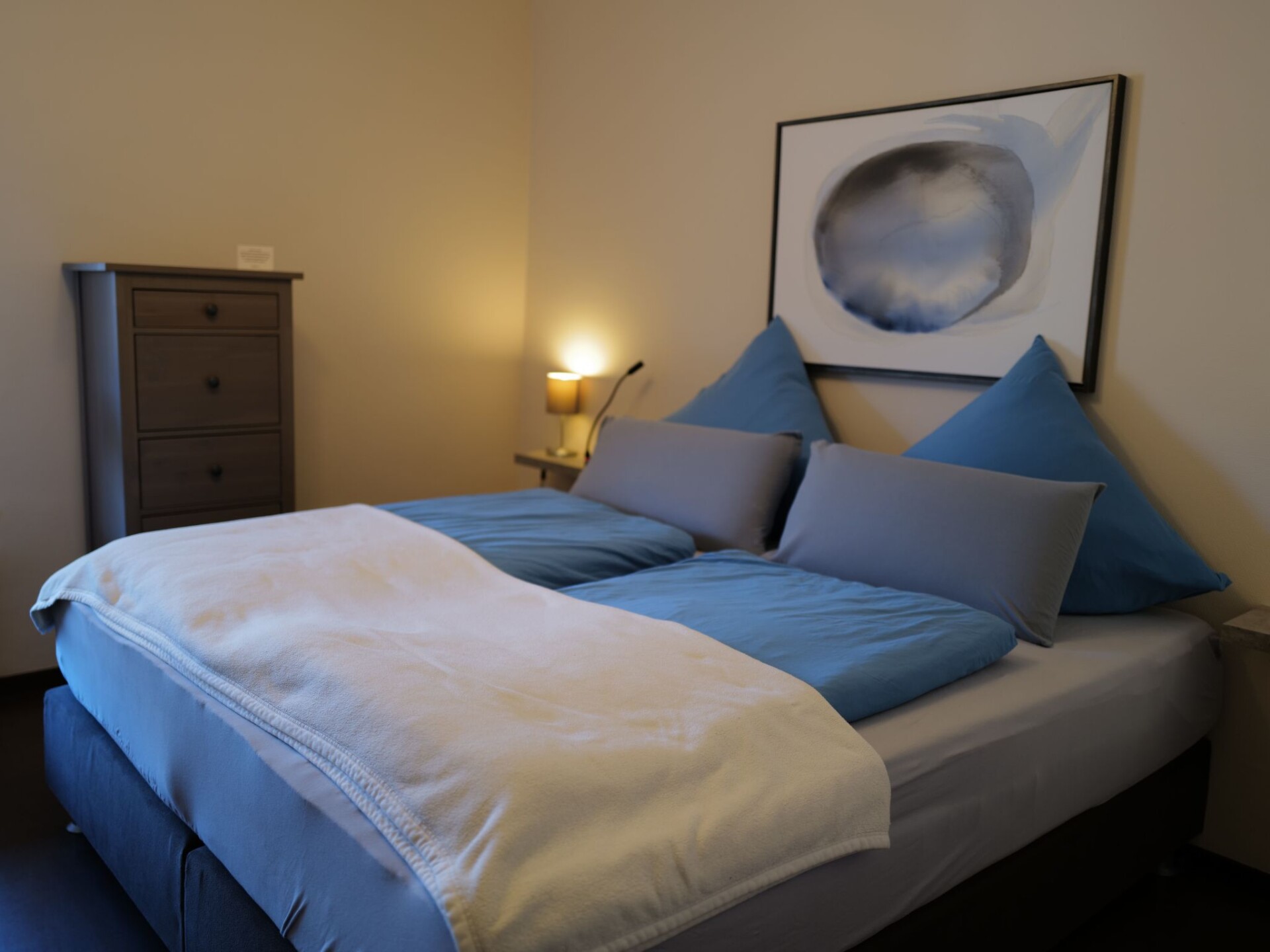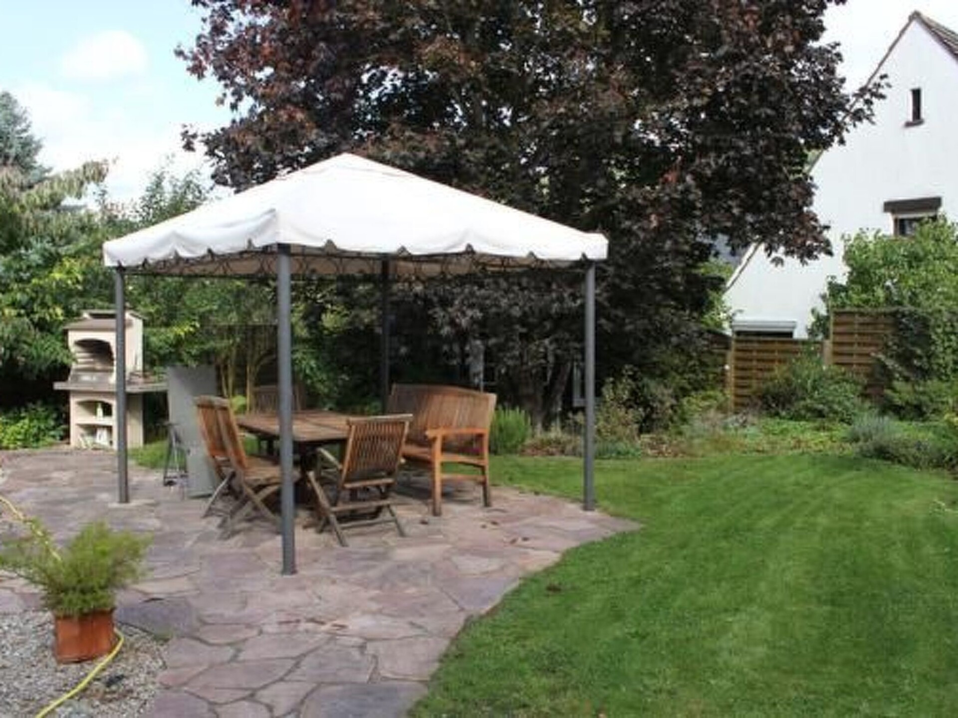 The holiday apartment of 55m² for up to four people is on the ground floor with direct access to the garden and it is barrier-free. It has a generously equipped kitchen with a dishwasher, a stove with a ceramic hob and an oven, a fridge with a freezer compartment, a Senseo coffee machine. There is also a living room with a high-quality sofa bed, a flatscreen TV with a digital HD receiver and a stereo system. The bedroom is furnished with a luxurious box spring bed (180 x 200cm). There is also a bathroom with a shower (suitable for wheelchair users).The charmingly designed garden with a big pond is ideal for relaxing to your heart’s content. Perhaps you can enjoy wine from one of the local vintners and plan your trips around the wonderful region with its culture and nature that you are spending the most enjoyable time of the year in.