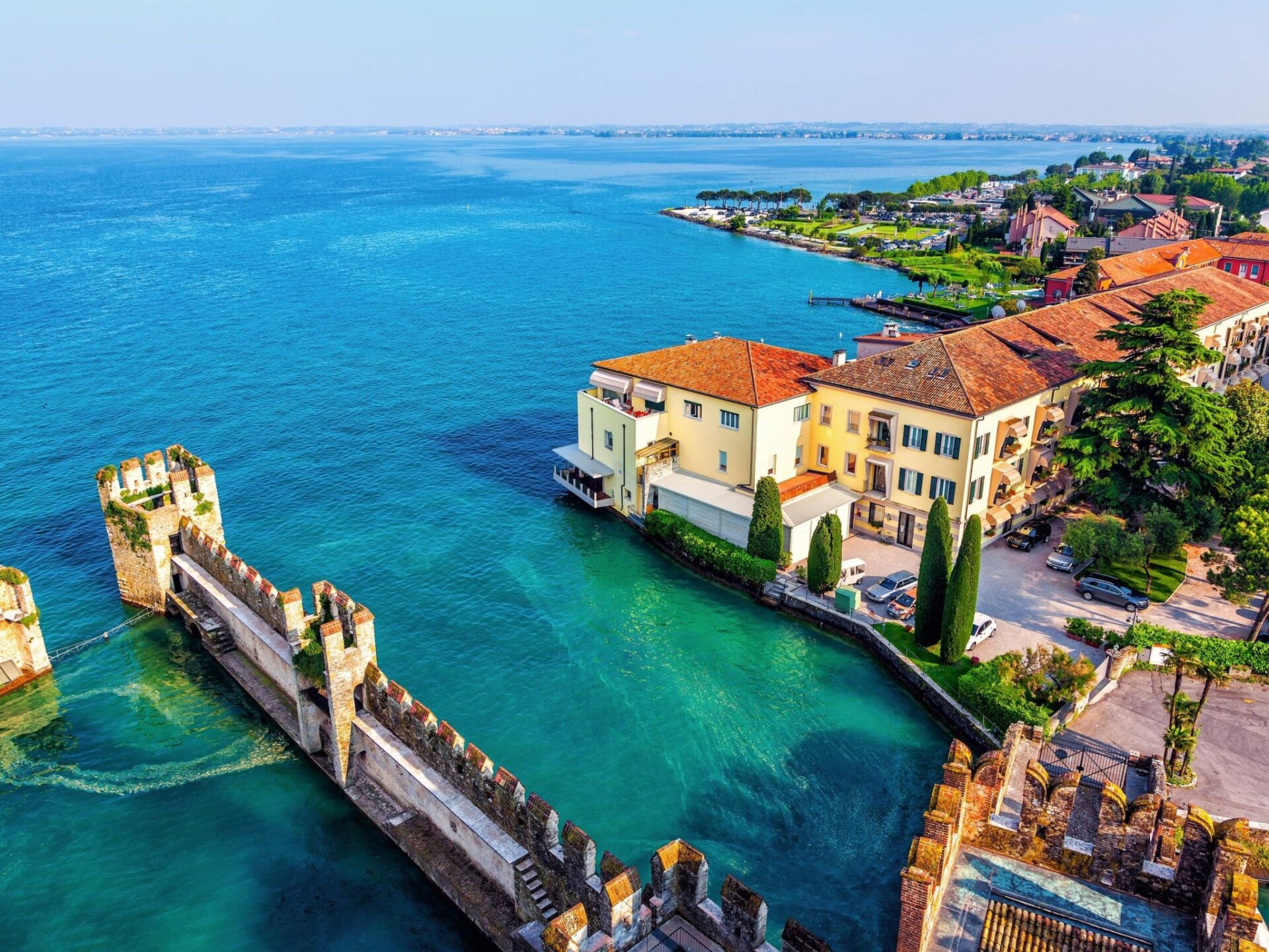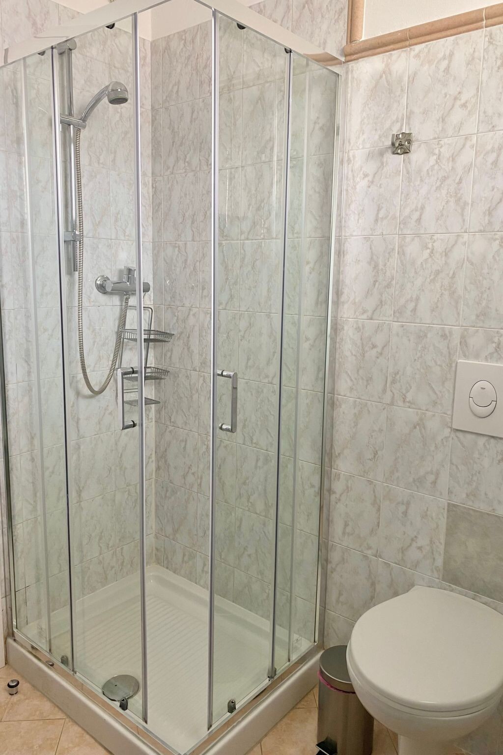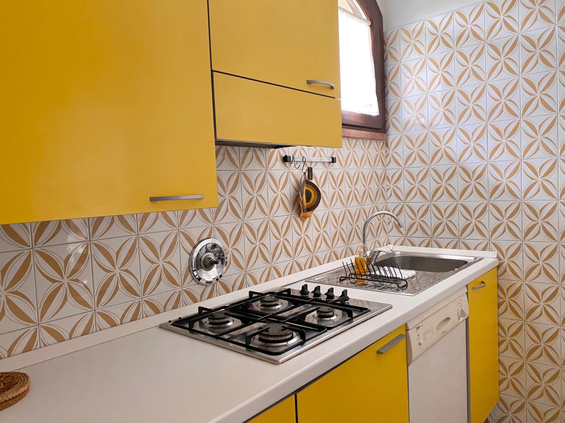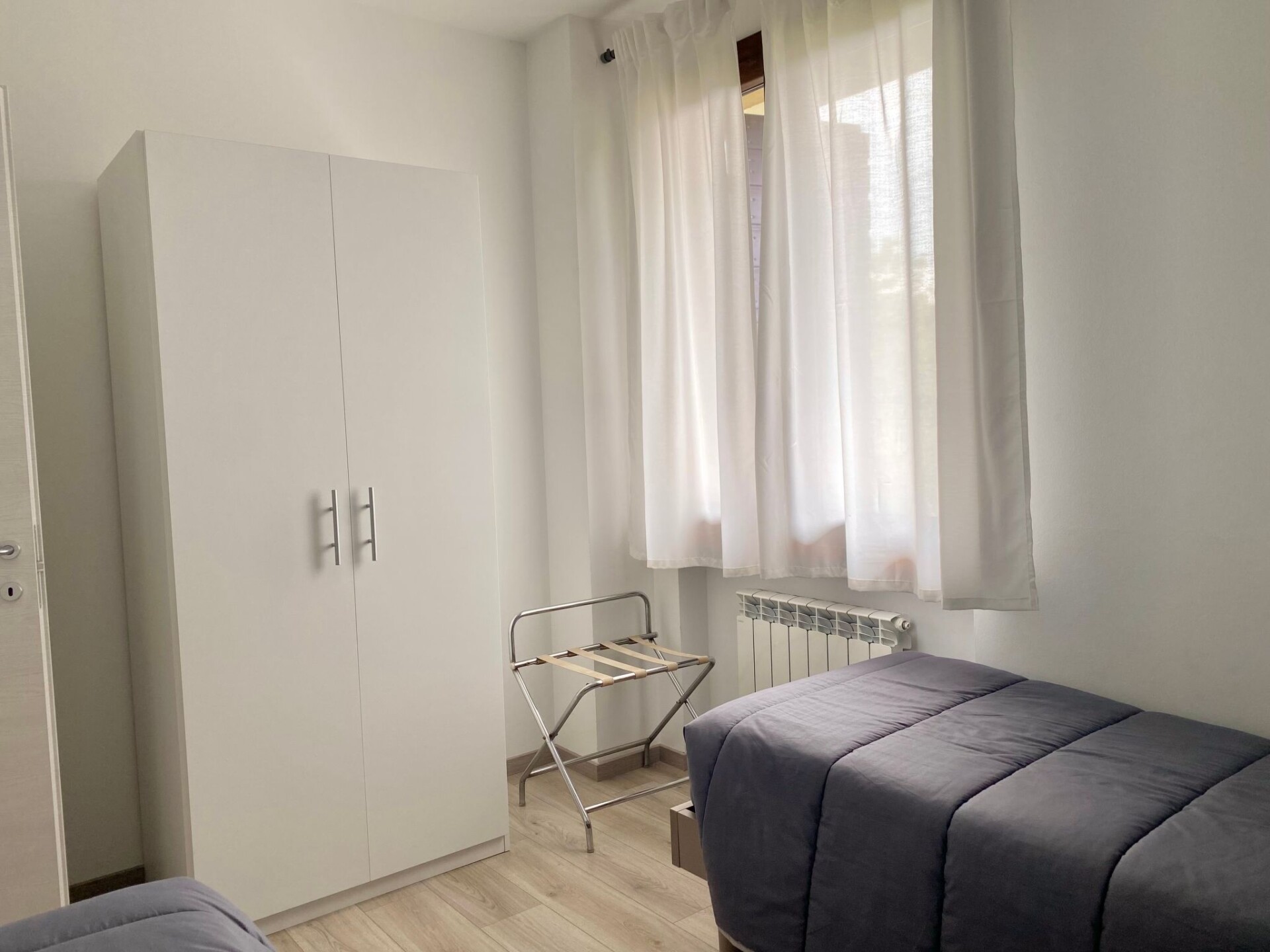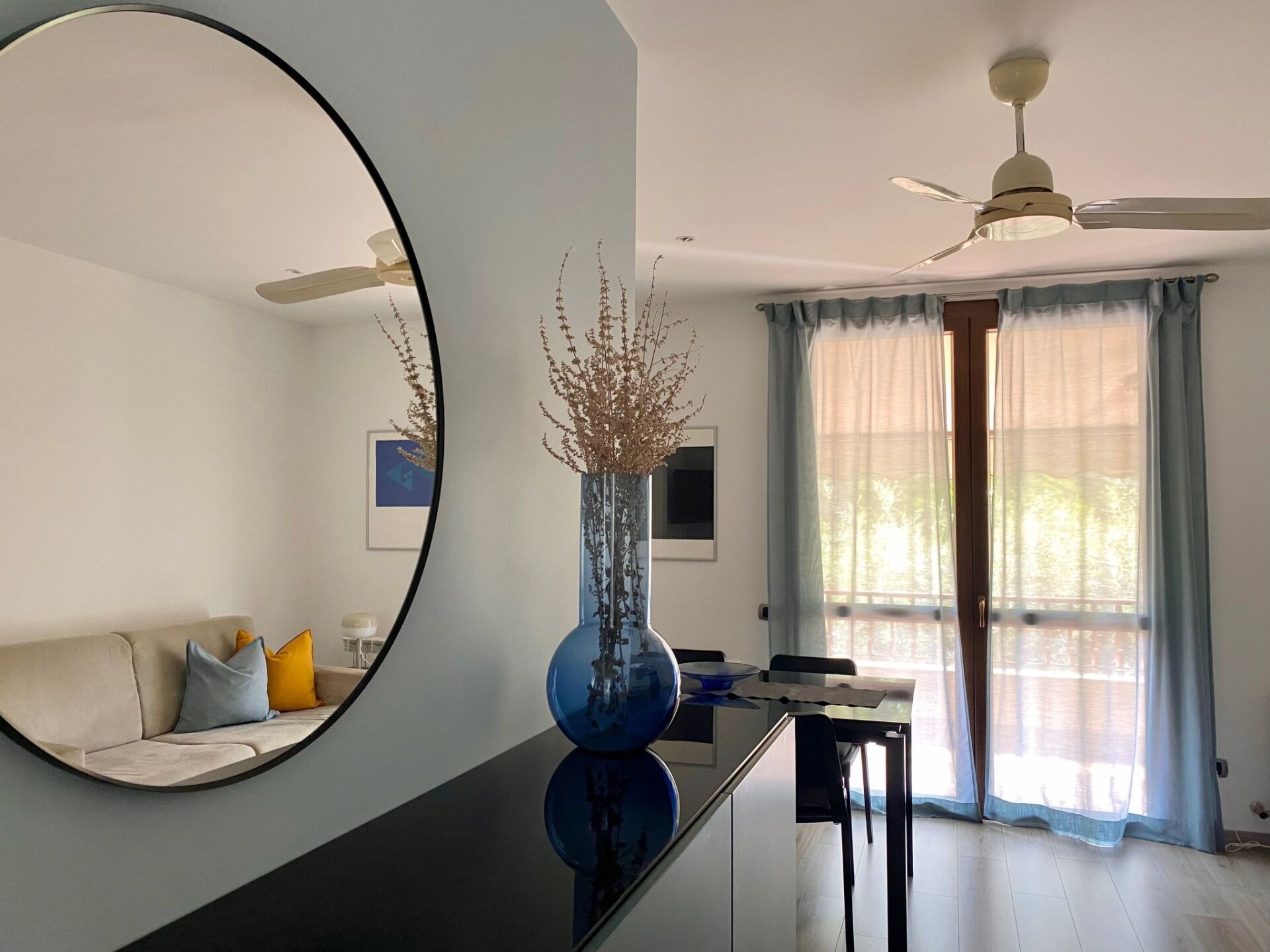 The apartment consists of a bedroom with double bed, a bedroom with two single beds, a bathroom with shower and hairdryer, and a living room with sofa bed and dining area connected to the kitchen via a fan-shaped door. fully equipped and equipped with a dishwasher.