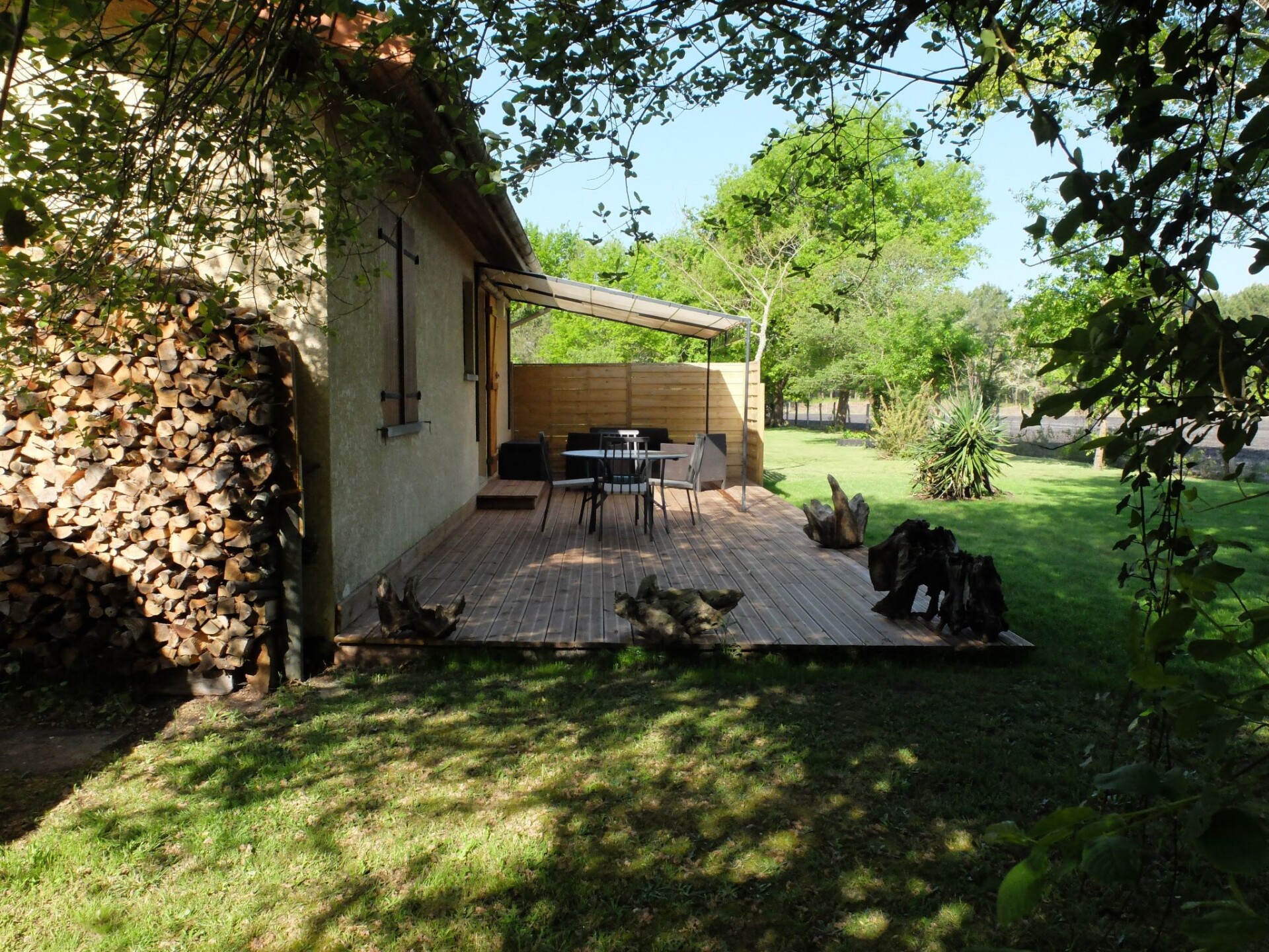 The spacious holiday home is surrounded by greenery, woods and fields, five kilometres from Mèzos. The location is extremely quiet and there is little traffic.The outdoor area offers a large terrace with garden furniture, an awning, a table tennis table, a large meadow with lots of trees and plenty of space to play and relax. The landlord and landlady also live on the large, fully fenced property. Deckchairs are available.Inside the house you will find a bedroom with a double bed (160 x 200 cm) and electric heating. There is a living room with a dining table and seating, a stereo system and a sofa for two people. A wood-burning stove rounds off the cosy living ambience. The open-plan kitchen is equipped with a fridge, a four-burner gas hob, a dishwasher, a coffee machine, a small oven and a microwave. There is a bathroom with shower cubicle, washbasin and toilet, as well as a small separate utility room with a private washing machine.Shopping facilities can be found in the nearest village of Mèzos, about five kilometres away, or you can drive to Morcenx, where you will find all your daily needs. In Lit-et-Mixe, approx. eight kilometres away, there is a larger supermarket and a launderette. Surrounded by woods and meadows and with very little traffic, this holiday home is the perfect base for hiking and cycling tours. Activities such as pony riding, canoeing and quad biking can be undertaken in the surrounding area and in just 15 minutes by car you can be on the coast of Aquitaine, which offers plenty of space to sunbathe and play, even in high season, with its famous, long sandy beaches.The existing WLAN can be used free of charge by our guests. 4018220230001