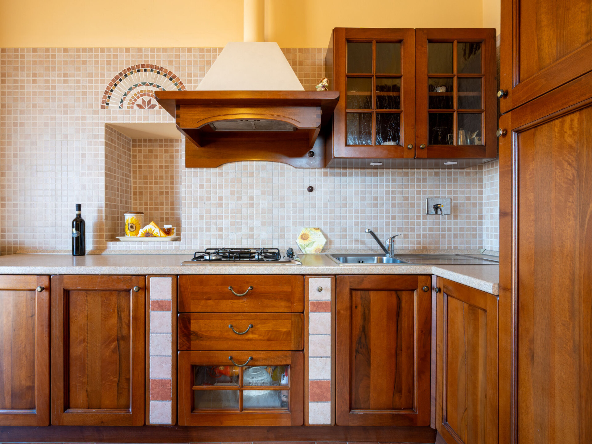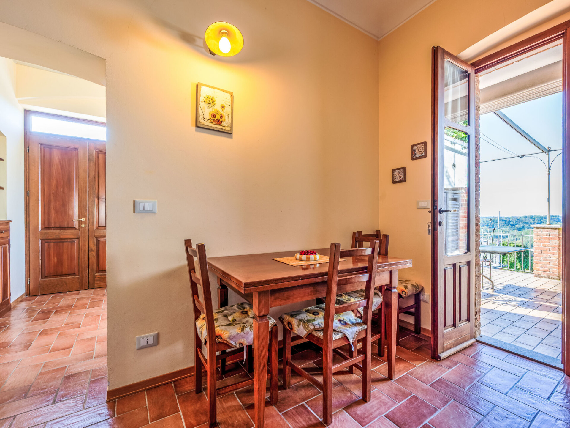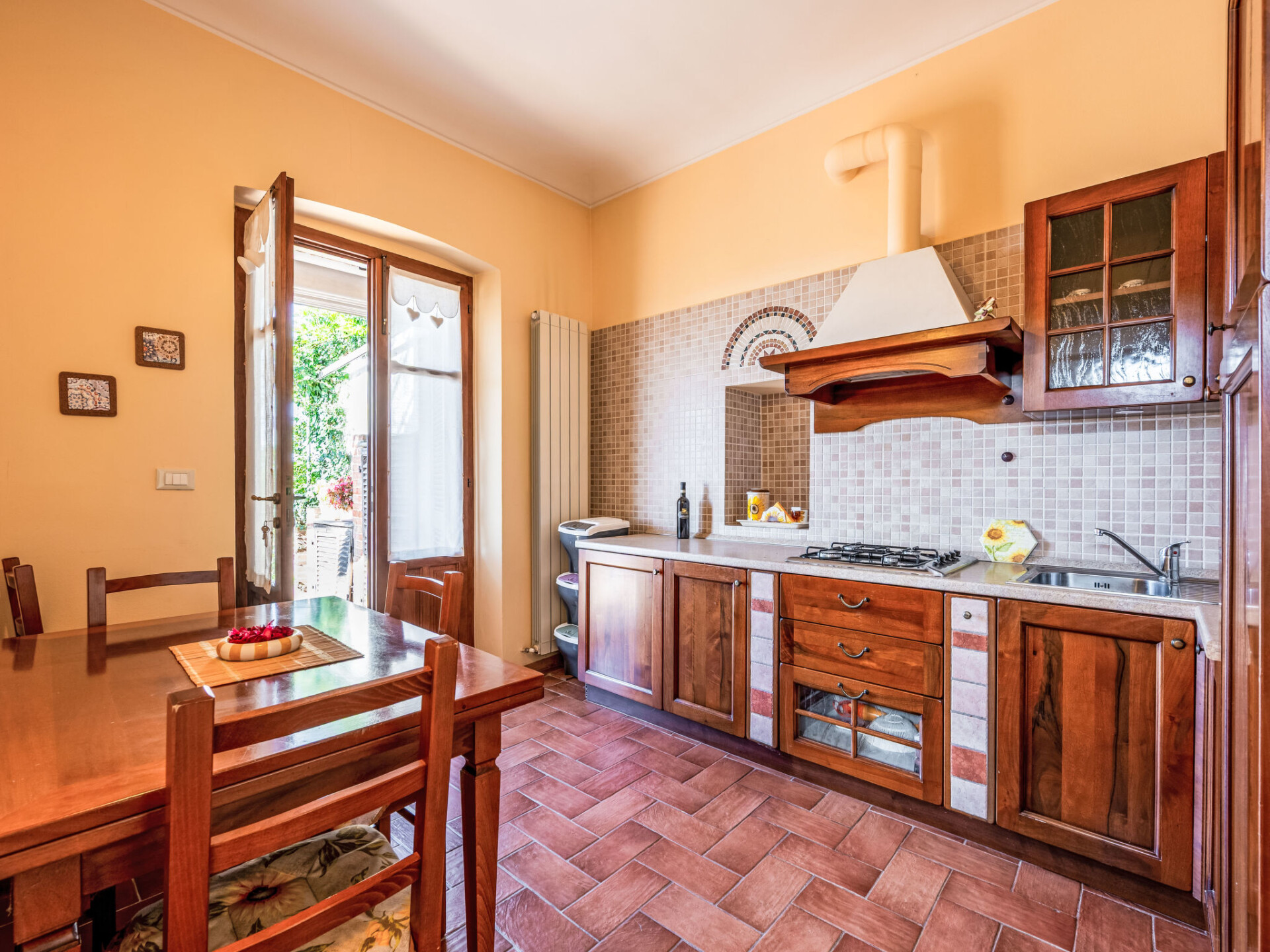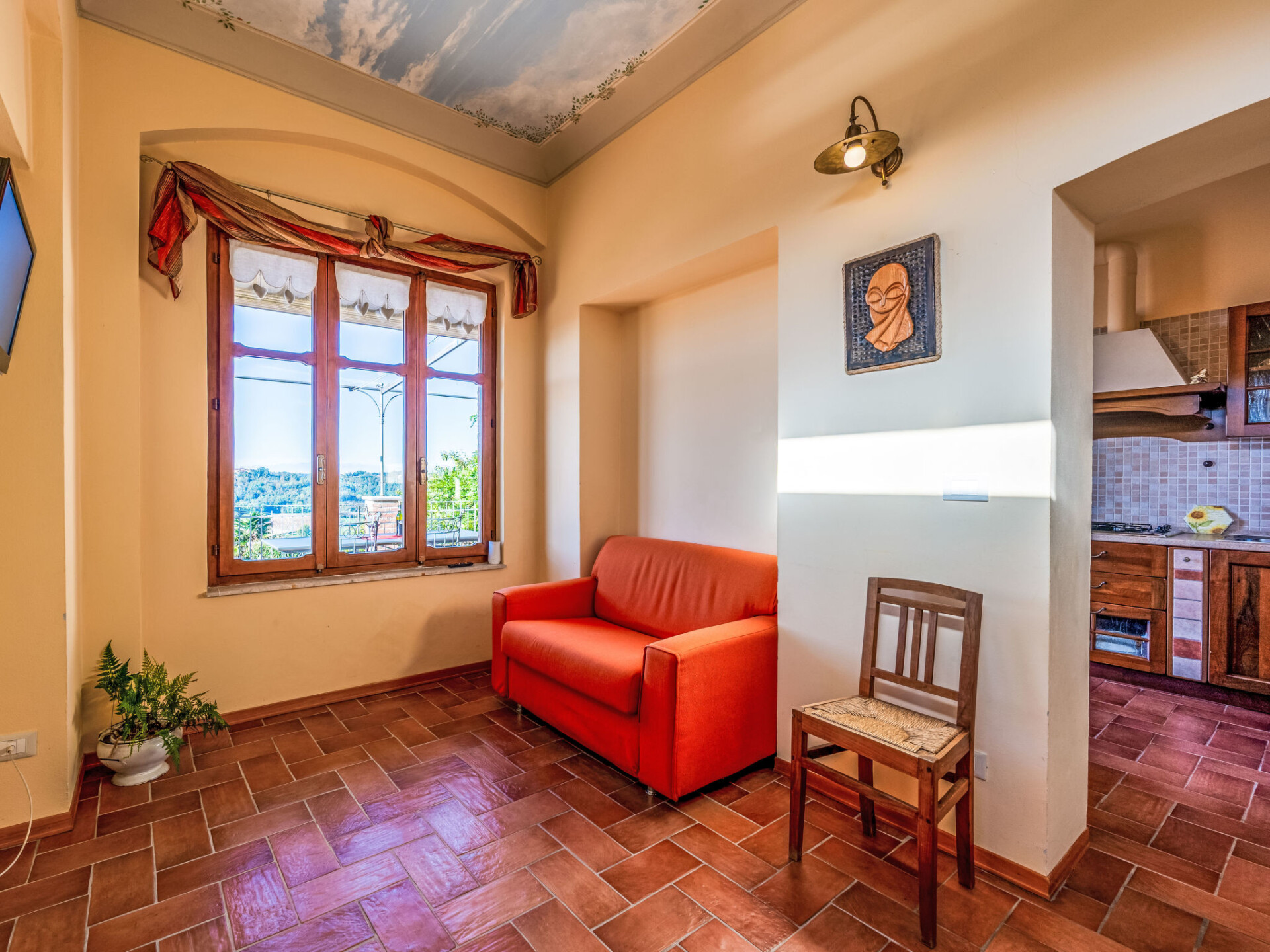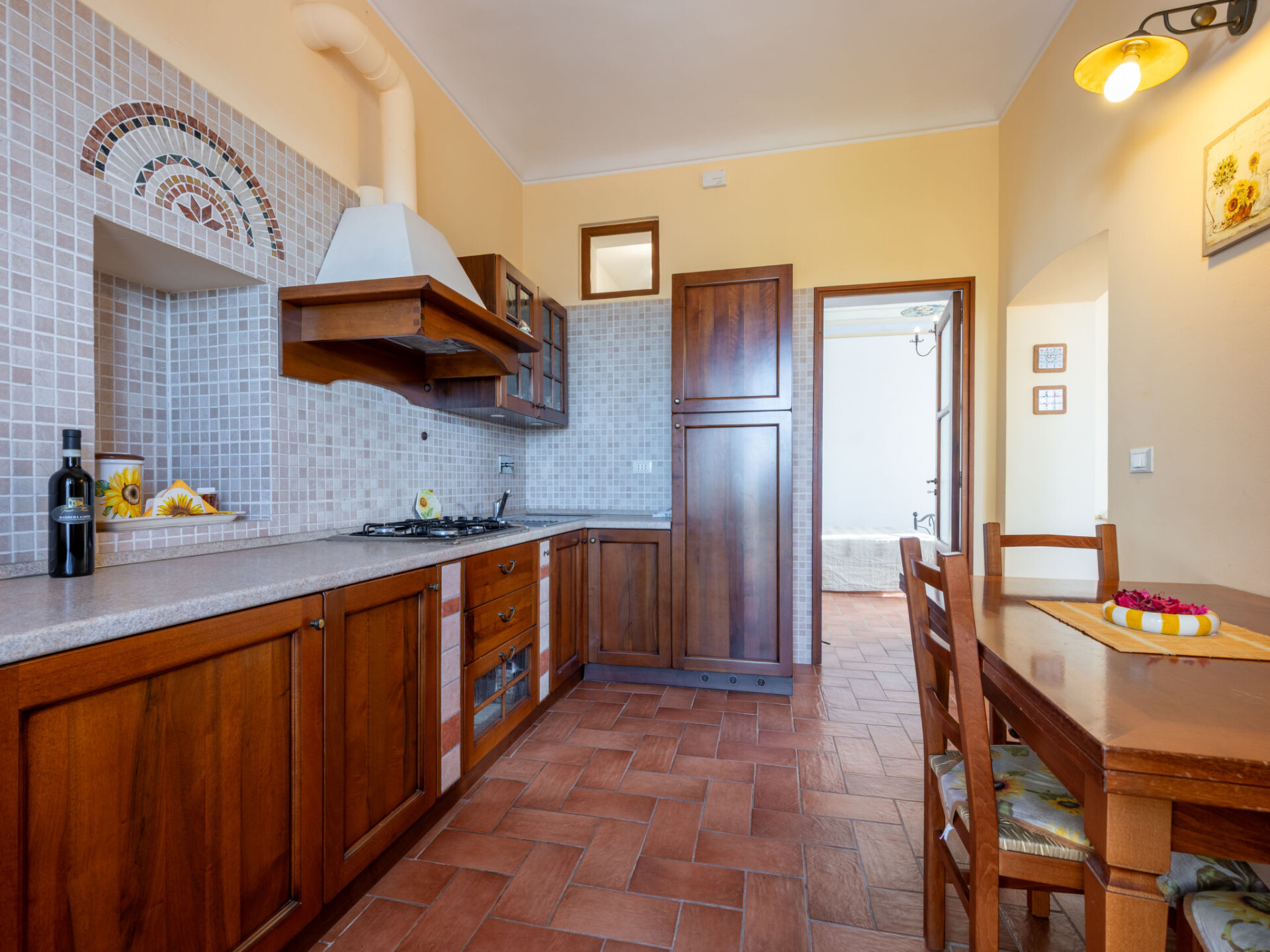 "Girasole", appartement 2-kamers 55 m2, op de begane grond. Rustiek en smaakvol ingericht: woon-/slaapkamer met 1 divanbed (120 cm, lengte 190 cm), TV. Uitgang naar het terras. 1 kamer met 1 bed, 1 2-pers bed en douche/WC. Open keuken (4 kookpitten (vlammen), broodrooster, diepvriezer, elektrische koffiemachine) met eettafel. Verwarming. Verwarming alleen beschikbaar van 01.10. tot 15.04. Natuurstenen vloeren. Terras 20 m2. Terrasmeubelen. Mooi panoramazicht. Ter beschikking: Internet (WiFi, gratis). Niet rokers woning. Maximaal 2 huisdieren/honden toegestaan. Bedindeling is flexibel. Er zijn meer slaapmogelijkheden beschikbaar dan het maximaal toegestane aantal personen dat echter niet mag worden overschreden. IT005049B46KYHTUBZ