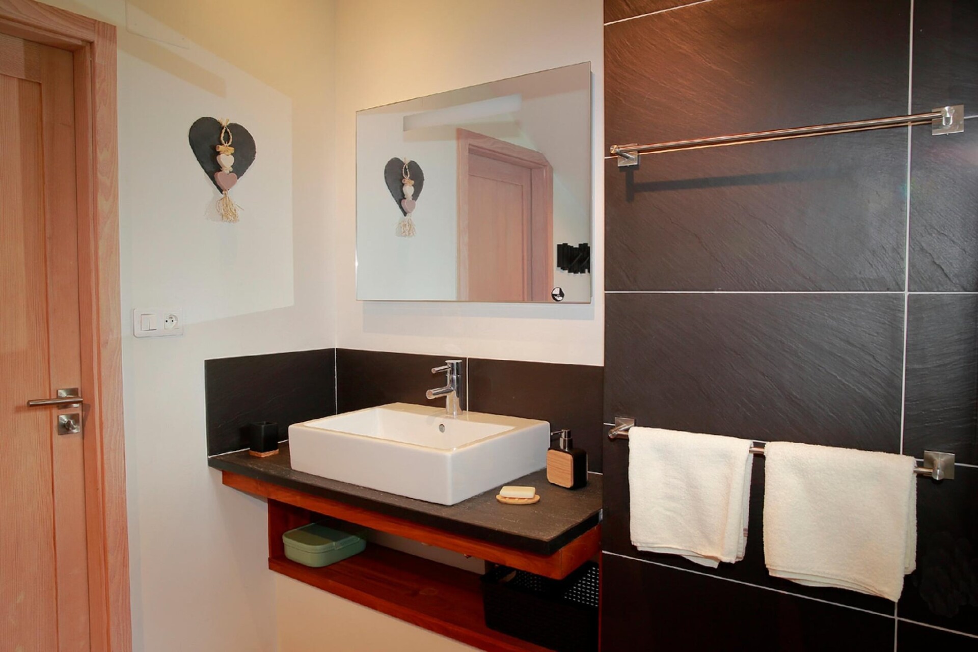 Boven bevindt zich een ruime master suite van 40 m² met een tweepersoonsbed (160x200 cm) en een eigen badkamer met douche, wastafel en toilet. De accommodatie is vrij gelegen, comfortabel en ontworpen voor gasten die respect voor het milieu belangrijk vinden. Er worden milieuvriendelijke schoonmaakmiddelen verstrekt.