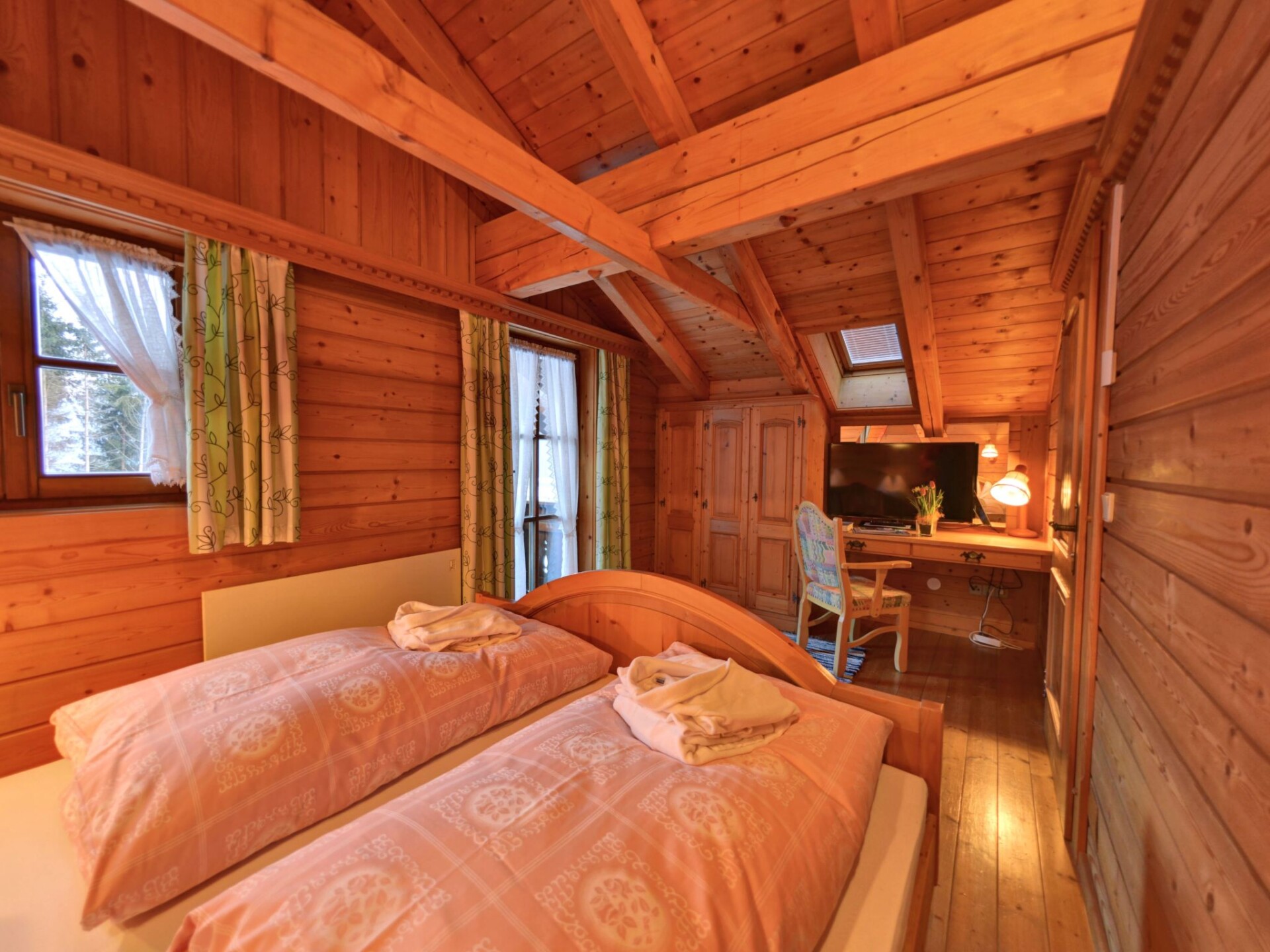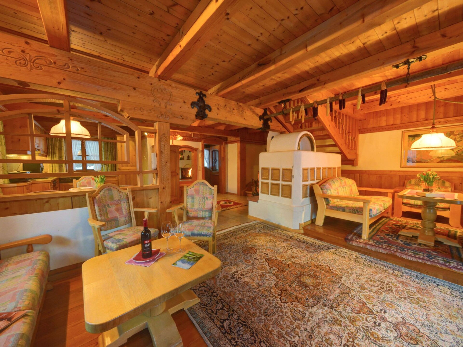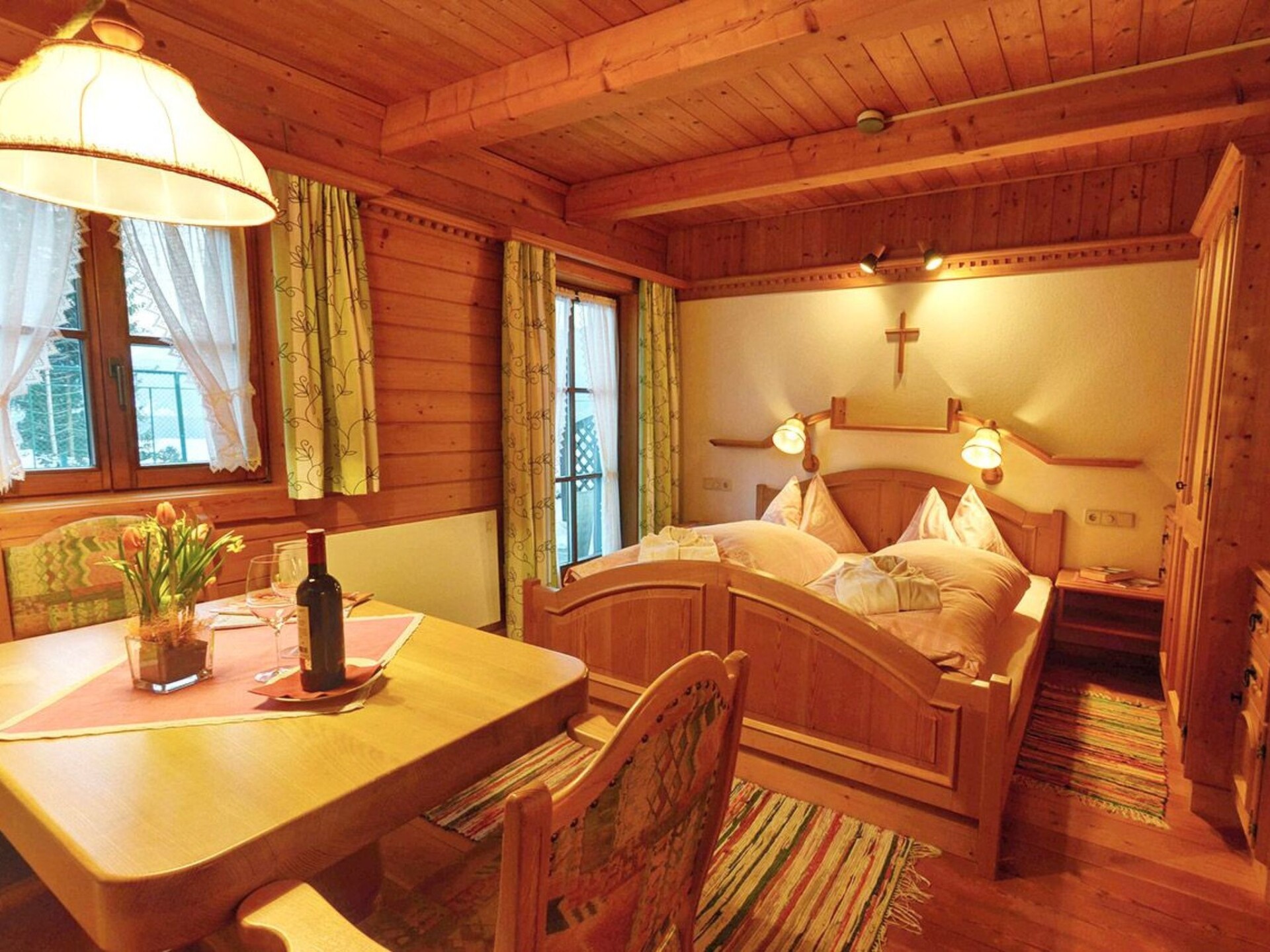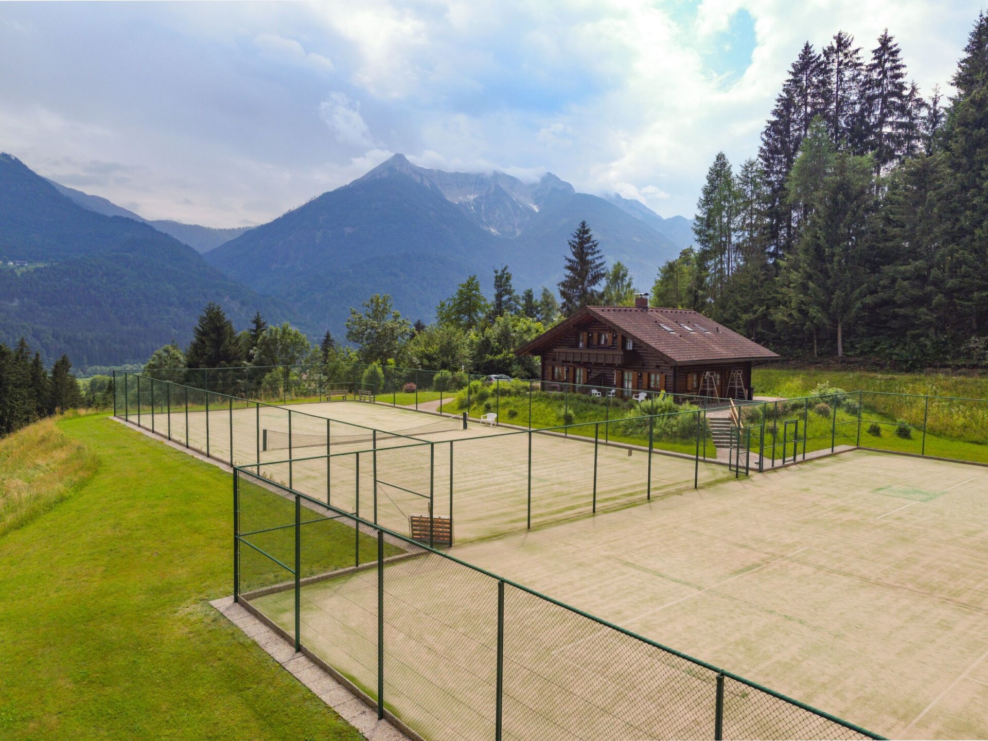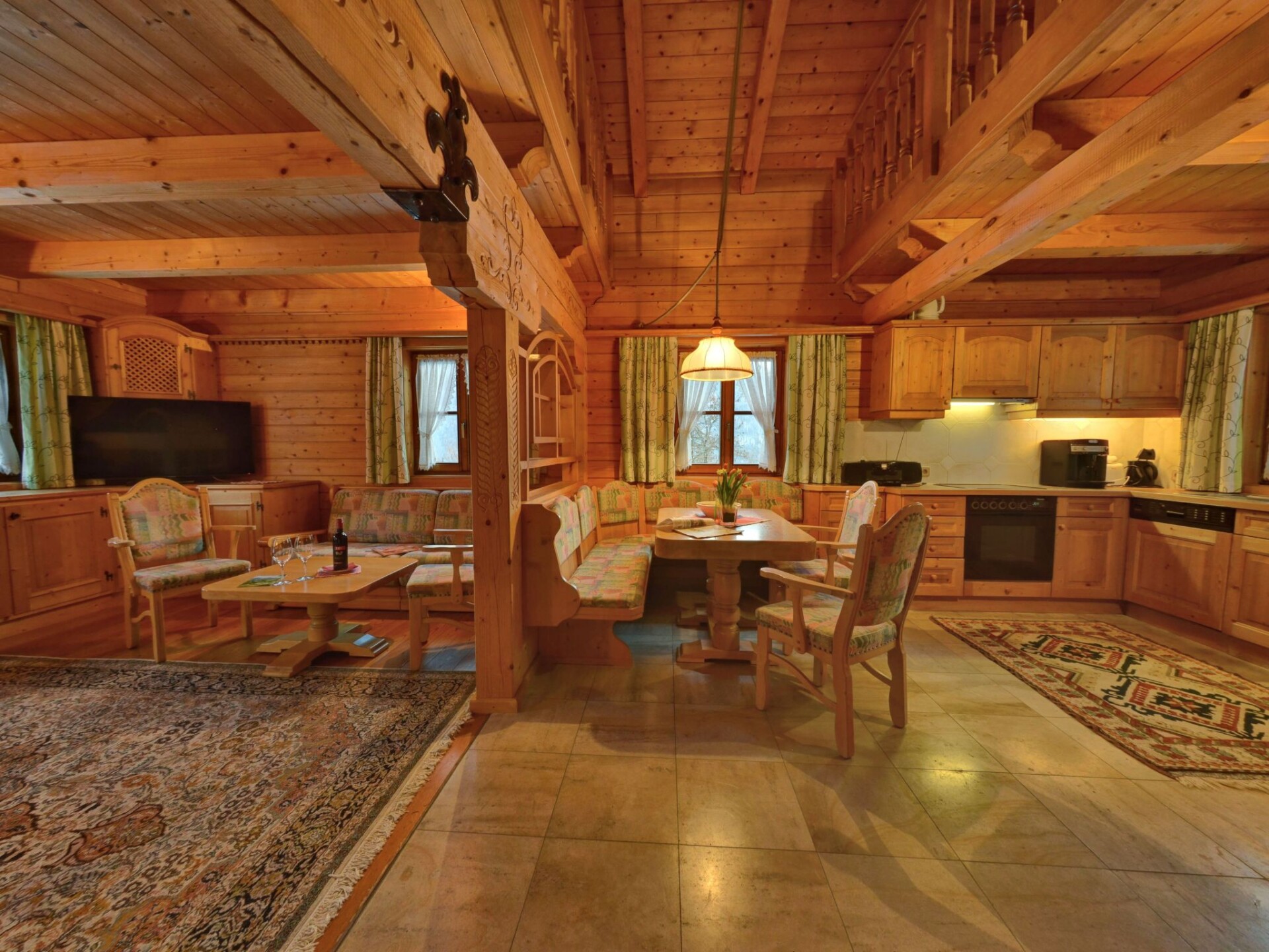 This holiday home in the Carinthian Oberdrautal, a cosy wooden log cabin in organic construction, offers plenty of comfort and enough space for 2 to 10 people. Whether you are travelling as a couple, with your family or with a group of friends, you will feel right at home here. The house is located slightly away from the Ferienhotel Glocknerhof on a quiet, sunny hill (700 m) on the edge of the forest with views across the Drau Valley to Lake Weissensee and can be booked for two to ten people.There is also a large terrace on the ground floor and a balcony on the upper floor. The private driveway is cleared in winter and a car park is also available.There is a cosy lounge with a fireplace, a well-equipped eat-in kitchen and TV corner on the ground floor as well as a parlour with a separate flat. On the upper floor there are two bedrooms with double beds. The bathroom has a whirlpool bath and WC and there is a separate WC. WLAN is available and you will find mineral water when you move in. The flat has a cosy wooden interior and a wood-burning stove to create a feel-good atmosphere and the modern furnishings leave nothing to be desired.And to balance things out, tennis and morning sports are right on the doorstep. Distances: 175 km to Salzburg, 300 km to Munich. Berg im Drautal is the starting point for hikes in the Carinthian Oberland, for water sports adventures at the famous Carinthian bathing lakes and rally trips to Italy, South Tyrol and Slovenia. The holiday village offers all the main sports facilities, in winter skiing, cross-country skiing and ice sports, in summer golf, tennis, horse riding, hiking, mountain biking and model flying. Explore a landscape of flowering meadows, clear lakes and streams as well as rugged mountains offering breathtaking views. Shopping facilities can be found within a KM.Guests can use all the leisure facilities of the nearby main hotel free of charge. Breakfast and gourmet board are available for an extra charge.