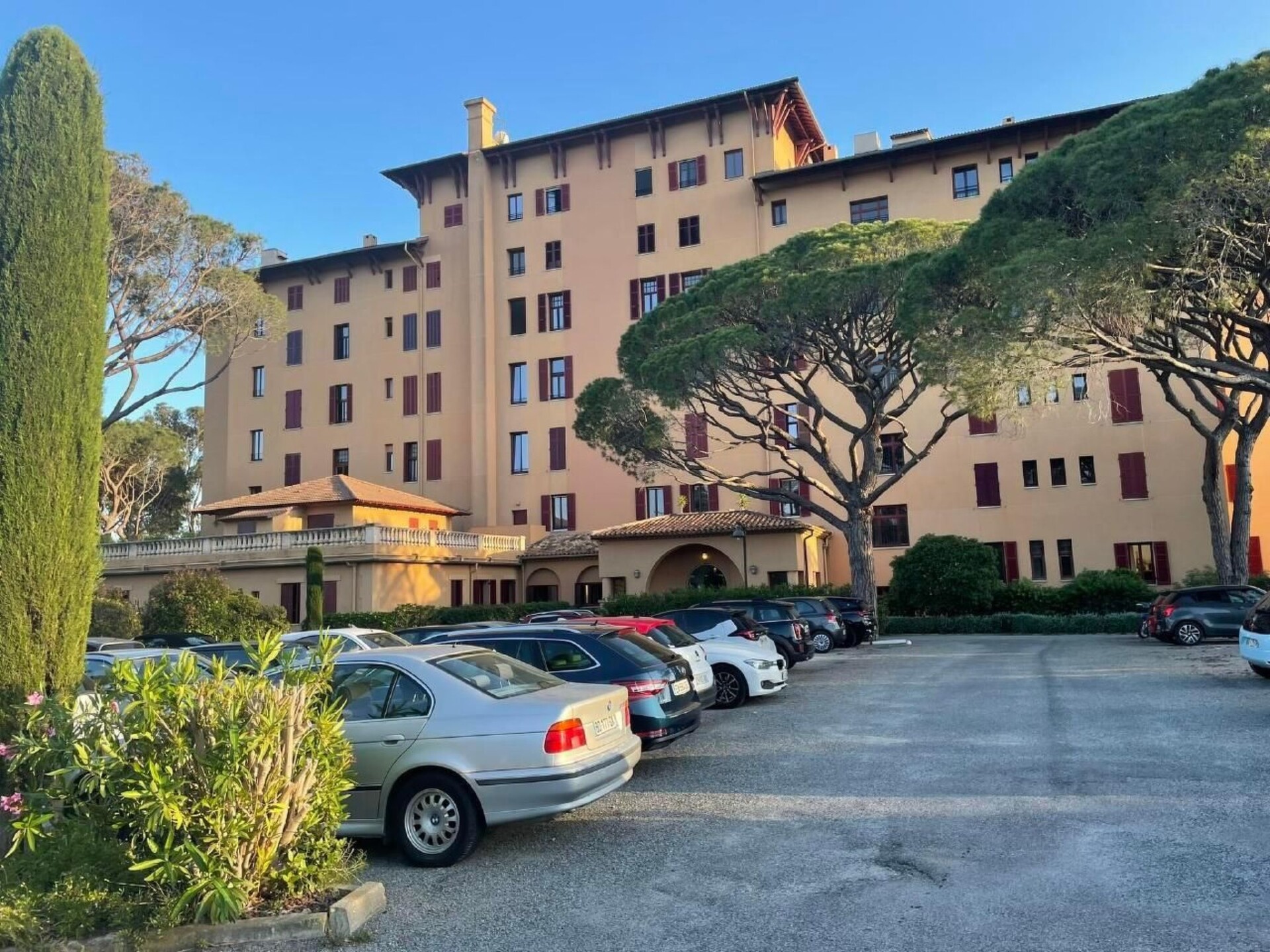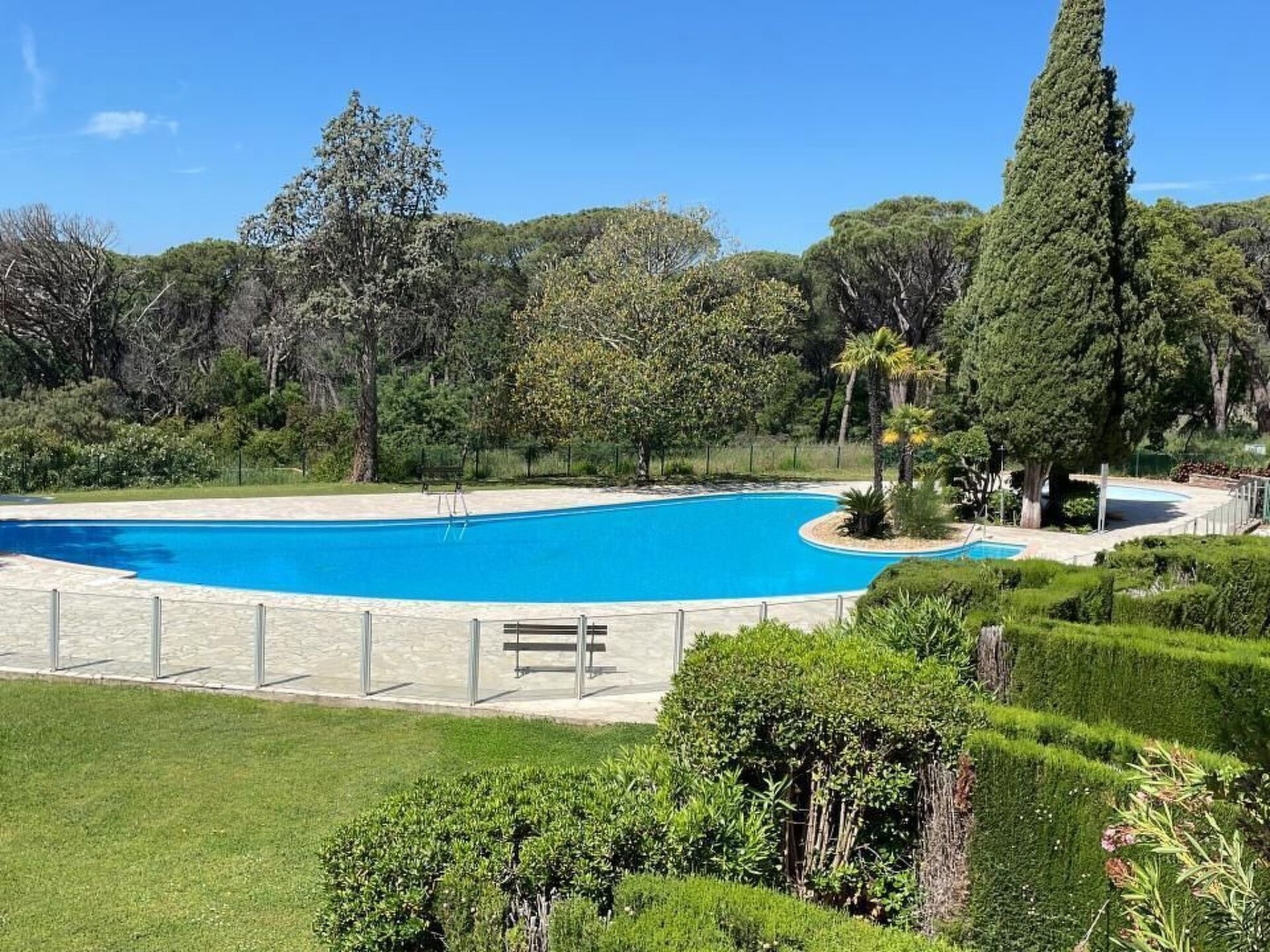 Discover the perfect getaway in our stylish, spacious studio, skilfully designed with two offset galleries for sleeping. Situated in the historic setting of the former Valescure Golf Hotel, this accommodation combines charm with modern comfort for up to four people. Experience an unforgettable stay surrounded by the peaceful greenery of a pine forest and immerse yourself in a world where history meets modern amenities.The interiors of our flat are characterised by high-quality, contemporary furnishings. Equipped with two WCs, a washing machine, a tumble dryer and cable TV, it promises a comfortable stay. The high ceilings and large windows create an inviting, light-flooded atmosphere, while the living room with a fan and window blinds provides cooling and shade on hot days. The open gallery, which serves as a bedroom, offers a separate toilet and washbasin as well as air conditioning with water cooling, which requires careful use.The outdoor area of the building leaves nothing to be desired. The accommodation is part of a spacious park with a swimming pool for shared use, embedded in the historic and impressive Art Deco style of the 19th century. Here you can relax in peace, enjoy the sun or take a refreshing dip in the pool, surrounded by the picturesque landscape of an old pine forest.The area surrounding the accommodation is ideal for nature lovers and active guests. The "Massif de L'Estérel" nature reserve with its countless hiking and biking opportunities is right next door. For golf lovers, the "Golf & Tennis Club Valescure", one of the oldest and most beautiful golf courses in France, is just a five-minute walk away. Shopping facilities, cafés and restaurants can be found in the Centre Commercial Valescure, 1 km away. Saint-Raphael, with its beaches and lively centre, is also just a short drive away. With its central location on the Côte d'Azur, other excursion destinations such as Saint-Tropez, Cannes and Nice are also within easy reach.Enjoy a unique combination of historical flair, modern living comfort and a natural landscape that invites you to explore. Whether you want to relax, play sports or discover the culture of the Côte d'Azur - our spacious studio in the former Golf Hotel of Valescure is the ideal starting point for a varied holiday experience. FR-0000048678 (13 stellig)