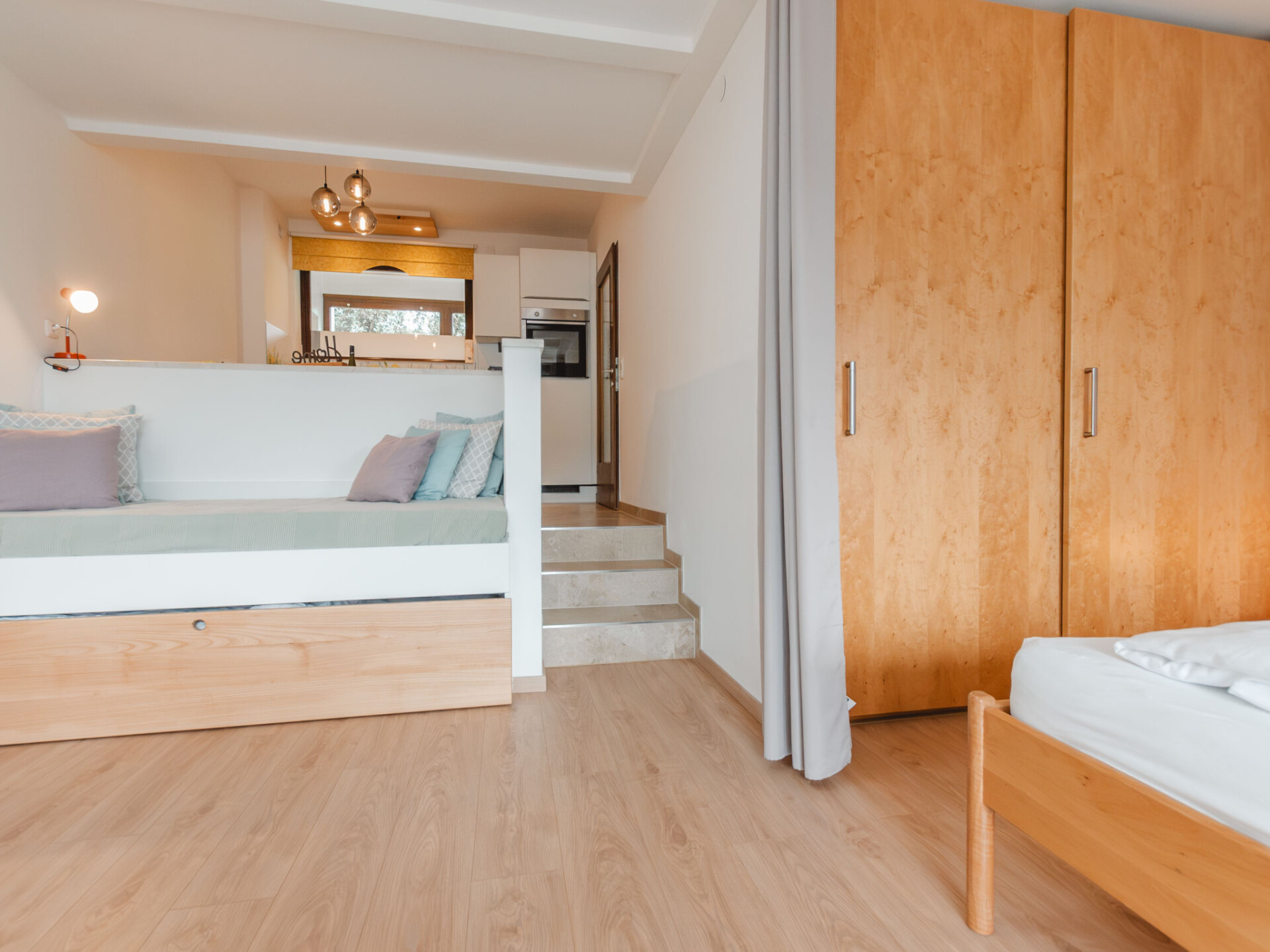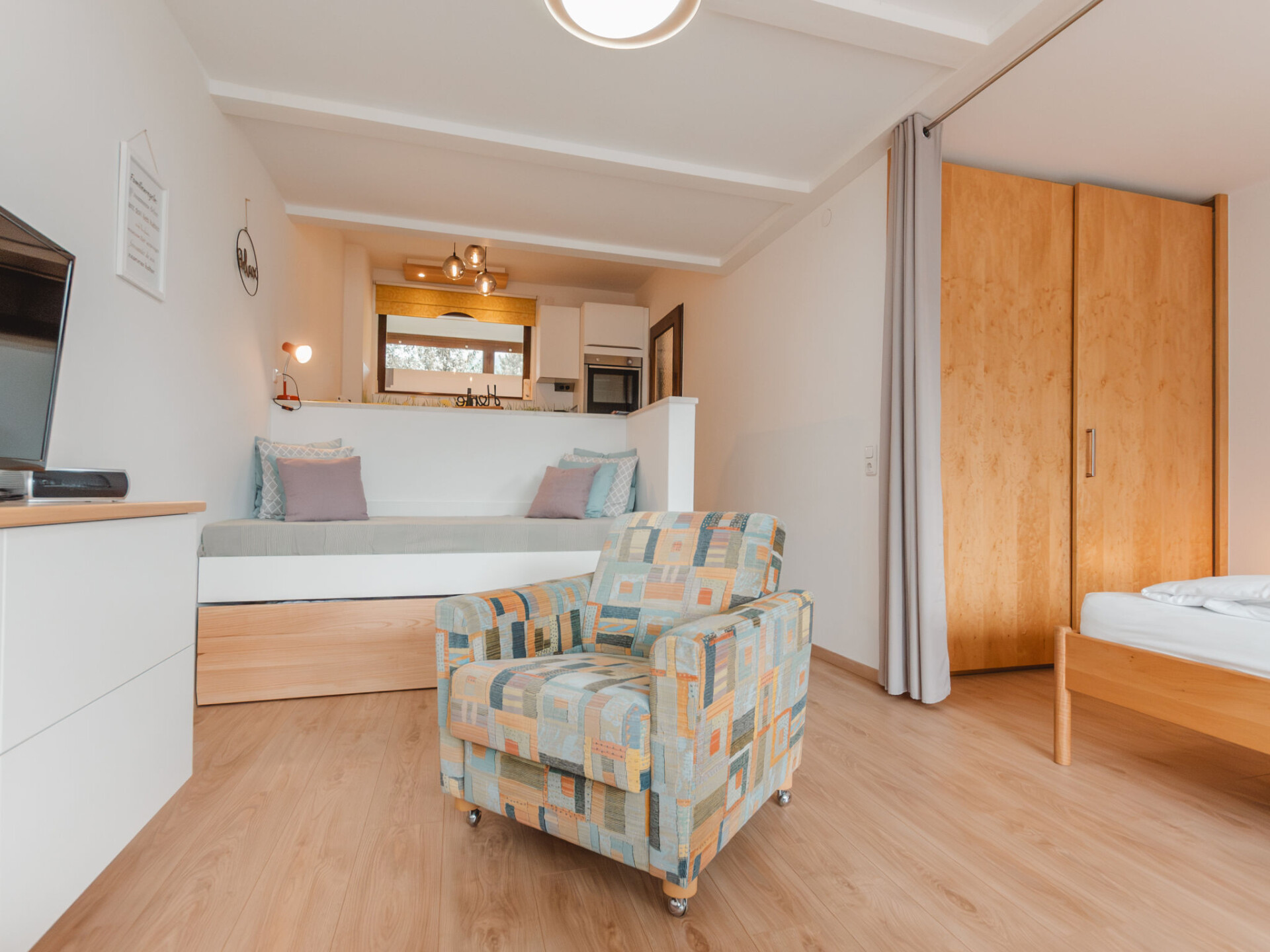 "Hasennest", appartement 1-kamer 36 m2 op de 2e verdieping. Het objekt is geschikt voor 2 volwassenen + 2 kinderen. Licht, volledig gerenoveerd in 2022, zeer modern ingericht: hal. Woon-/slaapkamer met 2 bedden (90 cm, lengte 200 cm), 1 2-pers bed en Sat-TV (Flatscreen TV). Uitgang naar het balkon. Kleine, open keuken (waterkoker, elektrische koffiemachine, pads voor de koffiemachine (CREMESSO) extra) met eettafel. Douche/WC. Parketvloeren. Groot balkon, op het zuiden gelegen. Balkonmeubilair. Zeer mooi uitzicht op de bergen. Parkeerplaats nr. 10/17. Niet rokers woning. Rookmelders. 50402-000786-2022