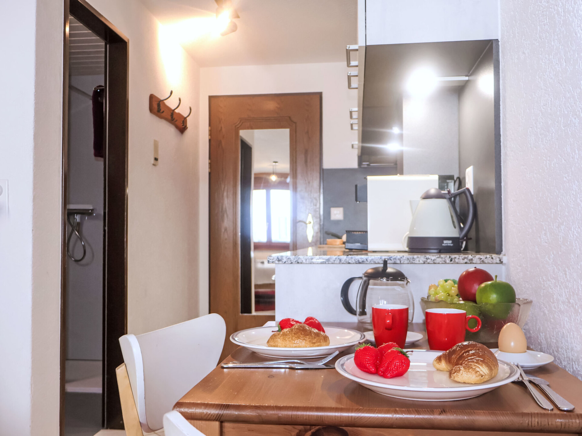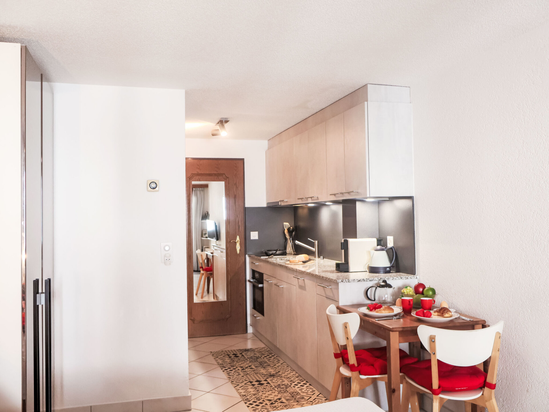 Appartement 1-kamer 25 m2 op de 2e verdieping. Comfortabel en gezellig ingericht: woon-/slaapkamer met 1 2-pers bed (2 x 90 cm, lengte 200 cm), eettafel en TV. Uitgang naar het balkon. Kleine keuken in de hal (oven, afwasmachine, 2 keramische glas kookplaten, broodrooster, waterkoker, elektrische koffiemachine, raclette oven, combimagnetron, fondue Set (chinese, kaas)). Douche/WC. Balkon. Balkonmeubilair. Uitzicht op de bergen. Ter beschikking: haardroger. Internet (Internet (WiFi), gratis). Niet rokers woning.