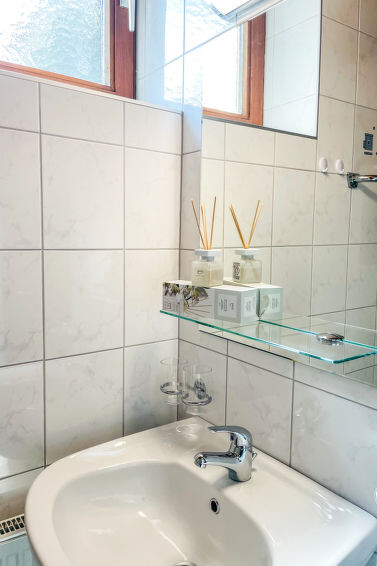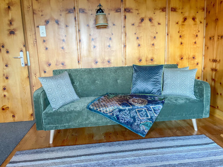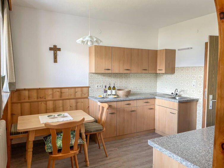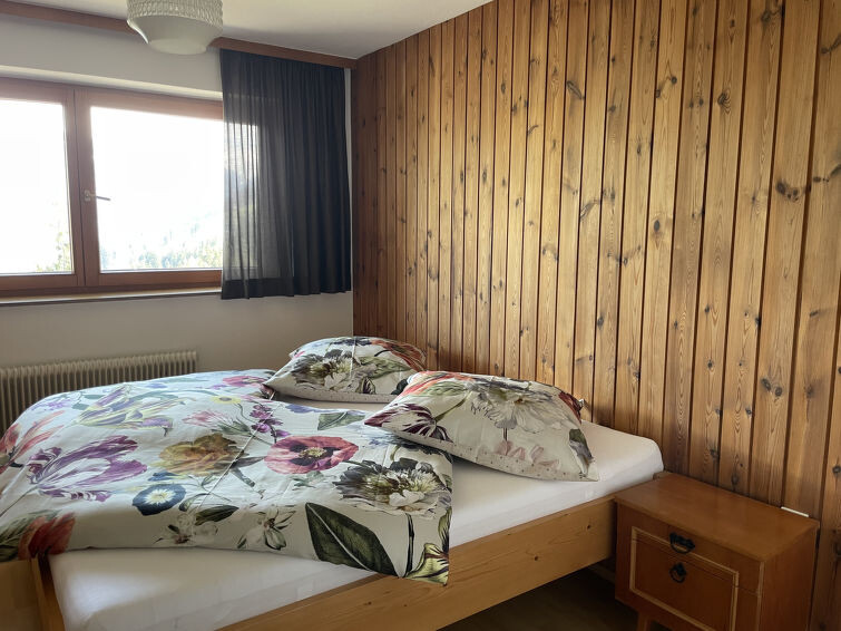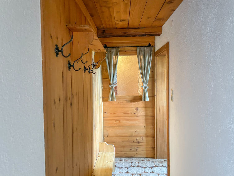 "Häuser II", appartement 2-kamers 60 m2, op de begane grond. Smaakvol en gezellig ingericht: woon-/slaapkamer met 1 divanbed en Sat-TV. 1 2-pers. kamer. Kleine keuken (oven, afwasmachine, 4 keramische glas kookplaten, broodrooster, elektrische koffiemachine) met eethoek. Douche, aparte WC. Houten vloeren. Groot terras. Balkonmeubilair. Mooi panoramazicht op de bergen. Niet rokers woning. Rookmelders.